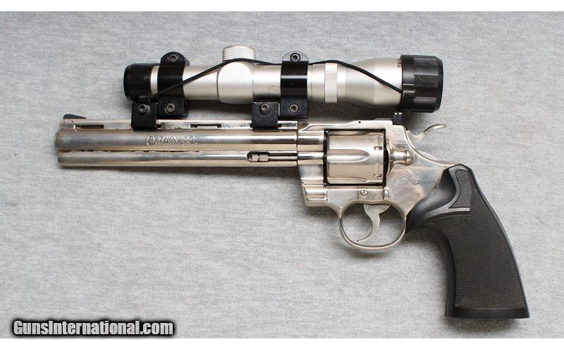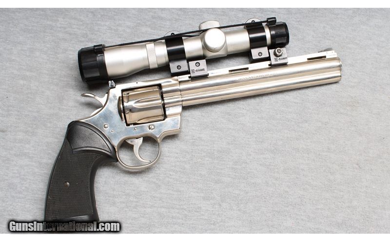 Description: Good condition, some finish wear, nicks and scratches. Classic Colt revolver with 8" ribbed barrel with full underlug, Pachmayr hard rubber grips, adjustable iron sights and Tasco scope installed. .357 Magnum SOLD Chambers: Revolver Metal Condition: Good Bore Condition: Bright Barrels: 8 Triggers: Double and single action Butt Pad: Pachmayr grips Sights: Iron sights and Tasco 2x20 scope Item Location: La Vista, NE |