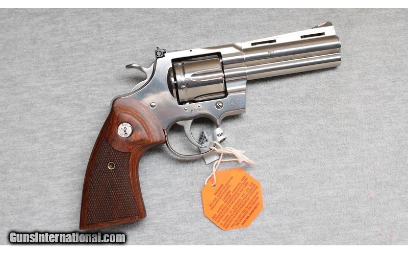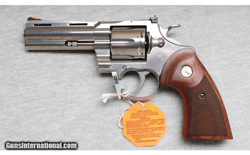 Description: New condition with factory box. The legendary Python double-action revolver returns in stainless steel - The 2021 Python features modern stainless steel alloys and a re-designed rear sight. Thirty percent more steel beneath the rear adjustable target sight gives you a stronger revolver and more robust shooting experience. A recessed target crown, user-interchangeable front sight, and Walnut grip with the iconic Colt medallion. The Python is chambered in .357 Magnum and also accommodates .38 Special cartridges. .357 Magnum SOLD Chambers: Revolver Metal Condition: New Wood Condition: Grips are new Bore Condition: Bright Barrels: 4 1/4 Triggers: Double and single action Butt Pad: Factory wood grips Sights: Adjustable Item Location: La Vista, NE |