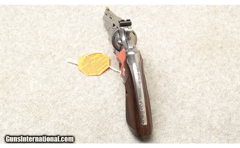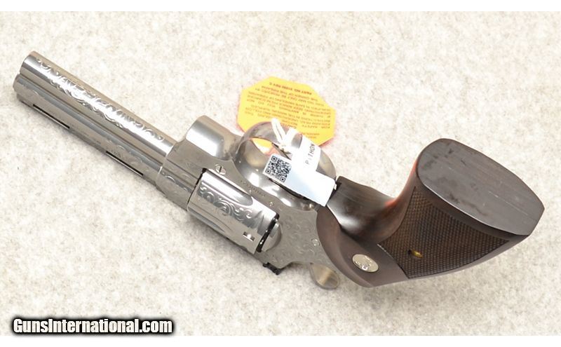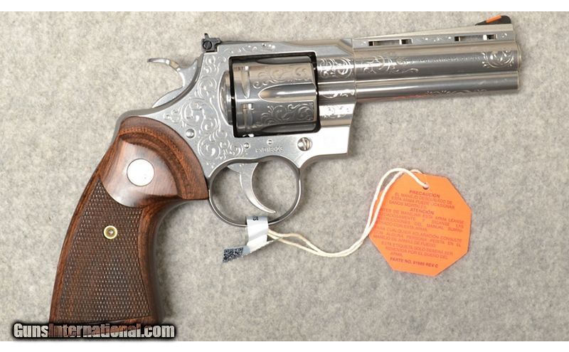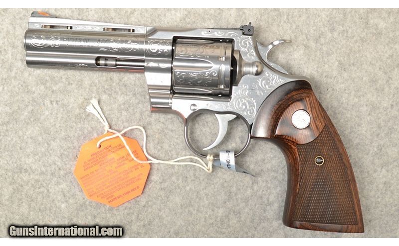 Description: This Colt Python is in excellent condition and will make a great addition to your collection. The stainless steel frame, cylinder, and barrel are all engraved and give this revolver a very classy look. The wood grips are very comfortable and give you a little bit of a higher grip which will help mitigate recoil. The action is very smooth and is followed by a light crisp trigger break. .357 Magnum SOLD Chambers: .357 Magnum Metal Condition: Excellent Wood Condition: Excellent Bore Condition: Excellent Barrels: "Rifled, 4"" Weight: 2 lbs Sights: Front and rear iron sight Item Location: Columbus, OH |