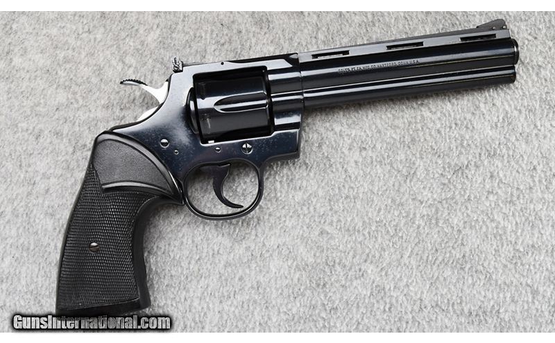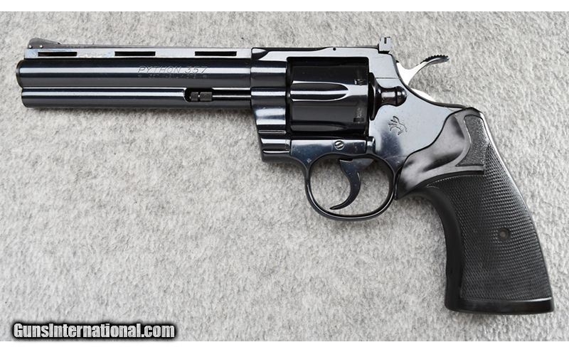 Description: This Colt Python is in overall excellent condition. It features a 6" vent rib barrel. Gun shows little use with a slight cylinder ring. No box. .357 Mag SOLD Metal Condition: Excellent Bore Condition: Excellent Barrels: 6" Vent Rib Triggers: Factory Butt Pad: Pachmayr Black Rubber Grips Weight: 48 oz. Sights: Ramp Front - Adjustable Square Notch Rear Item Location: Wheeling |
