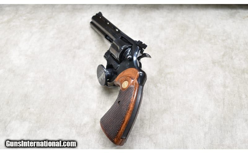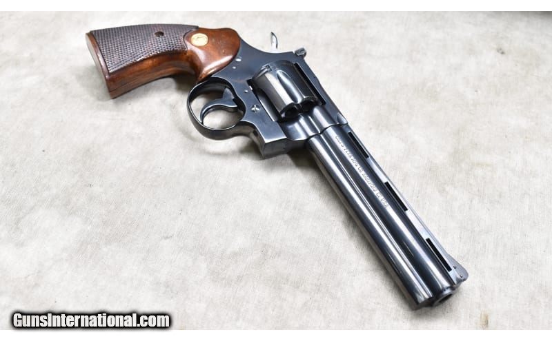 Description: This Python dates to 1966 and is in Very good condition. It appears to have been fired very little if at all and the stampings are all sharp and clear. The grips have sharp checkering and the only real defects appear as a tiny handling marks around the lower edge of the grips and a little holster wear near the muzzle. .357 Magnum SOLD Chambers: 6 Metal Condition: "Very good to excellent. Very slight turn line, little to no residue on the cylinder face, a small amount of holster wear. Wood Condition: "Very good to excellent. Checkering is sharp, a few handling marks along the lower edge. Bore Condition: Shiny and bright. Barrels: 6-inch Triggers: Factory single and double action. Butt Pad: Checkered walnut with Colt medallions. Weight: 39 oz Sights: Serrated ramp and adjustable notch Item Location: Rogers |