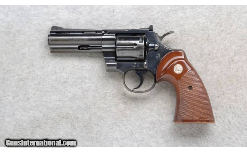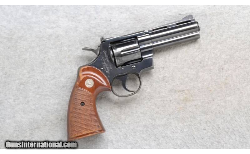 Description: This Colt Model Python is a 6 shot double action revolver in .357 Magnum Cal. It has a 4 inch barrel. A blade front sight and an adjustable notch rear sight. The grip is a checkered hardwood with silver Colt horse logo medallions. Manufactured 1961. The right side of the frame is engraved Andrew Singletary 2944. .357 Magnum SOLD Chambers: 6 shot. Metal Condition: Good. Shows some use and wear. Wood Condition: Good. Has some wear areas. Bore Condition: Excellent. Barrels: 4 inch barrel with a ventilated rib. Triggers: SA/DA Weight: 38 oz. Sights: Blade front. Adjustable notch rear. Item Location: Richfield, WI |
