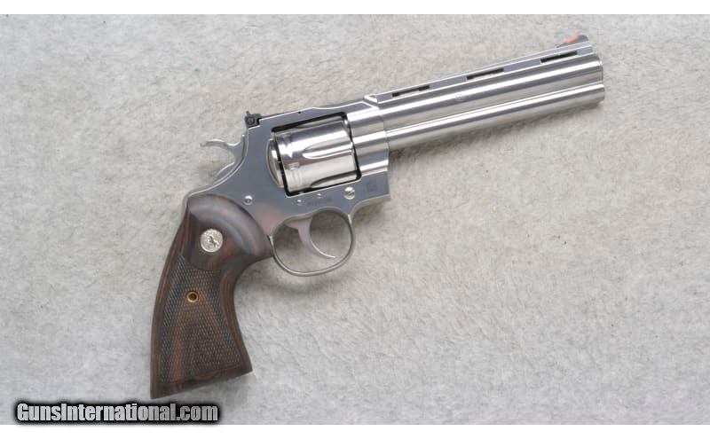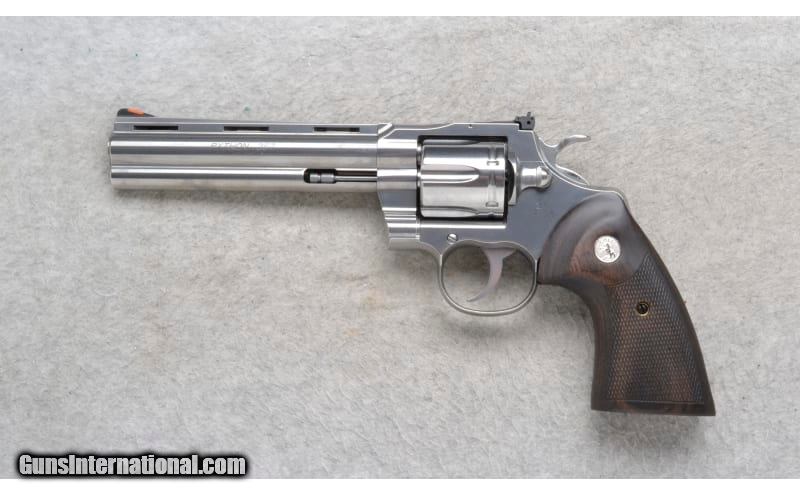 Description: This Colt Model Python is a 6 shot stainless steel double action revolver in .357 Magnum Cal. It has a 6 inch ventilated rib barrel. A raised blade front sight with red and an adjustable notch rear sight. The grip is a checkered hardwood with silver Colt horse logo medallions. .357 Magnum SOLD Chambers: 6 shot. Metal Condition: Excellent. Wood Condition: Excellent. Bore Condition: Excellent. Barrels: 6 inch barrel with a ventilated rib. Triggers: SA/DA Weight: 48 oz. Sights: Raised blade front with red. Adjustable notch rear. Item Location: Richfield, WI |