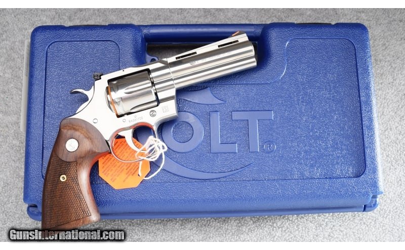 Description: This modern Colt Python remains in excellent overall condition showing little to no use. Complete with original Colt plastic case, manual and lock. Beautiful gun! .357 Mag SOLD Metal Condition: Excellent Wood Condition: Excellent Bore Condition: Excellent Barrels: 4 1/4" Vent Rib Triggers: Factory - Double Action Butt Pad: Checkered Walnut Grips with Colt Medallion Weight: 48 oz. Sights: Serrated Ramp Front with Red Insert - Adjustable Square Notch Rear Item Location: Wheeling |