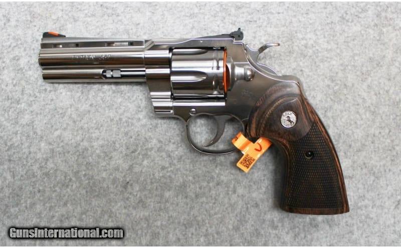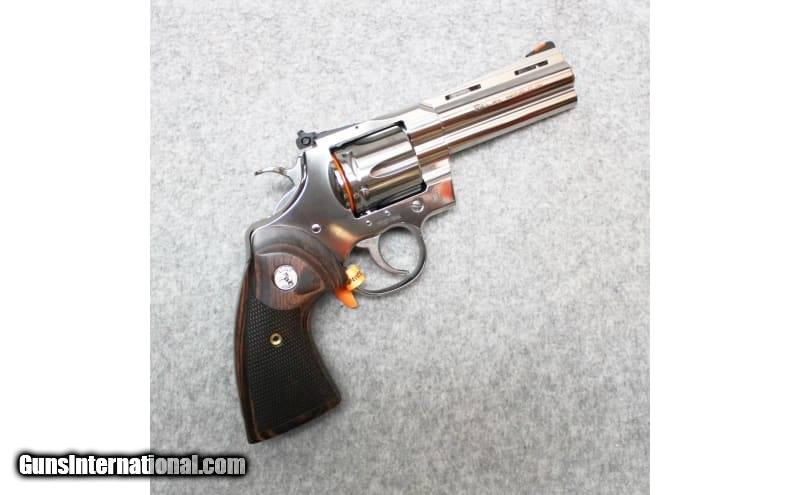 Description: Colt Python stainless steel revolver chambered in .357 Magnum. It is double action with a 4.25" vent rib barrel. The front sight has an orange insert and the rear sight is black adjustable with a u-notch. .357 Magnum SOLD Metal Condition: Very Good with Minor Handling Marks Wood Condition: Factory Checkered Wood Grips with Colt Medallion: Very Good Bore Condition: Bright And Clear Barrels: 4.25 inch Triggers: Double Action Weight: 42 oz Sights: Front: Orange Insert Ramp / Rear: Black Adjustable U-Notch Item Location: Allen, TX |