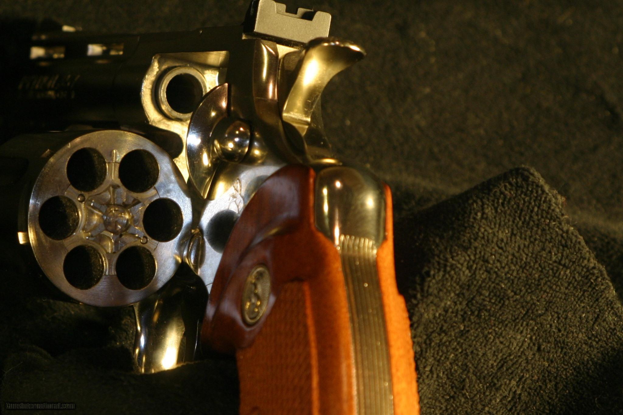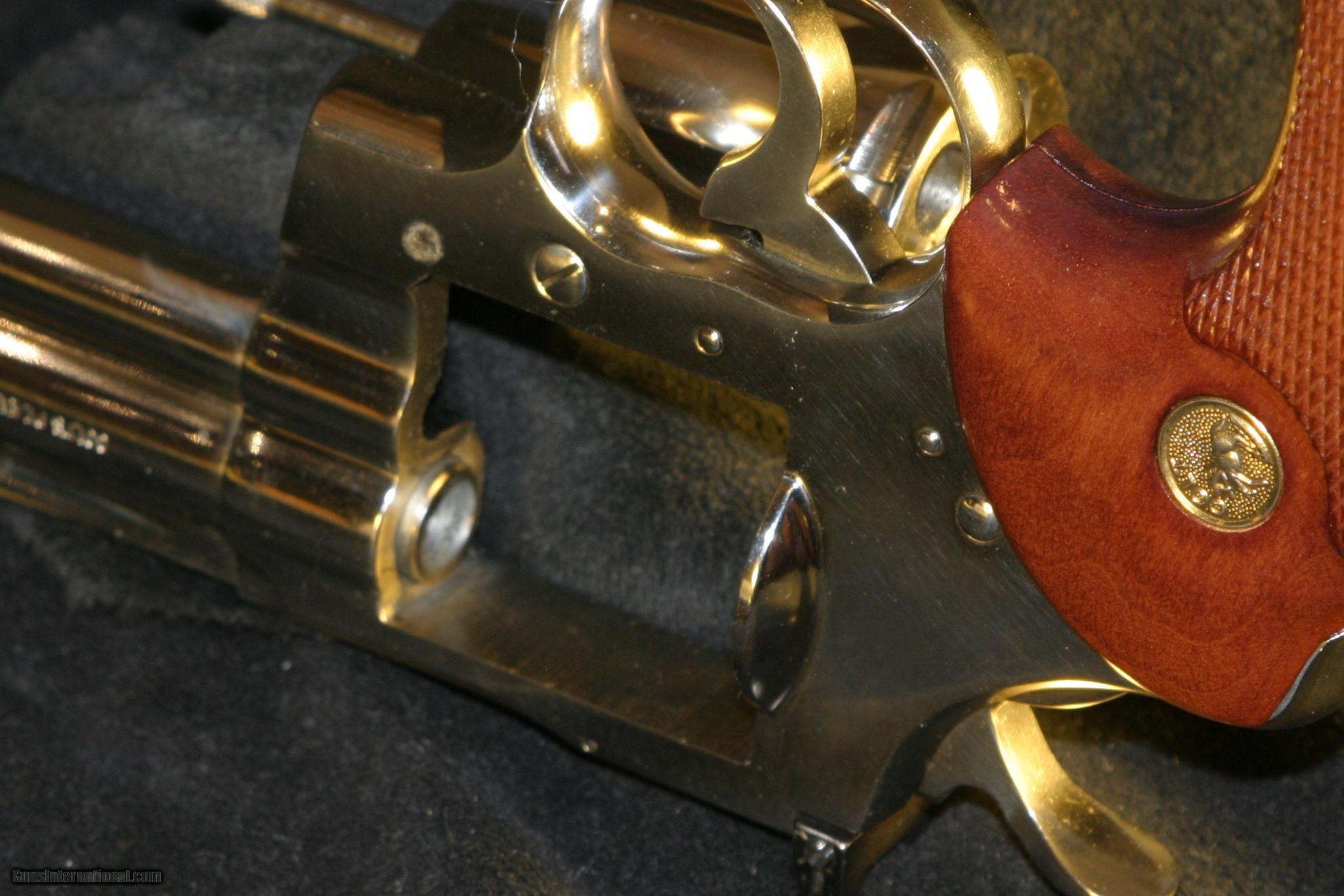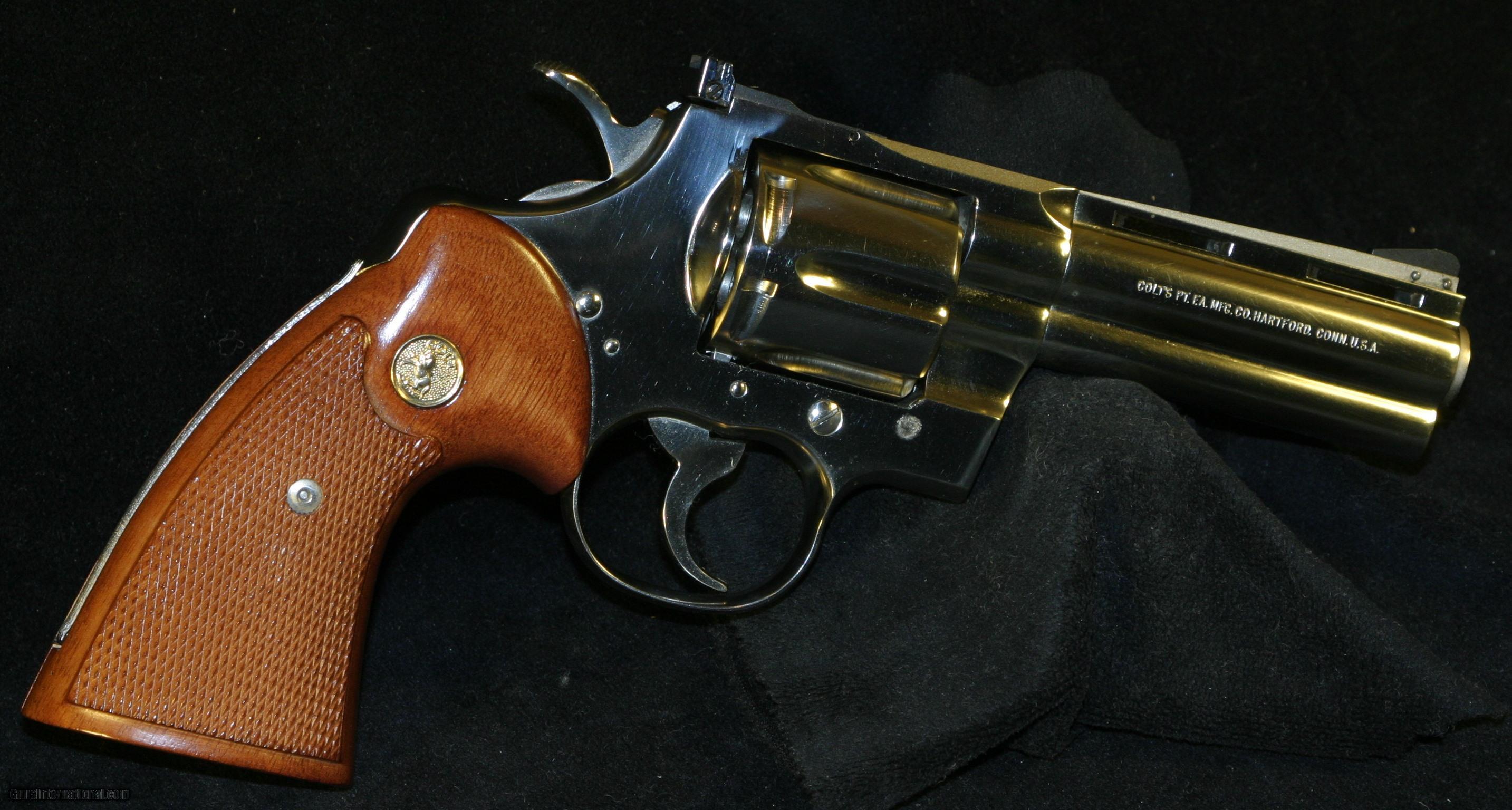 Description: A FOUR INCH IN NICKLE, .357 MAG PYTHON.SMOOTH ACTION, THIS ONE GET A 90% RATING DUE TO A "SPOT" IN THE NICKLE ON THE RIGHT SIDE, AS SEEN IN PHOTO. A VERY NICE GUN AT A GOOD PRICE! NO BOX OR PAPERS 1972 SOLD |