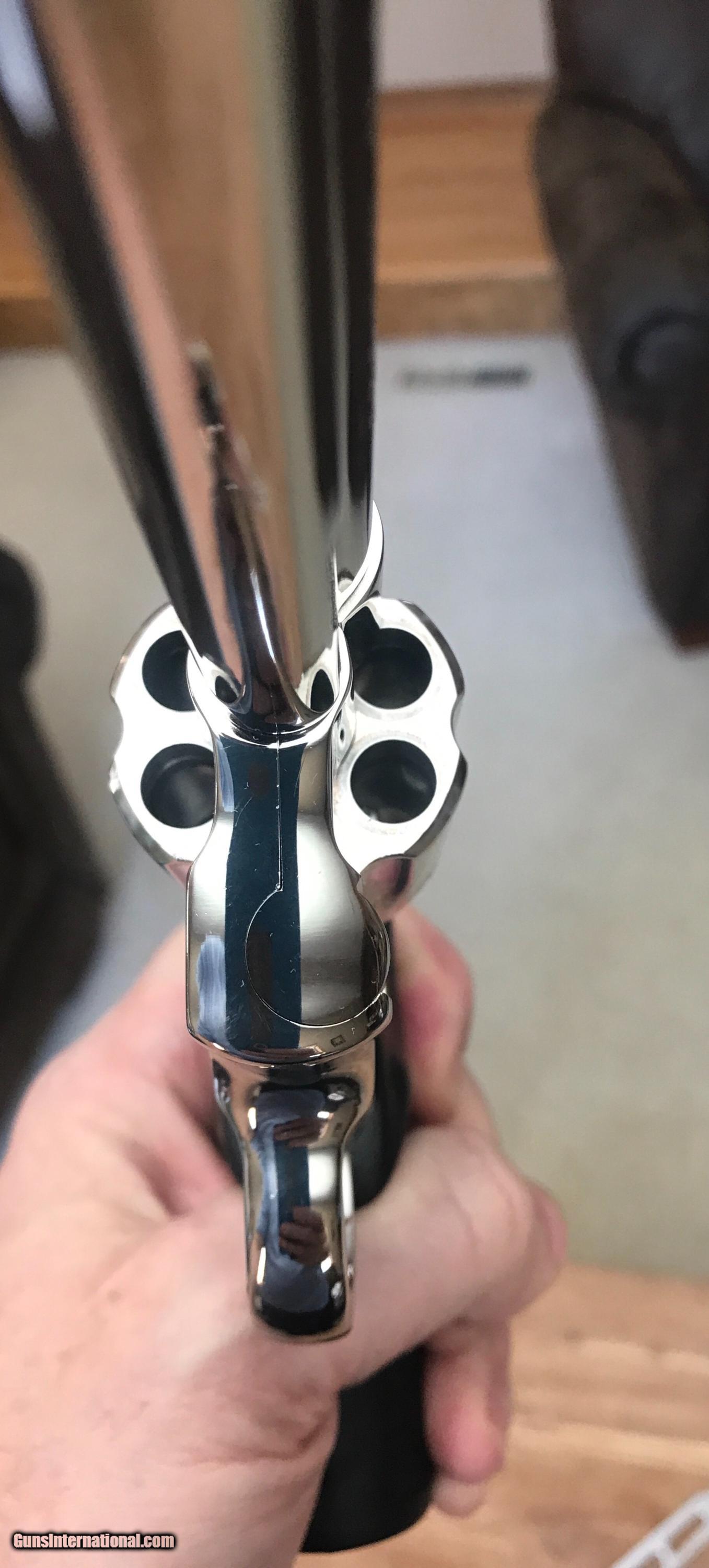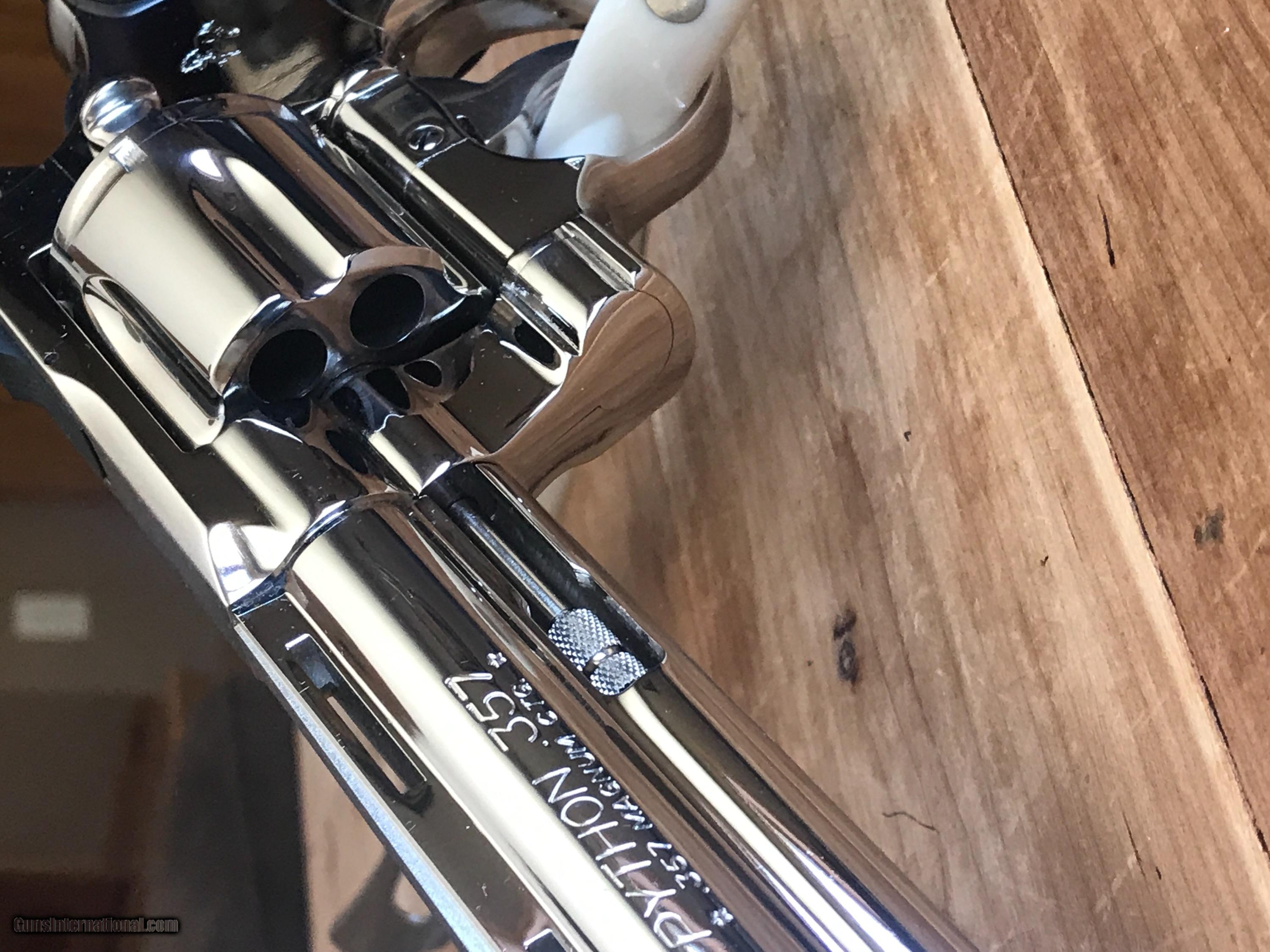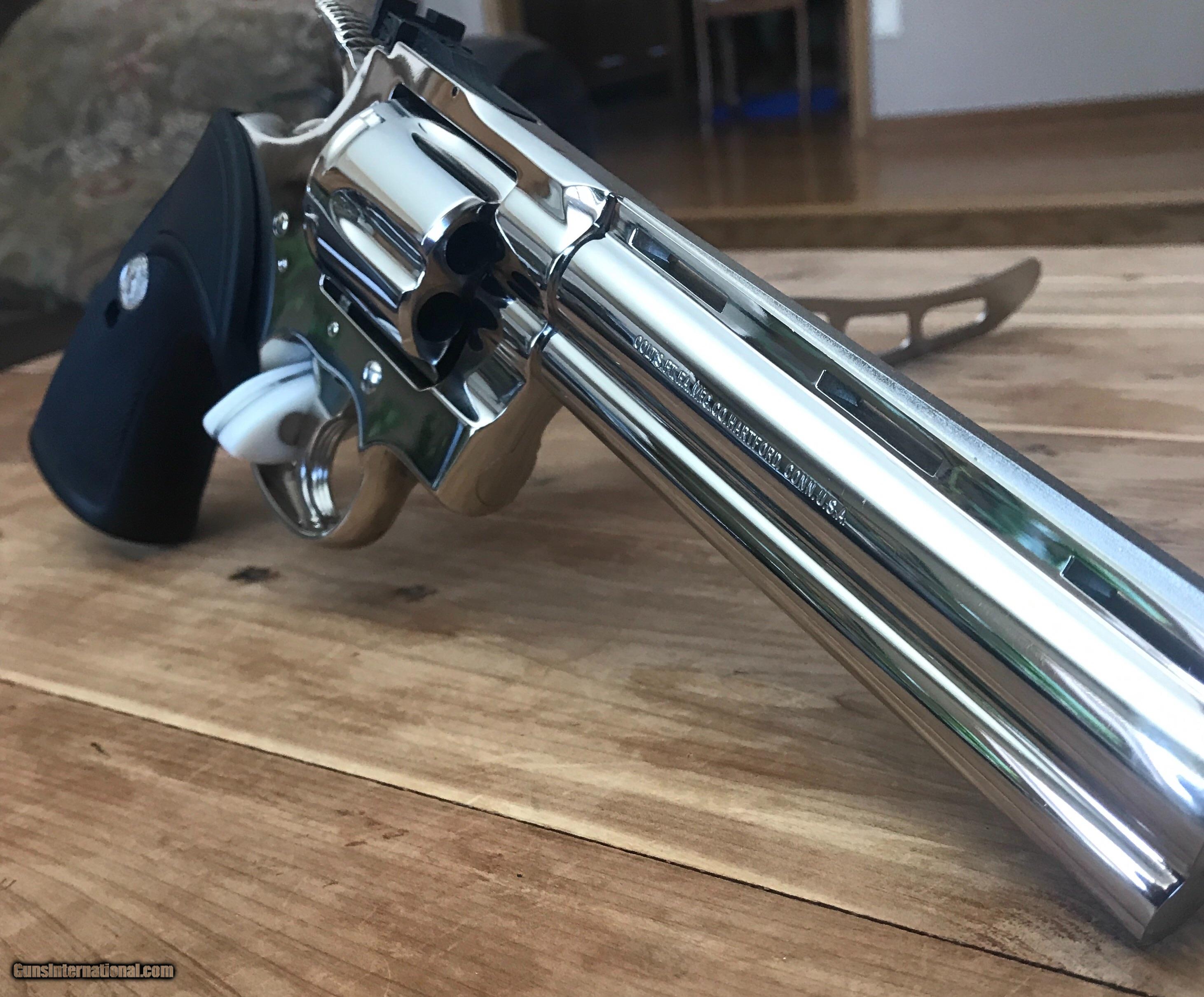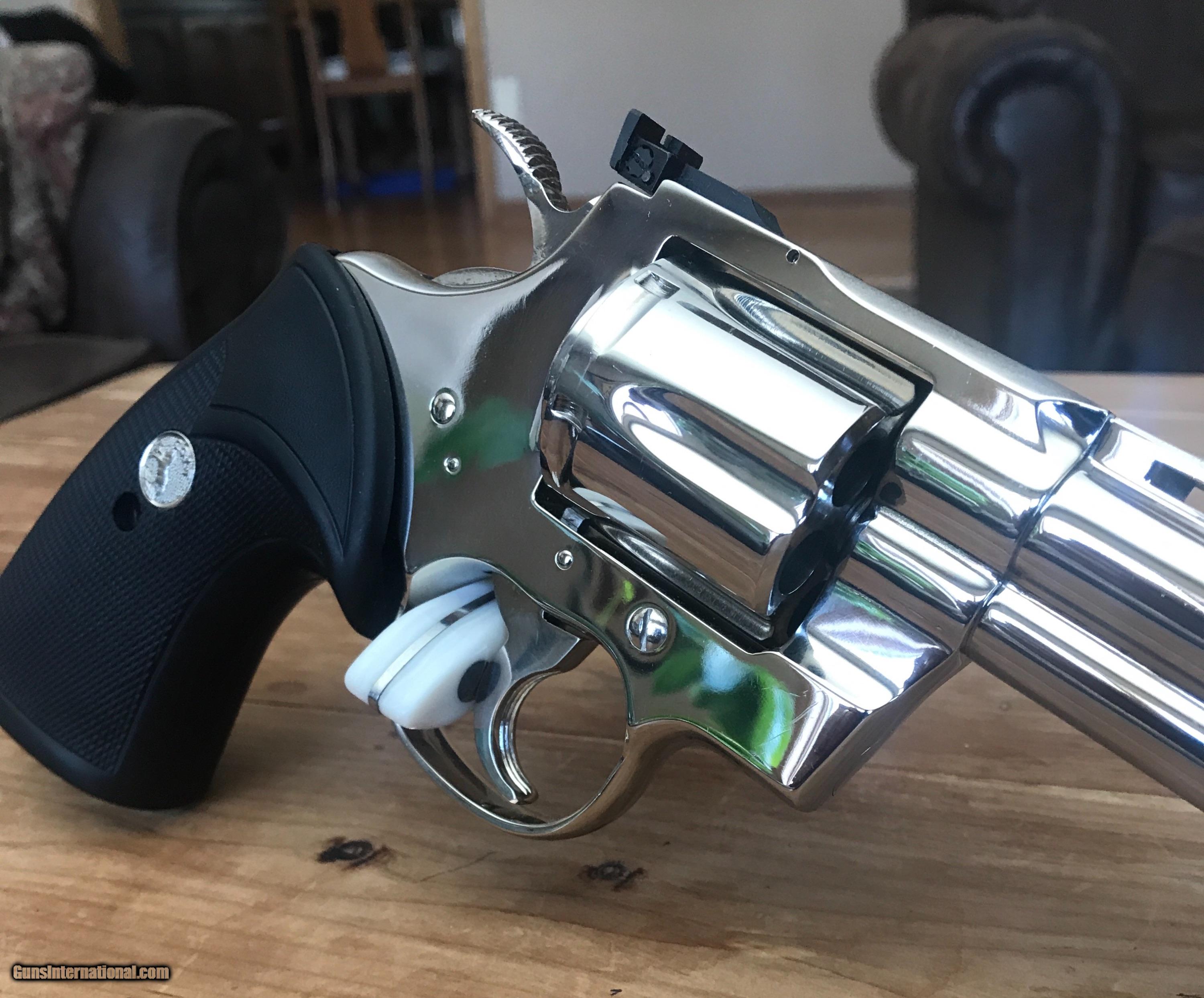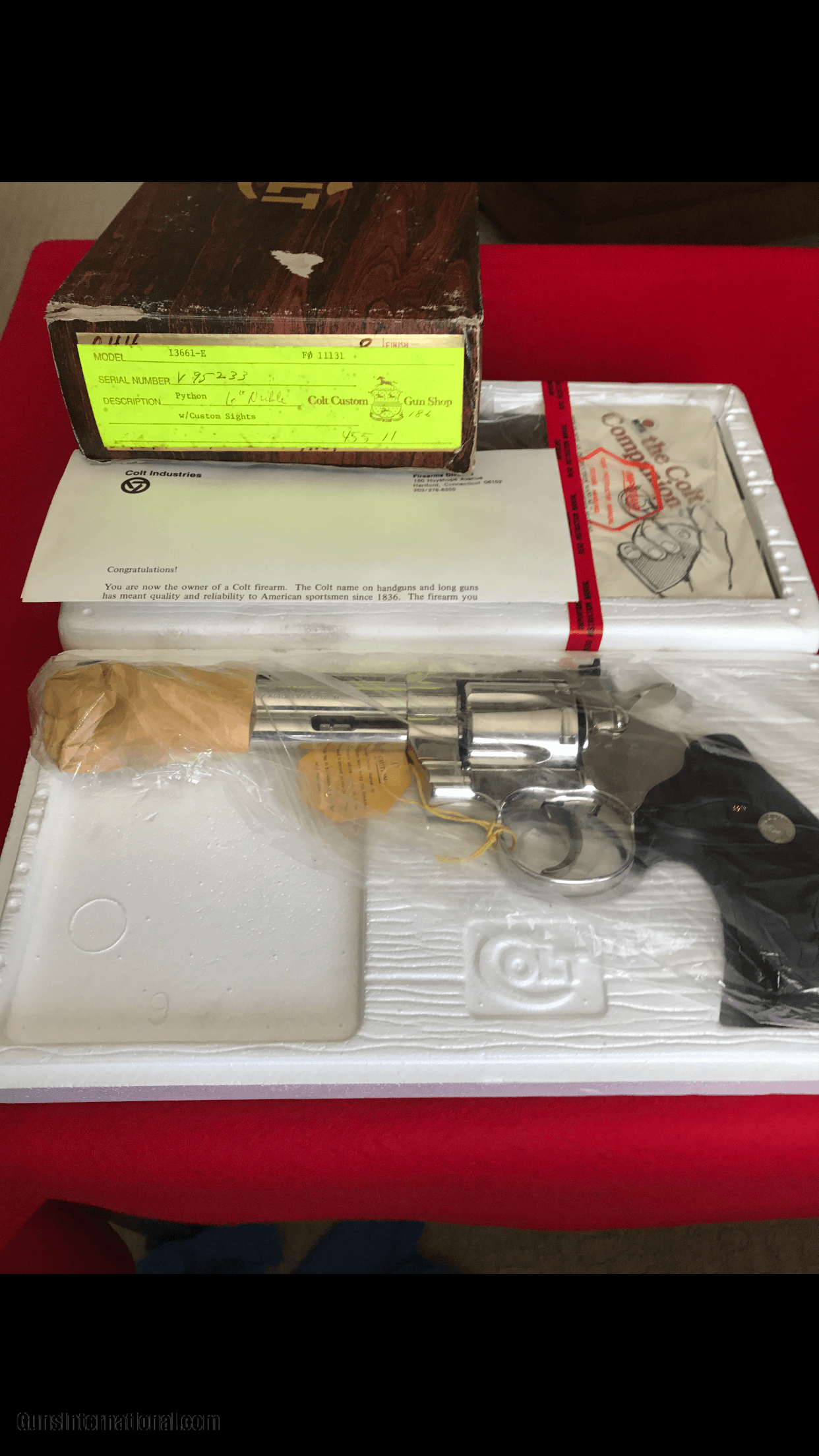 Description: "WE NEED INVENTORY. WE BUY, TRADE AND CONSIGN QUALITY FIREARMS" This is a Custom Shop Python with the Eliason rear sight and the 1/2 Partridge front sight. I believe the action was tuned before leaving the factory as well The gun has been quire but remains in very nice condition. Butter smooth action with a very light trigger pull. The gun comes with the Original Colt box with the Custom Shop label, hang tag and all the paperwork. A very attractive 6 inch, nickel finish, Colt Python! Buyer pays $40 insured shipping to FFL. 2,895 or best offer SOLD |