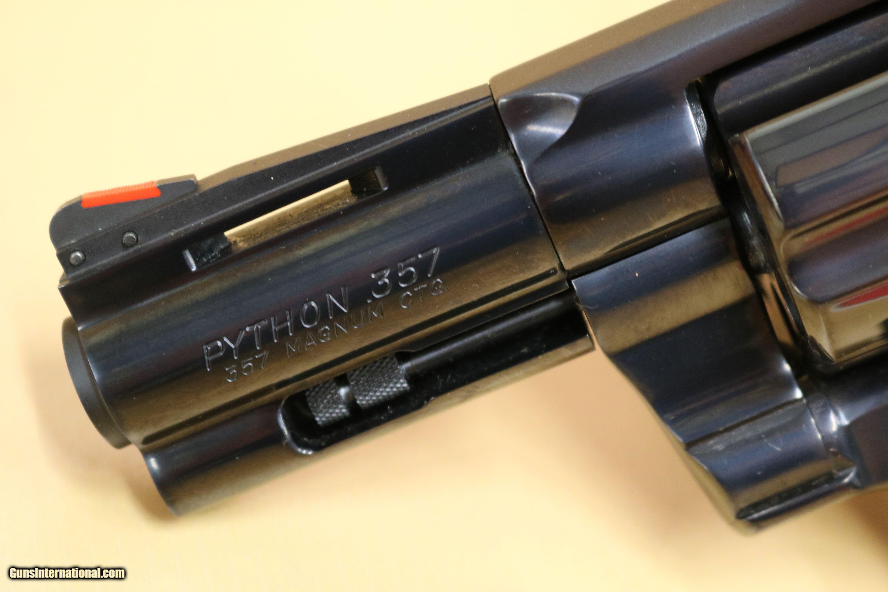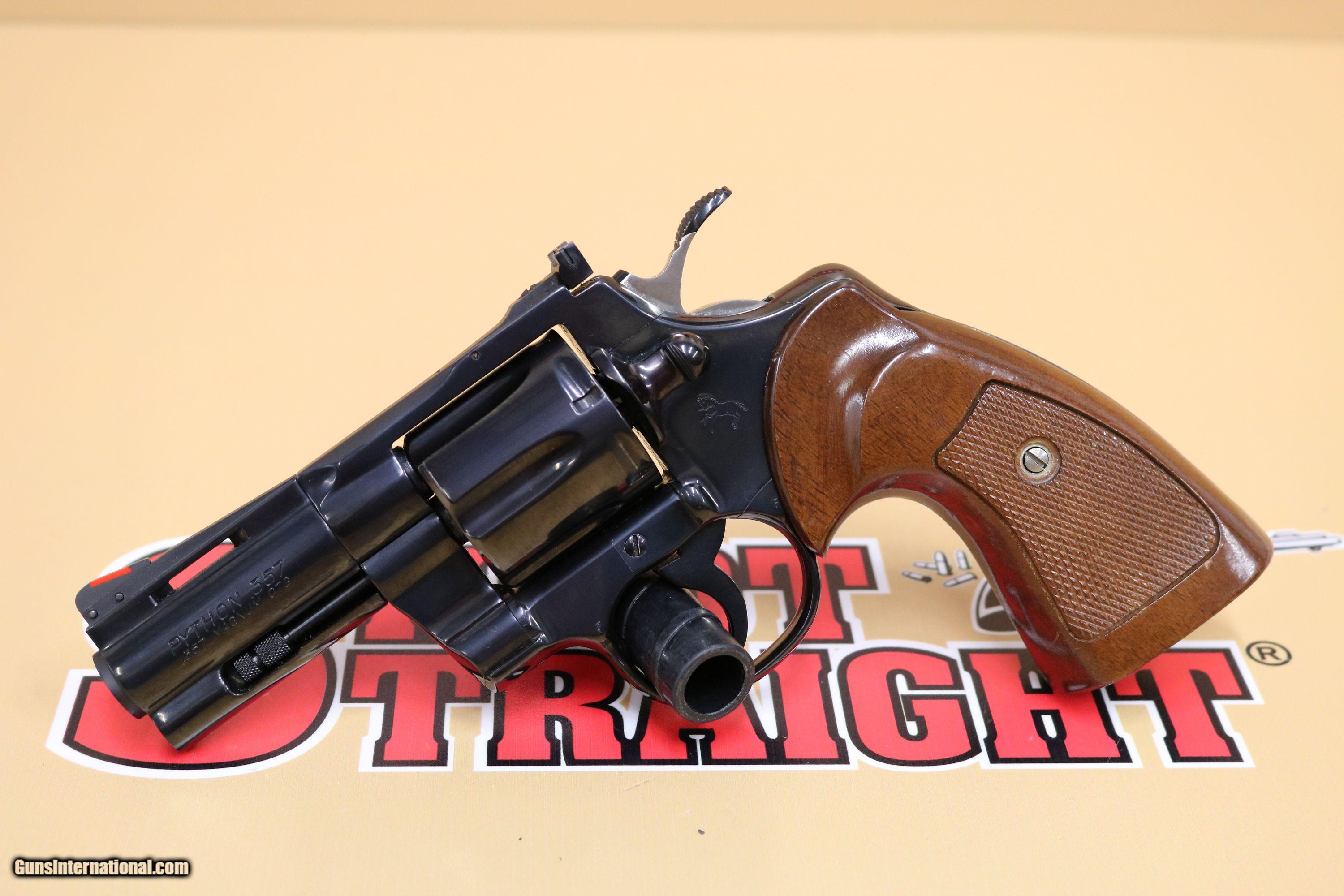 Description: Well here it is folks, it doesn't get much better than this! We are proud to present the Holy Grail of all Snake guns! The EXTREMELY RARE Colt Python chambered in 357MAG with a 3" barrel (you read right!). This is without a doubt an authentic factory 3" Python; not a cut-down or re-barrel! Pre-owned and in exceptional shape! The only two, tiny, blemishes we can find are very, very minor. One is found on the right side of the barrel near the muzzle (as shown in pictures). The other is on the right side of the frame, above the trigger, near the cylinder (as shown in pictures). Other than that, this revolver only has a few, very light signs of general handling. All things considered this particular wheel gun is still in MINT condition; easily 99% overall. Cylinder lock-up is nice and tight! For reference sake, the serial number is: K05824. Comes with the original box and paperwork! Probably the most sought after Python on the list, DO NOT let this one pass you by! Please look at the pictures for details. SOLD Manufacturer: Colt Model: Python Serial Number: K05824 Caliber Info: .357MAG Condition: Pre-Owned |