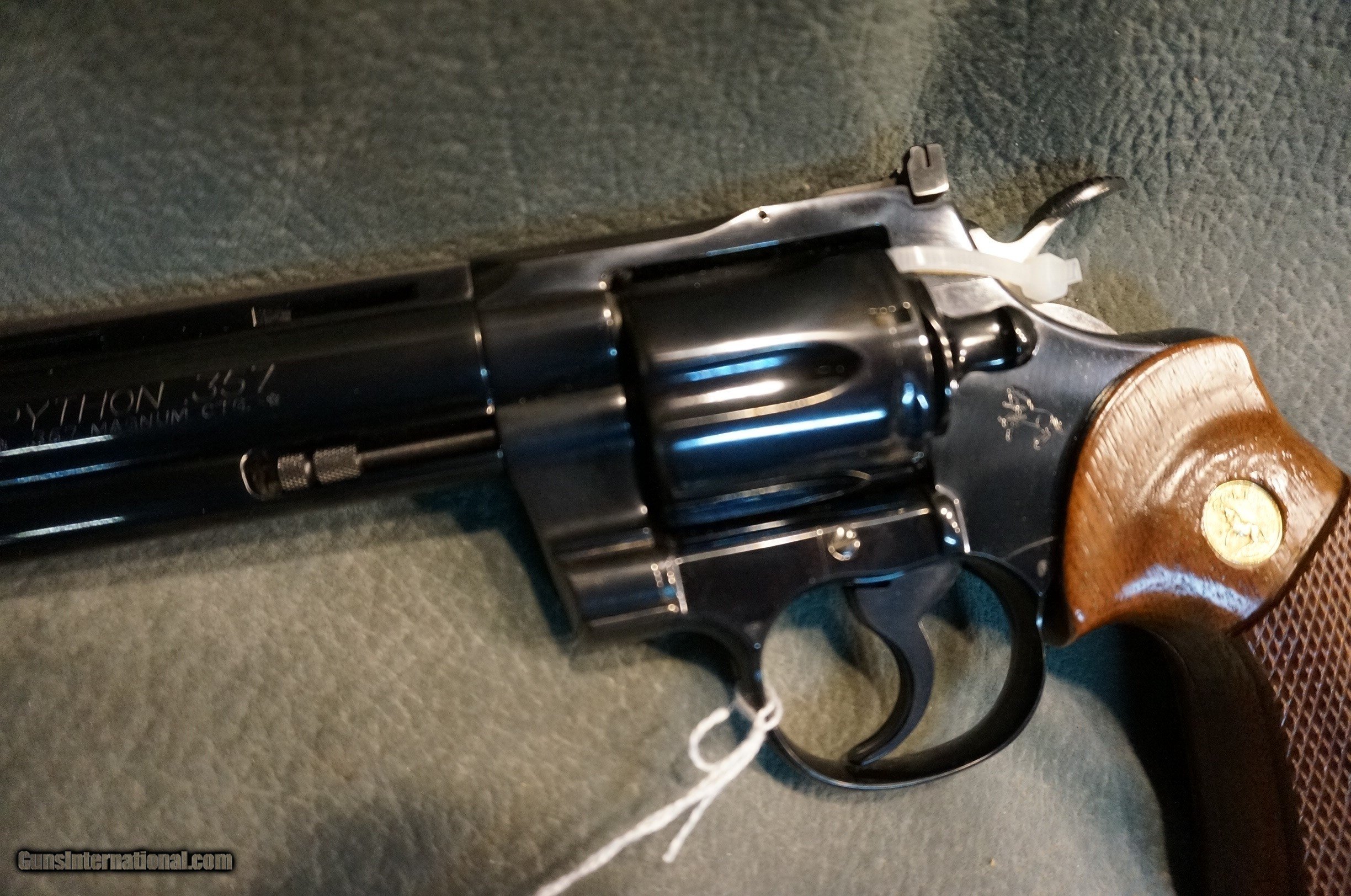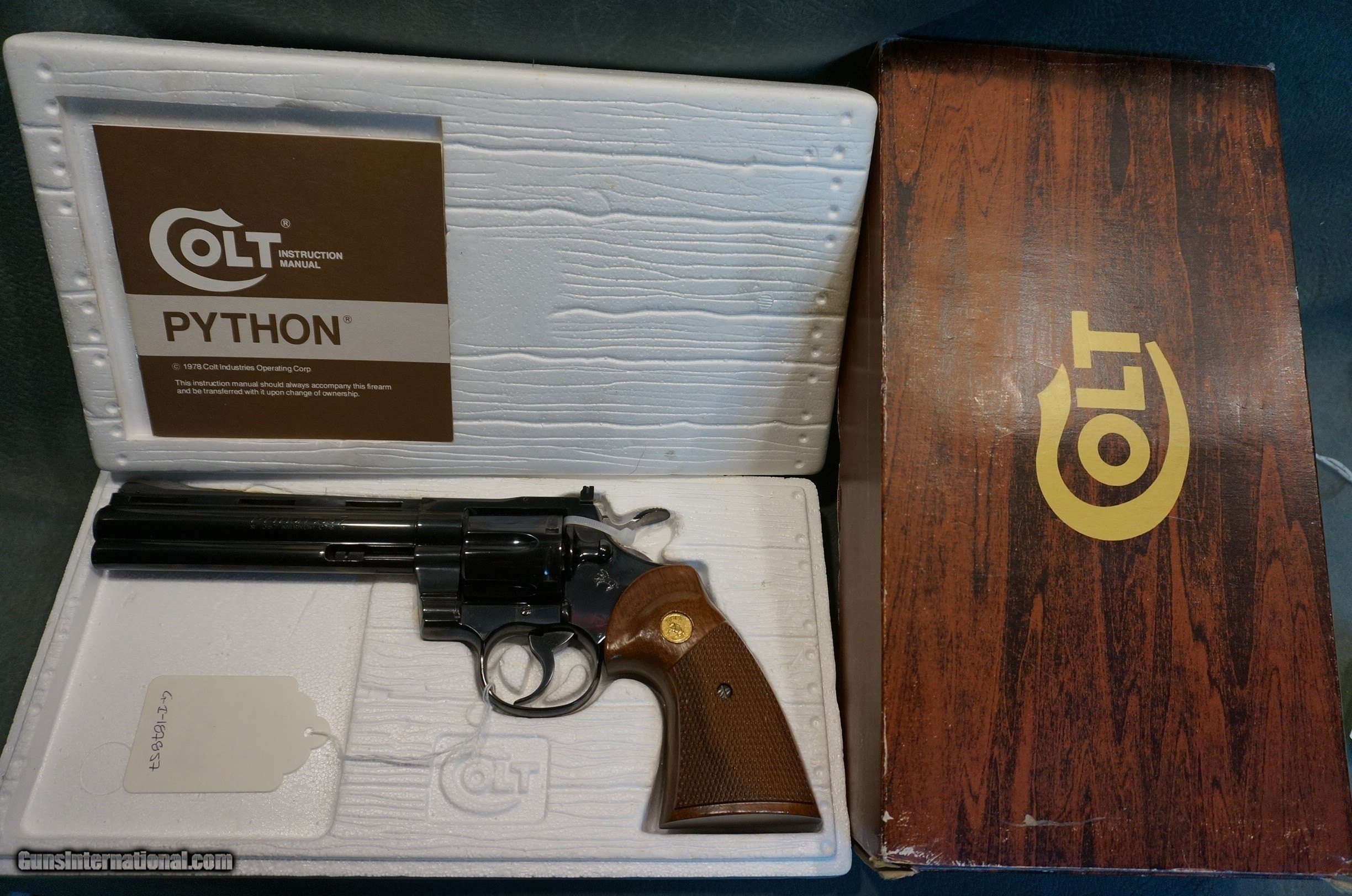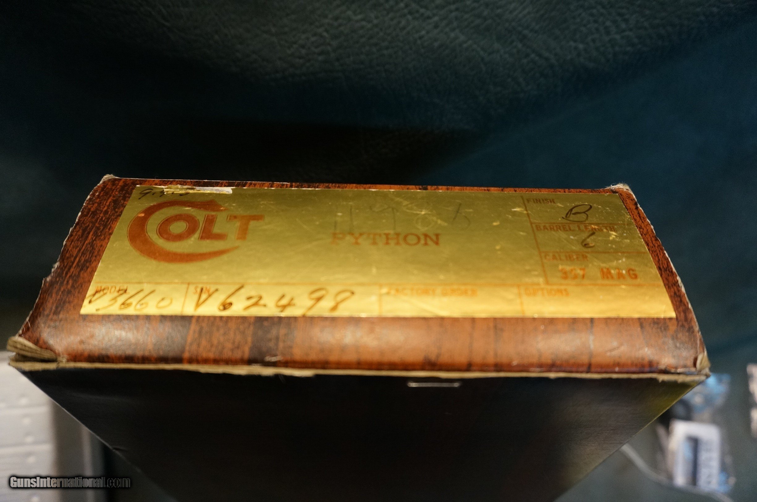 Description: Colt Python 357Mag 6" barrel,serial # V62498,made in 1979,as new in the box with manual. We buy, sell, consign and trade new and used firearms. This is our 43rd year in business. We offer 90 day layaways with 20% down. No return on layaways. Firearms will need to be transferred through a FFL dealer. Prices reflect a cash discount. There will be 3% added to credit card sales. We trade for gold and silver. Gun collections wanted for cash. THANK YOU! SOLD |