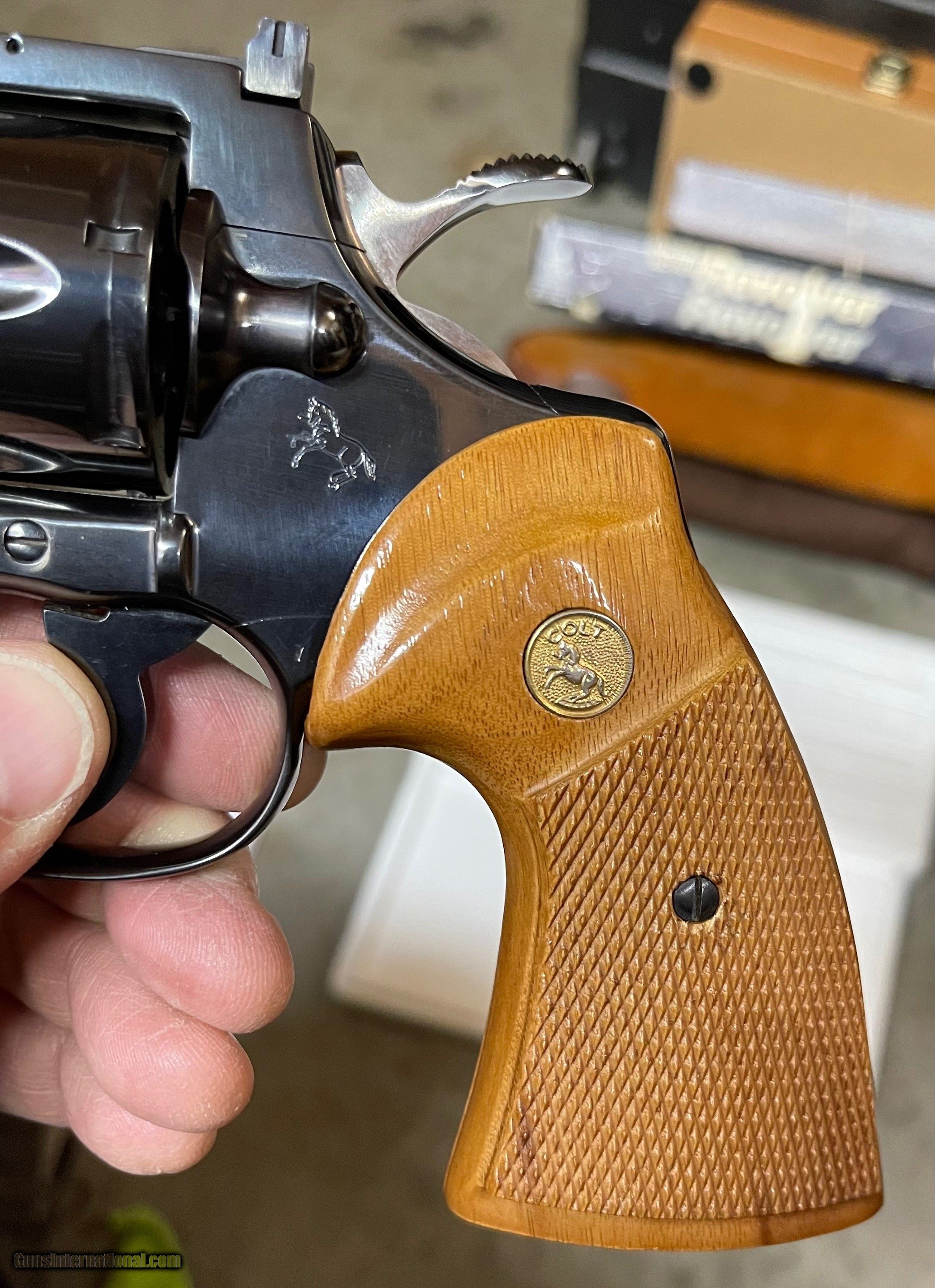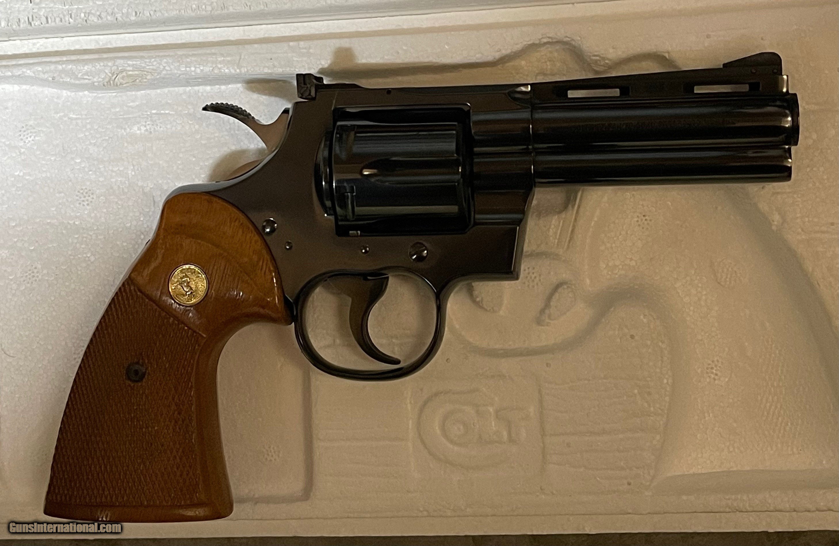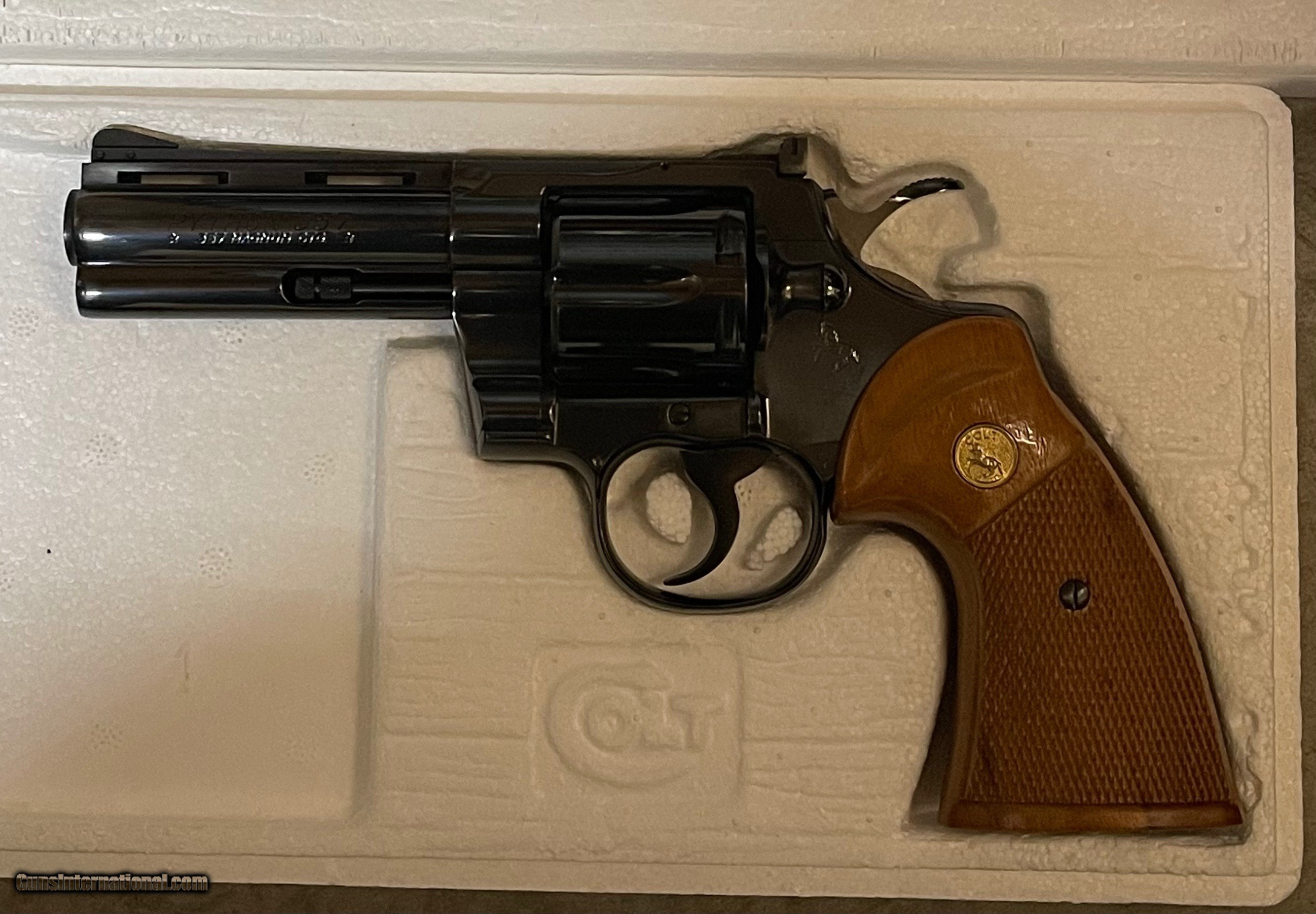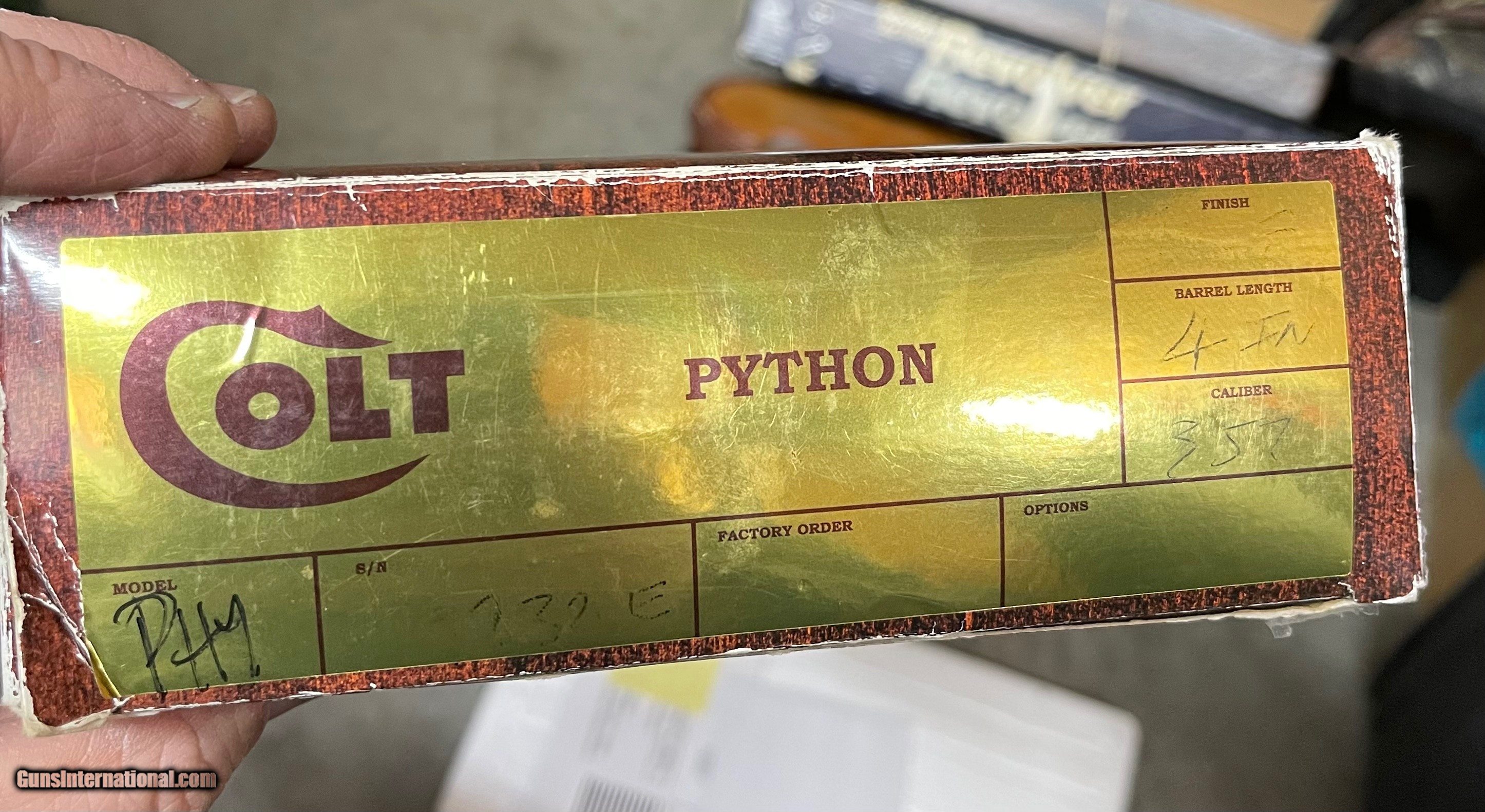 Description: This is one beautiful python! 4 inch barrel, blue finish, gorgeous light colored target grips, target sights. Light turn line. Gun has a box but its not original to the gun. Very little to no wear on this piece. Please email with questions. Shipping and insurance included (west coast add $75). Venmo and cash app accepted. SOLD Manufacturer: Colt Model: Python Barrel Length: 4 inch Condition: Used Metal Condition: Excellent Wood Condition: Excellent Bore Condition: Excellent Action: Da, sa Rib: Ventilated Sights: Target Manufacture Date: 1981 Item Location: 37075 |