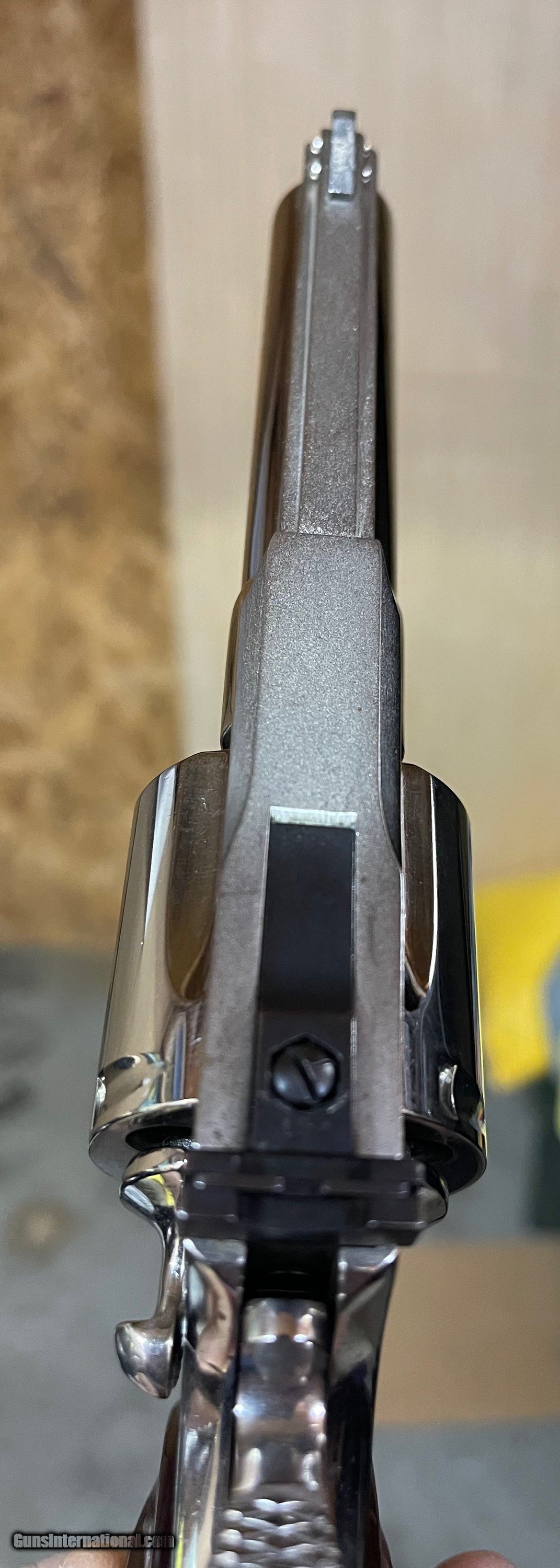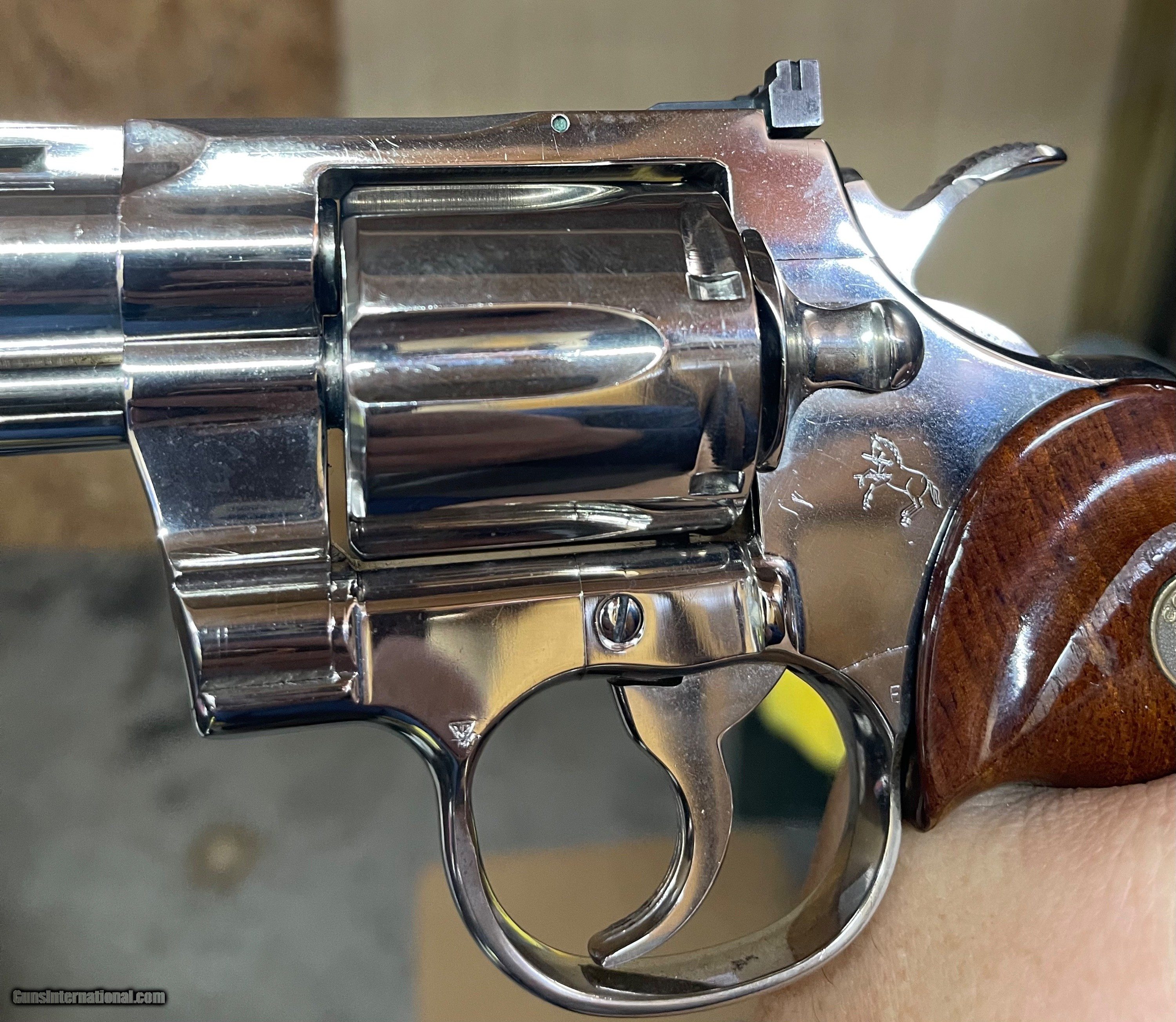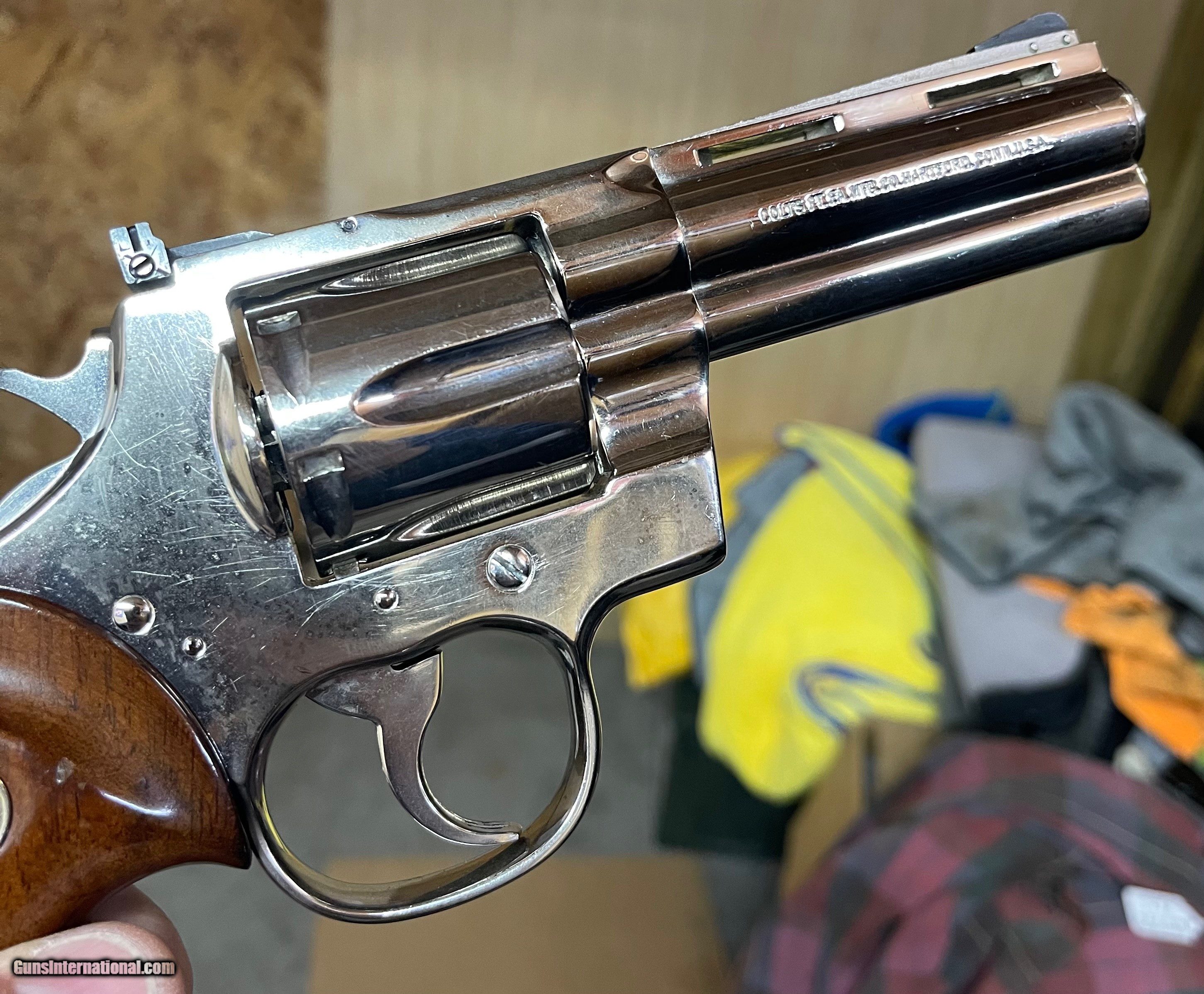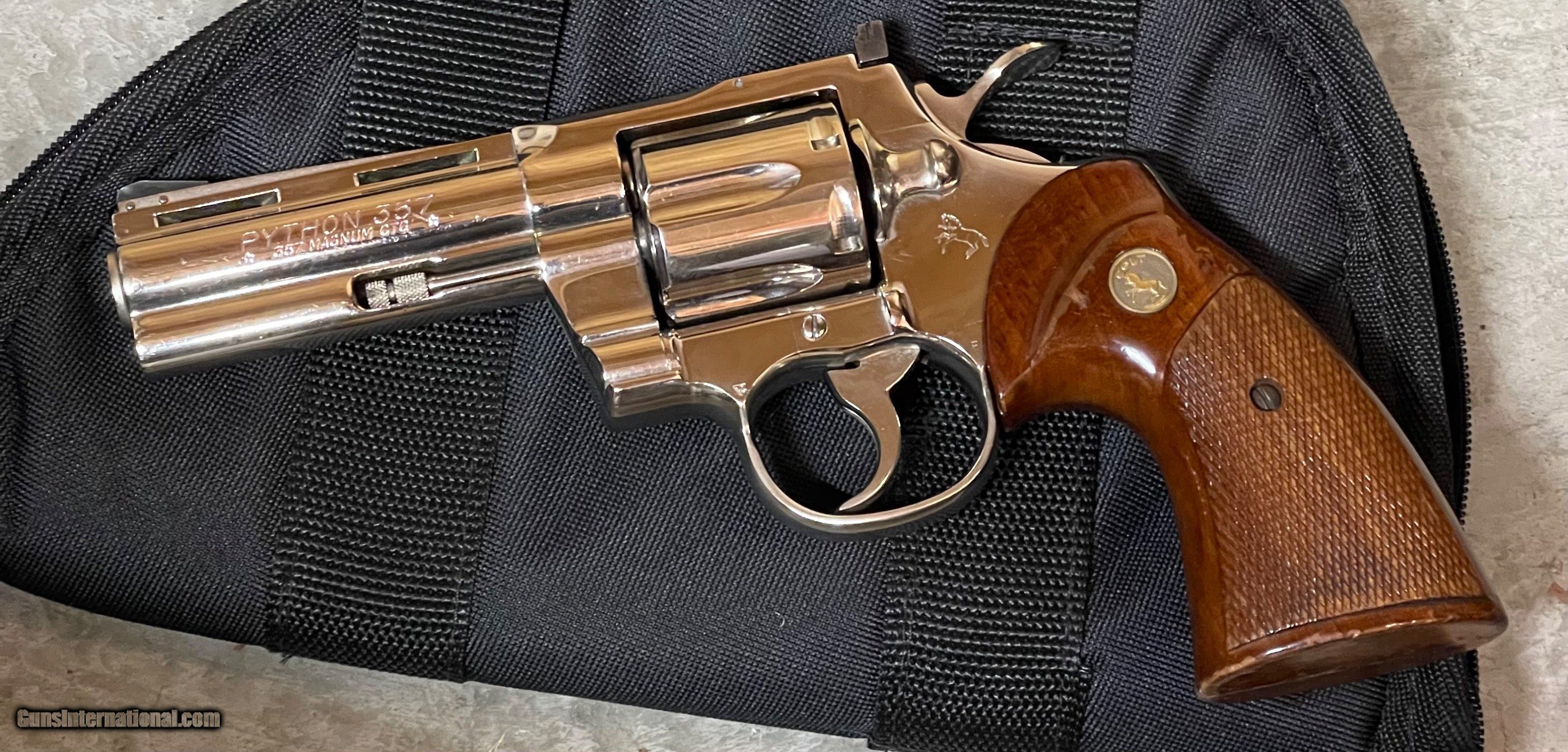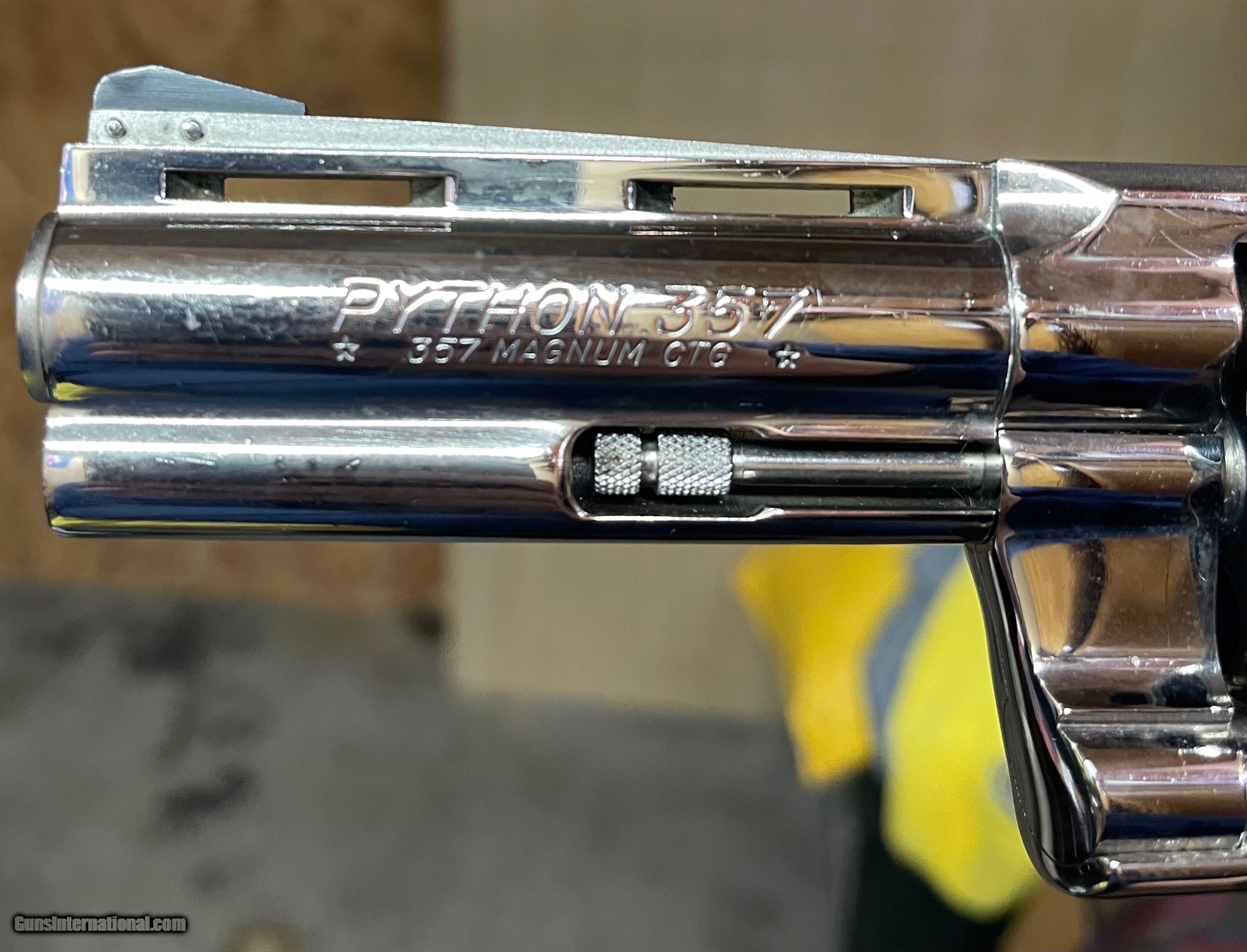 Description: This python has had a rough life. I am representing it as a "shooter". Please examine photos carefully. First, 4 inch ventilated rib barrel, nickel finish, target sights, and grips. The gun shows significant wear. Some light clouding. Many pecks and thin scratches on the right side frame. Some nickel loss in the lettering and edge of the frame around the cylinder. However, it locks up tight and functions properly. No box. Please email with questions. Shipping and insurance included (west coast add $75). Popular payment apps accepted. SOLD Manufacturer: Colt Model: Python Barrel Length: 4 inch Condition: Used Metal Condition: Poor Wood Condition: Good Bore Condition: Excellent Action: Da, sa Rib: Yes Finish: Nickel Sights: Target Manufacture Date: 1980 Item Location: 37075 |