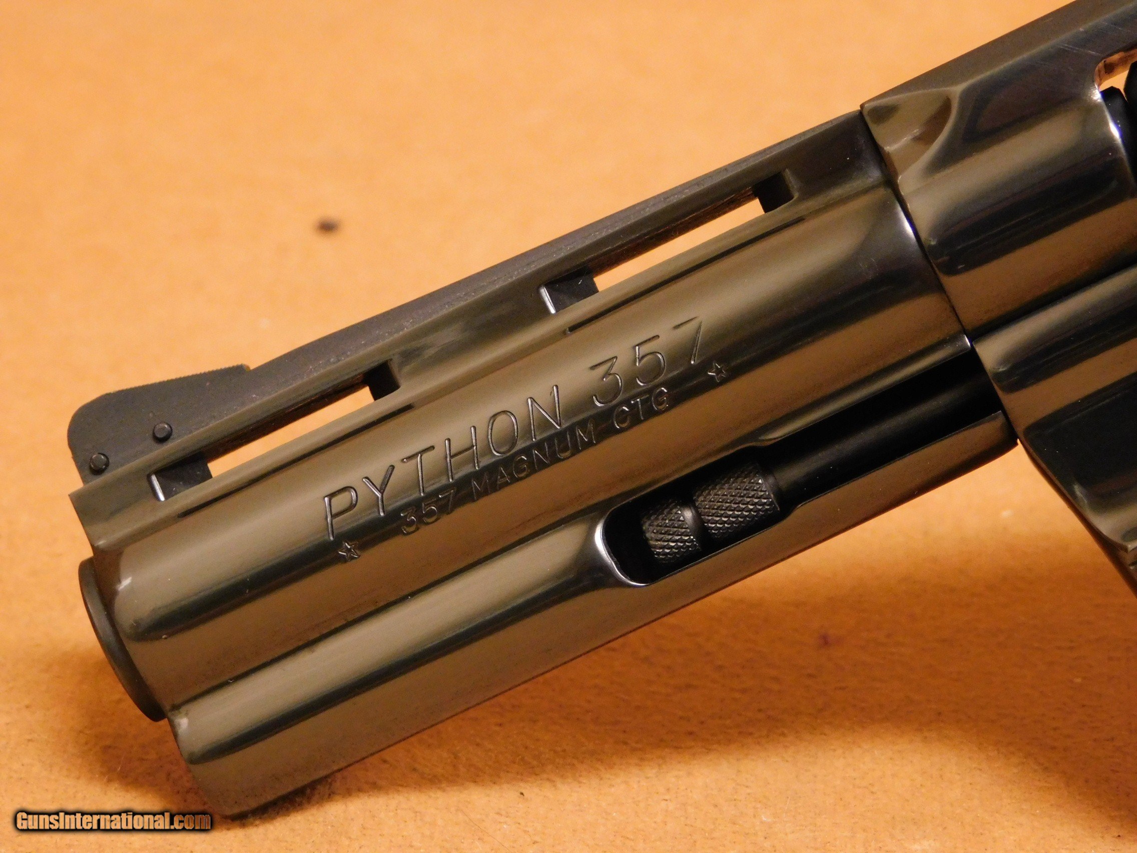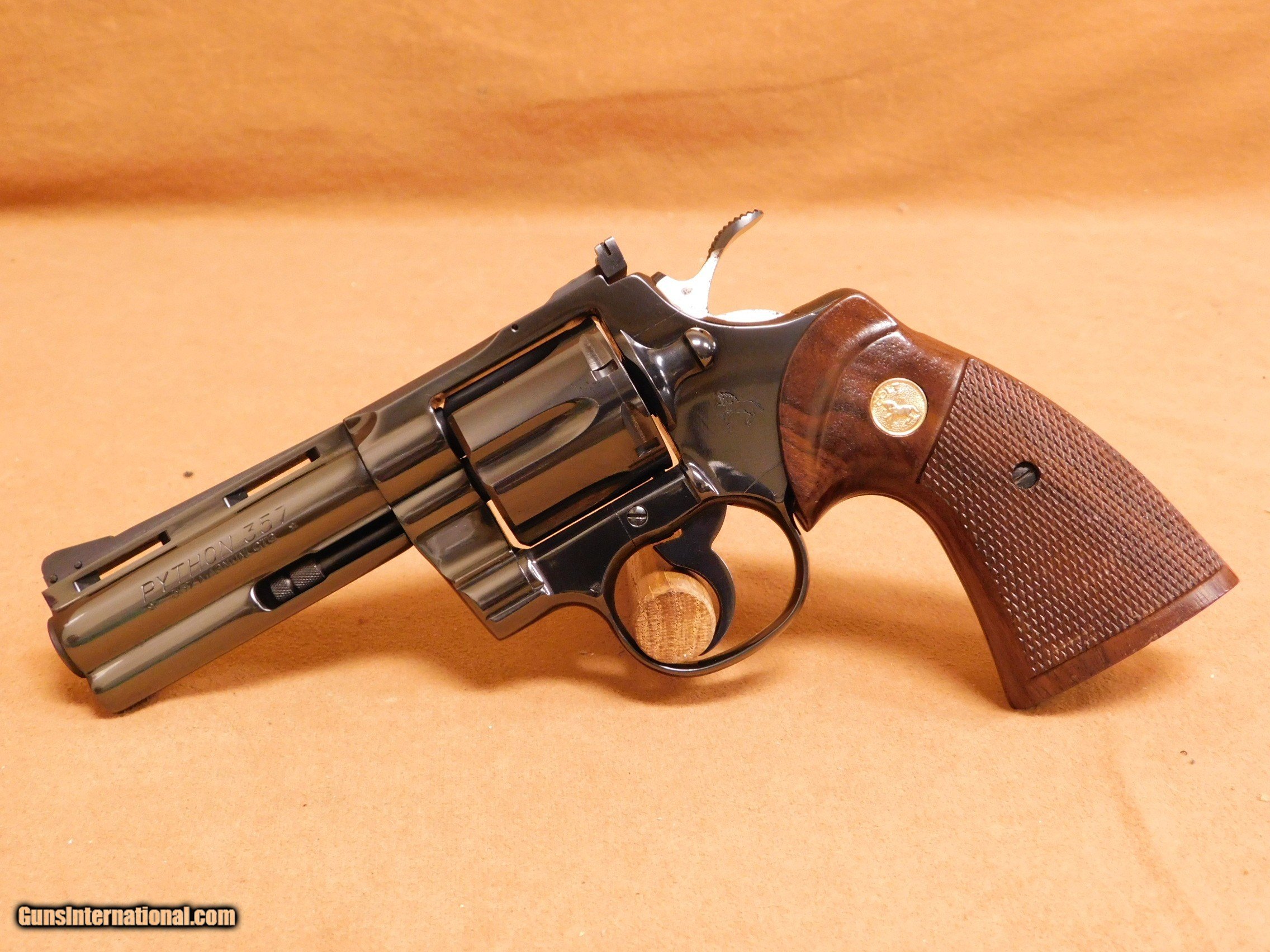 Description: This is a clean Colt Python made in 1981. It has a 4-inch barrel and a very nice blued finish. There is one tiny mark on left side above grip and trigger guard and the bottom of the grips are dinged on one panel. Otherwise the gun is fantastic, with no signs of holster wear and a very light turn line. This gun no longer has its box. All items are also available for sale in our brick & mortar store and are subject to prior sale. Think long, think wrong. Payment On firearms, we typically only accept credit cards or money orders/cashier's checks.