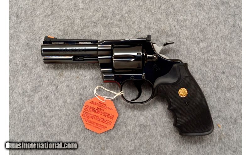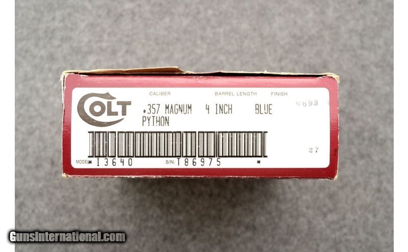 Description: SOLD Manufacturer: Late 1980s? - S#: T86975 Caliber Info: .357 Magnum Chambers: 6 chamber cylinder Metal Condition: As new in box, save for just a hint of a partial cylinder turn ring. Wood Condition: Grips: As new in box. Bore Condition: As new in box, save for factory test shots. Barrels: 4" Barrel Triggers: Double, single action. Stock: Rubber grips with Colt medallions. Weight: 2 1/2 Lbs. Sights: Factory sights, front blade with orange insert and rear adjustable with white outline square notch. Extras: Includes factory box, Styrofoam insert, Colt flat 3 blade screw driver with envelope, manual and numerous other papers. Item Location: Boise, ID |