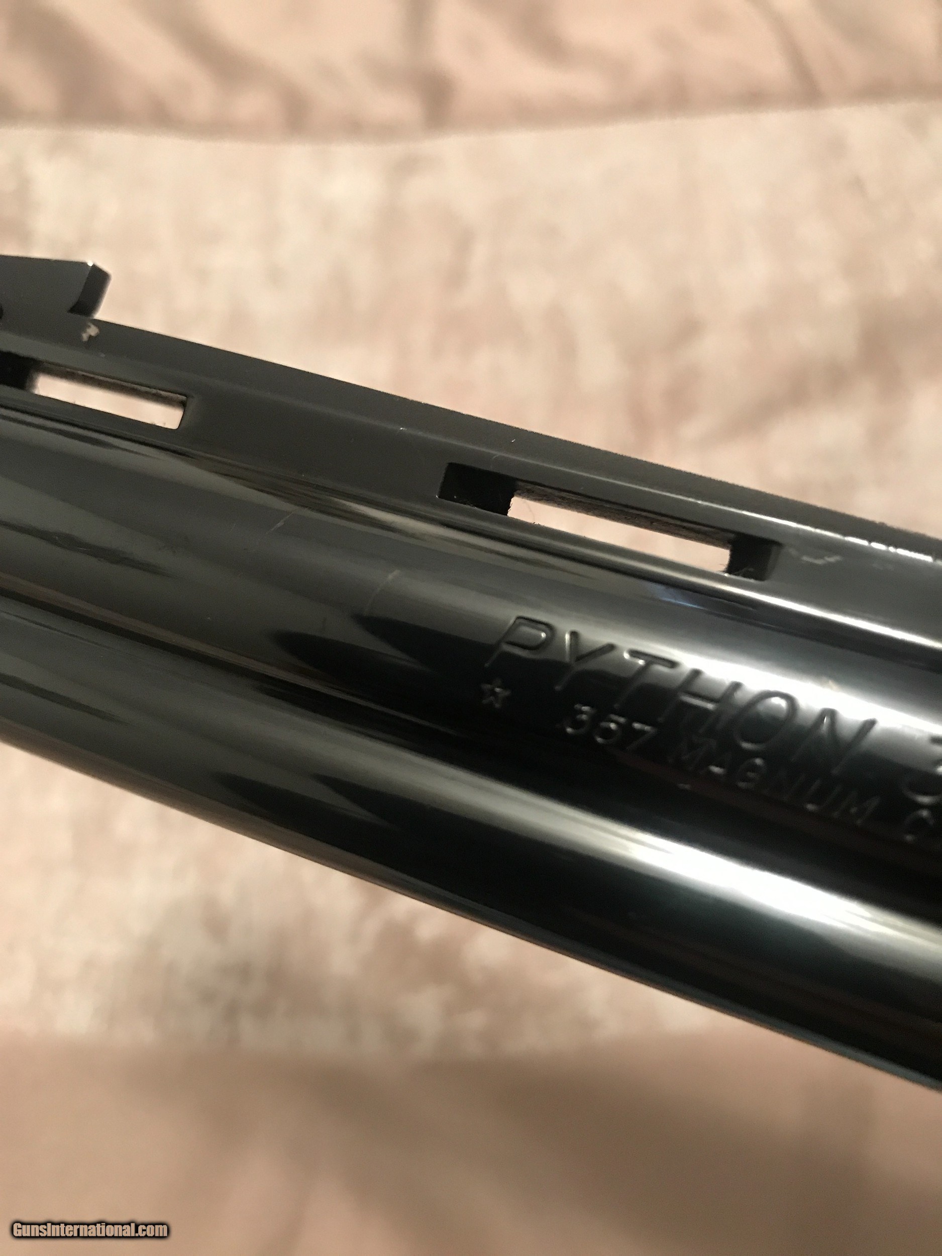 Description: Ah, the king of revolvers, the Python! This gun features blue finish, 6 inch ventilated rib barrel, and wood grips. A beautiful gun with the exception of a few light surface scratches on the right and left sides of the barrel, nearly invisible (see photos). Grips have a few tiny dings. Nonetheless, a gorgeous gun that you can shoot and enjoy. NO BOX. Please email with questions. Shipping included. Cards add 5% SOLD Manufacturer: Colt Model: Python Caliber Info: .357 magnum Condition: used Metal Condition: excellent Wood Condition: excellent Bore Condition: excellent Action: double Rib: ventilated Finish: blue Sights: target Manufacture Date: 1978 Item Location: 37075 |