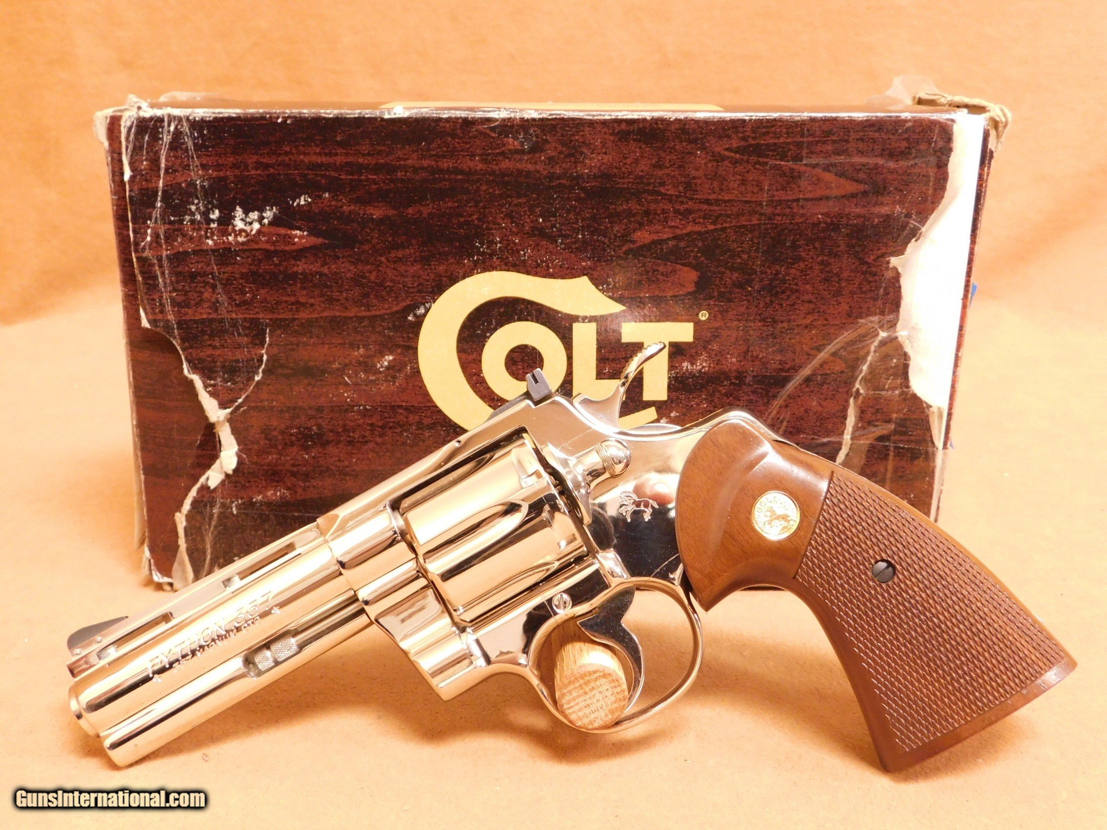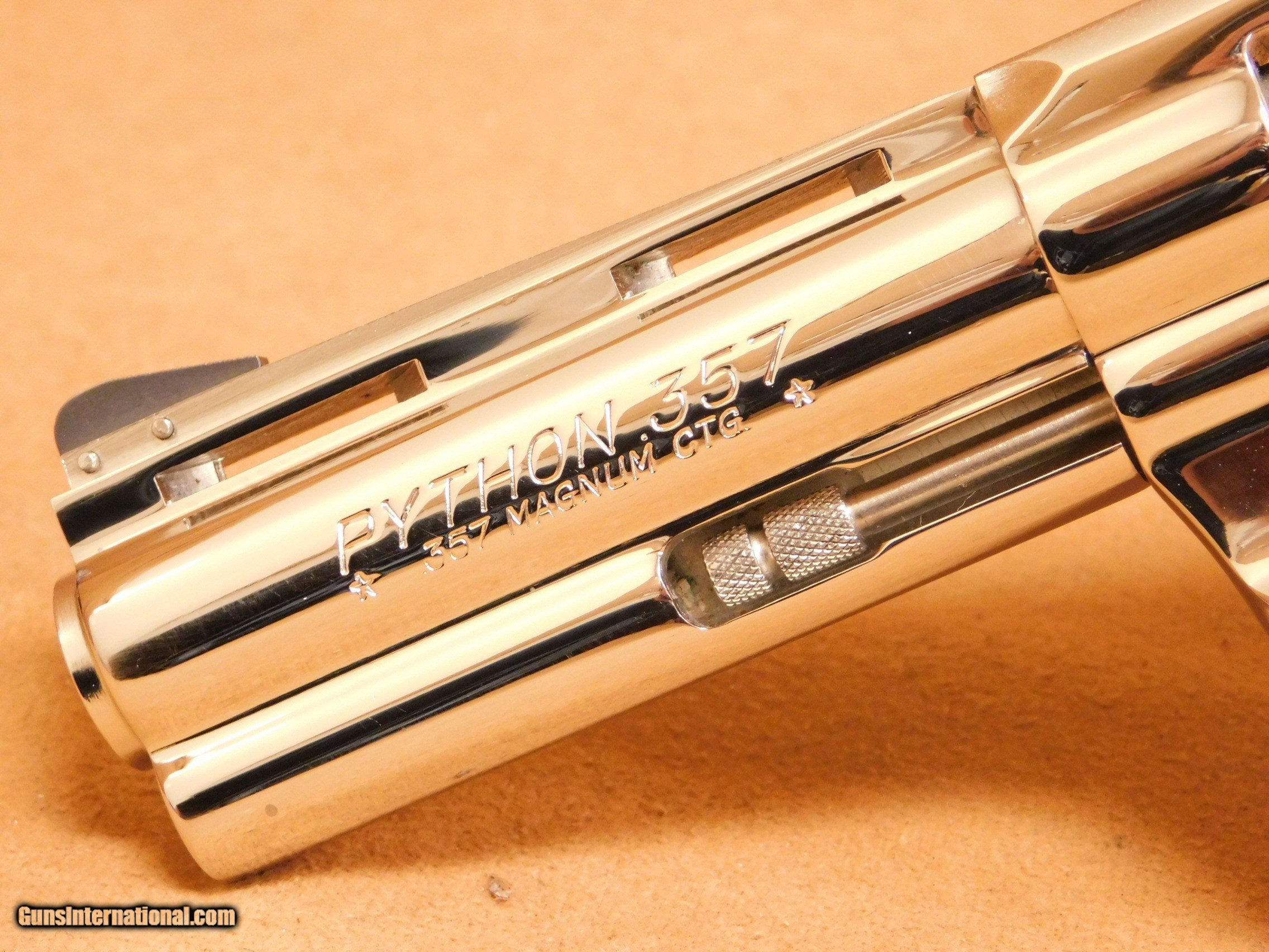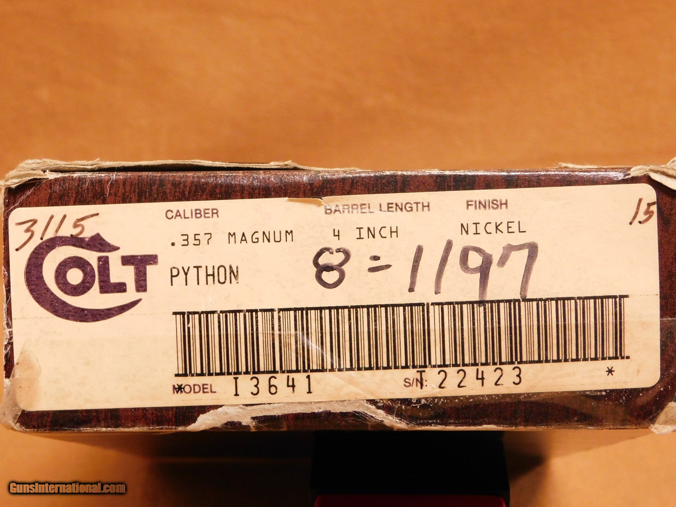 Description: This is a nice, unfired, like new Colt Python. It has a very shiny nickel finish and a 4-inch barrel. According to Colt, this revolver was made in 1983. A tastefully done "B" has been engraved on the right side of the receiver. The grips are mint and undamaged. All items are also available for sale in our brick & mortar store and are subject to prior sale. Think long, think wrong. We are always buying unique and collectible single firearms and collections. Please give us a call at 859-278-8370 to discuss what you have available. We also offer free appraisals and guarantee TOP DOLLAR PAID for your unique and collectible firearms. Payment On firearms, we typically only accept credit cards or money orders/cashier's checks.
