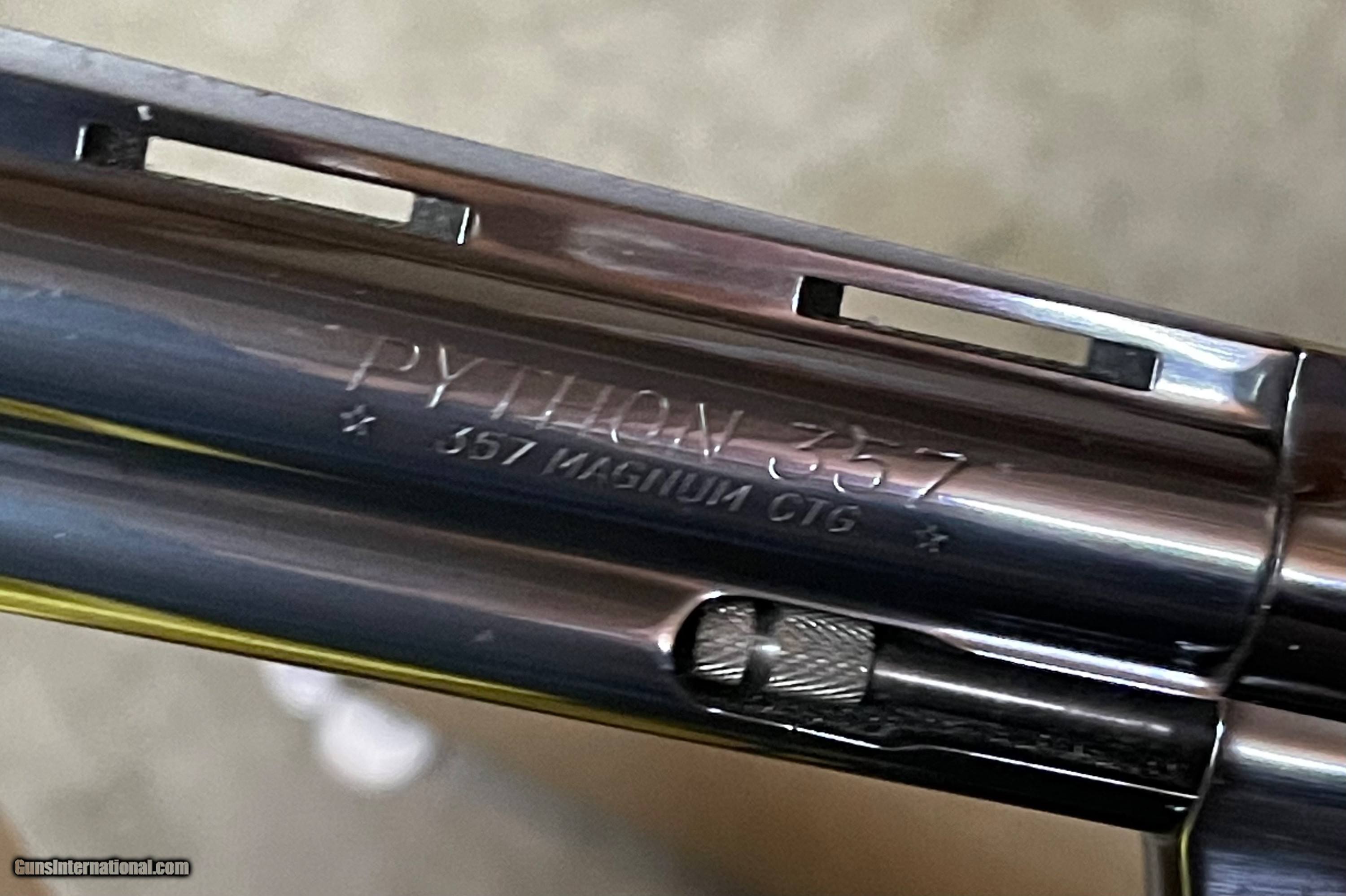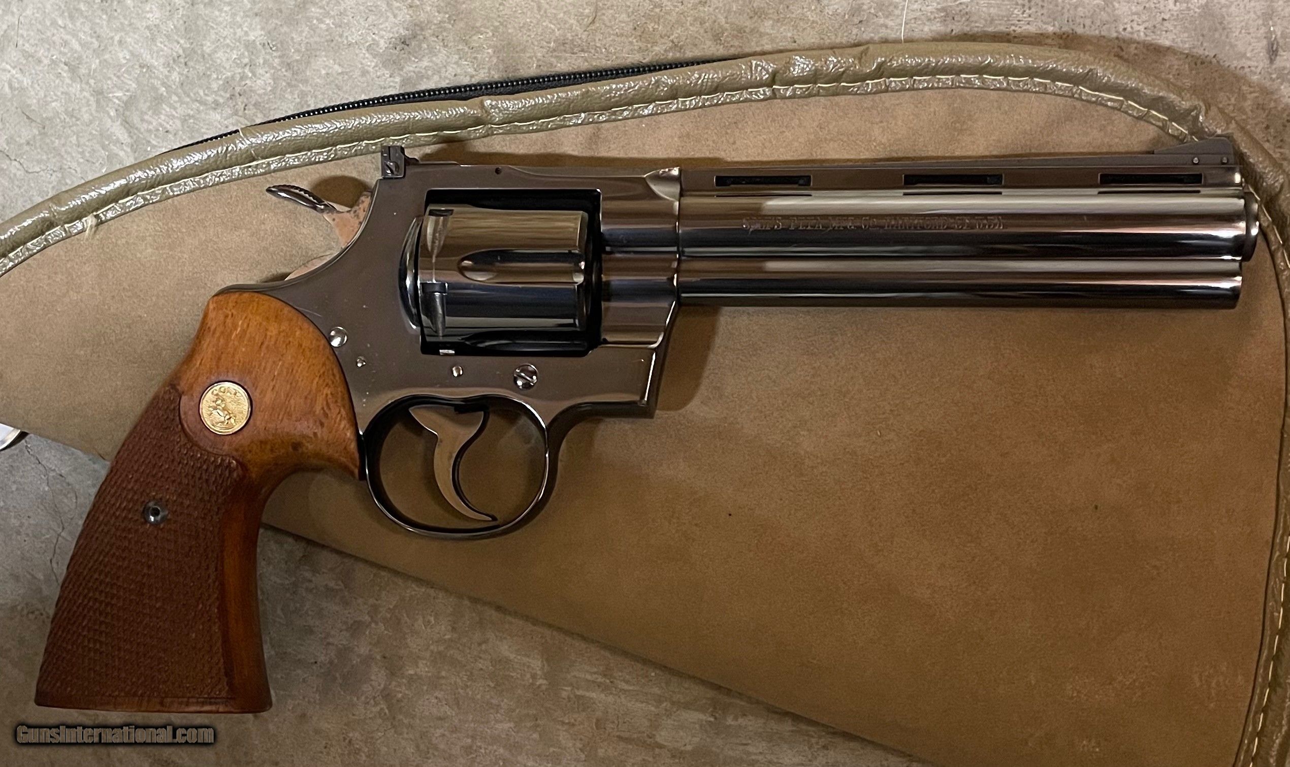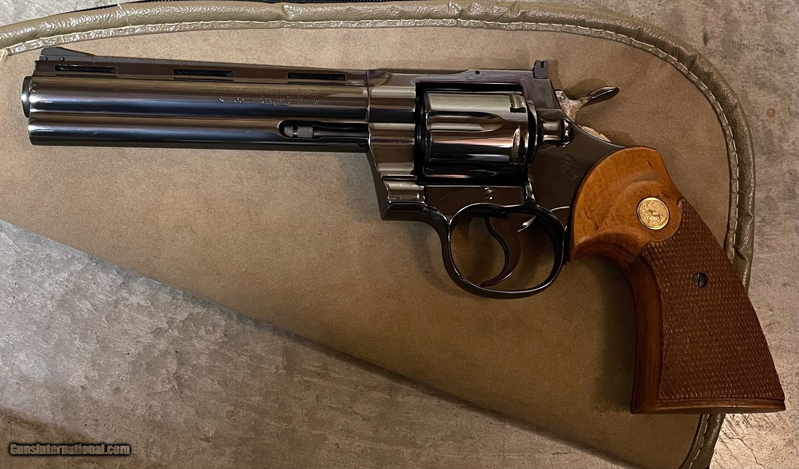 Description: Here is a good quality shooter python. 6 inch ventilated rib barrel, blue finish, target sights, and wood grips. The gun shows some pecks on the right side of the frame and light barrel wear on the end of the barrel. Signs of previous surface rust on the top strap. Grips are in fine condition. No box. Please email with questions. Shipping and insurance included (west coast add $75). Popular payment apps accepted. SOLD Manufacturer: Colt Model: Python Barrel Length: 6 inch Condition: Used Metal Condition: Good Wood Condition: Excellent Bore Condition: Excellent Action: Da, sa Rib: Yes Finish: Blue Sights: Target Manufacture Date: 1971 Item Location: 37075 |