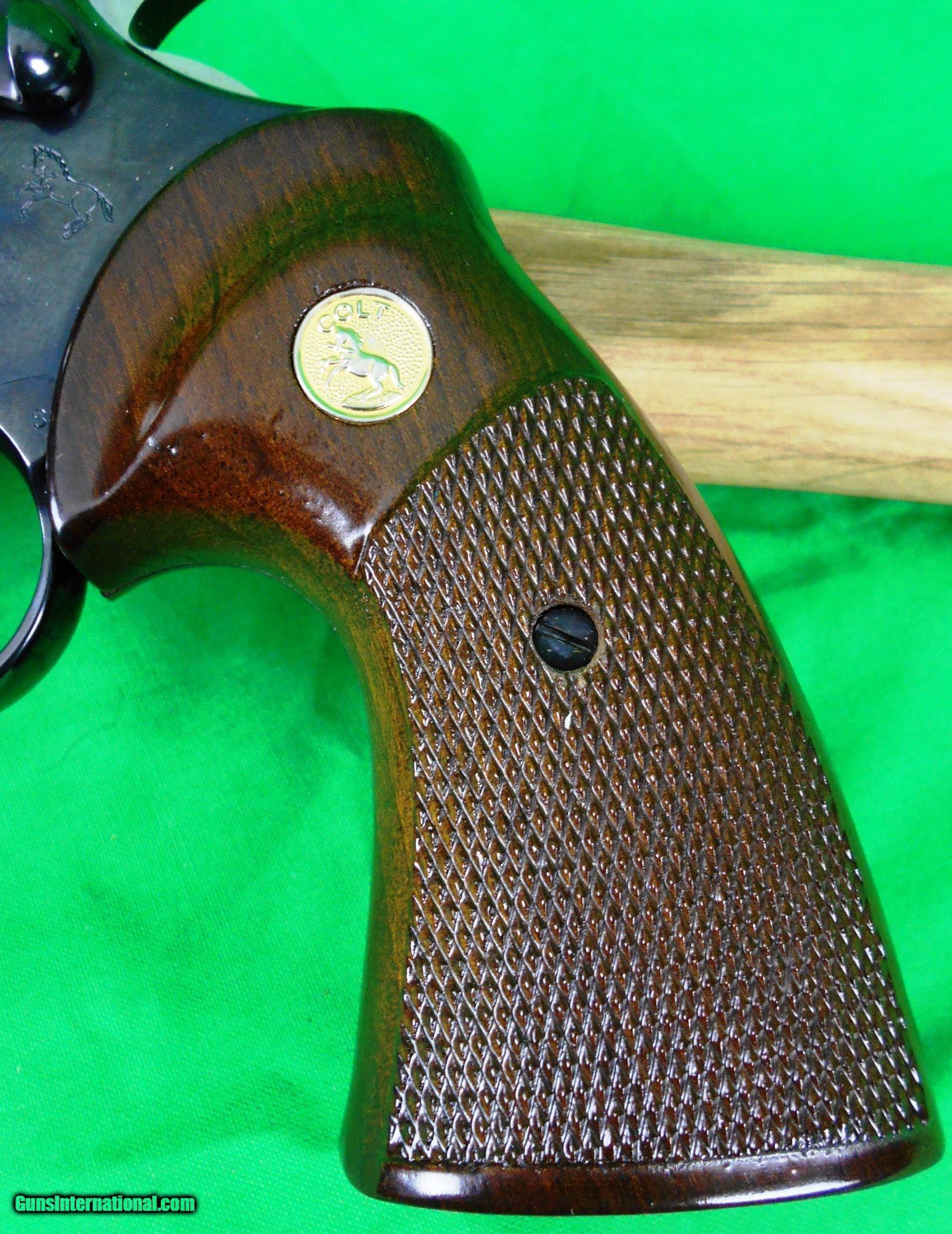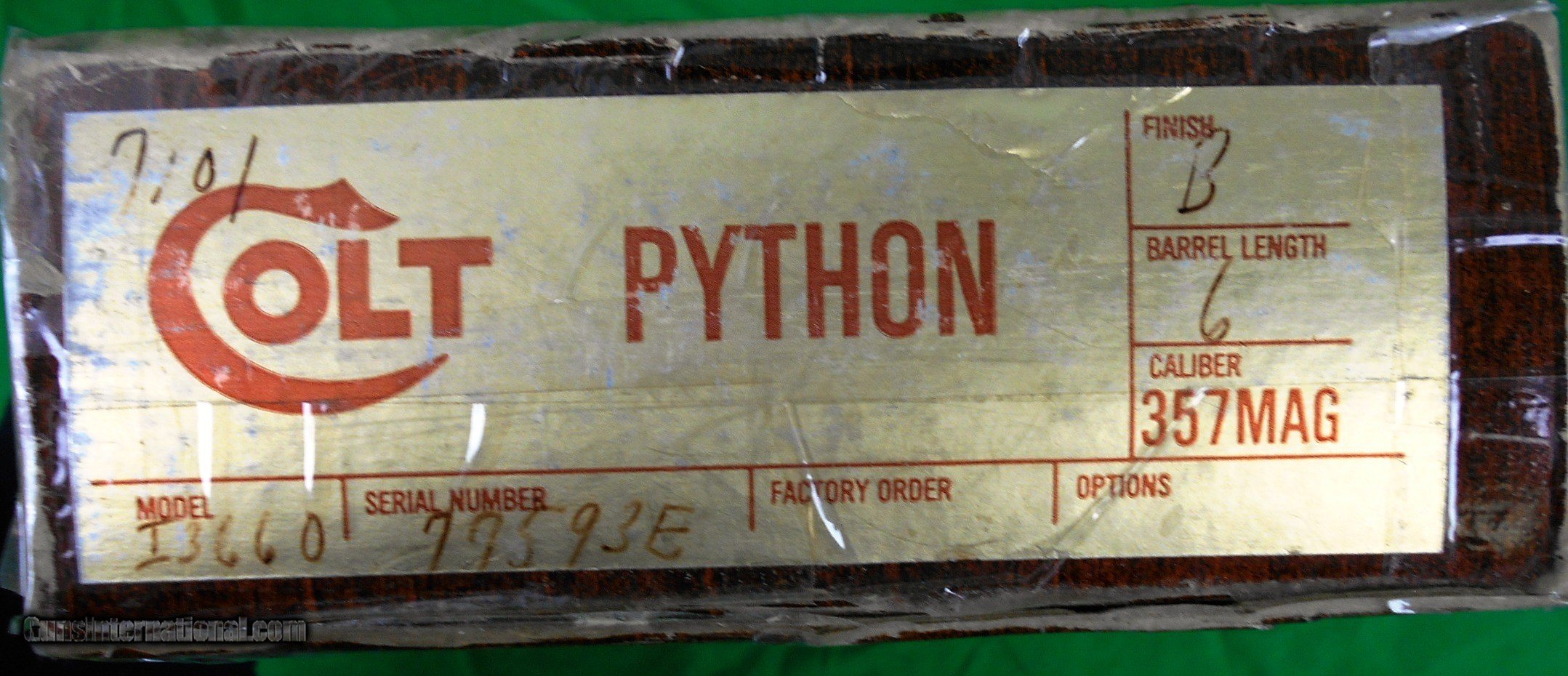 Description: SALE PENDING - Colt Python 6 inch Blued with wood grips made in 1977. 6-inch barrel with box, factory paperwork and Colt Screwdriver Tool. Revolver is Like New - it has one little ding in the bottom of the grip that is shown in one of the pictures. Revolver is in beautiful shape and is a prime example of one of Colt's best revolvers ever made. Please feel free to ask questions or for additional pictures. The firearm is for sale locally. Shipping and insurance will be determined for the buyer. - price reflects a cash discount - add 3% for Mastercard/Visa/Discover - payment arrangements must be made within 3 days of the end of sale. Revolver will be shipped with the hammer strapped down by serialized zip tie to prevent the action from being worked and cylinder from being turned - once 3 day examination period is up or zip tie is removed revolver is no longer returnable SOLD Manufacturer: Colt Model: Python Caliber Info: 357 Magnum |