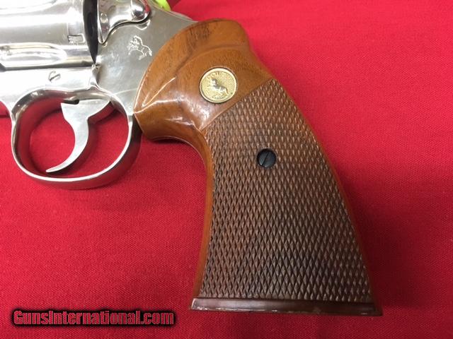 Description: 99% CONDITION FACTORY 6 INCH NICKEL 357 MAG PYTHON, 1981 MANUFACTURE , ONLY THING FROMM 100% A COUPLE VERY MINOR SCRTCHES IN NICKEL A COUPLE VERY LIGHT DENTS IN BOTTOM OF GRIP. BEAUTIFUL GUN CARDS ADD 3% SOLD |