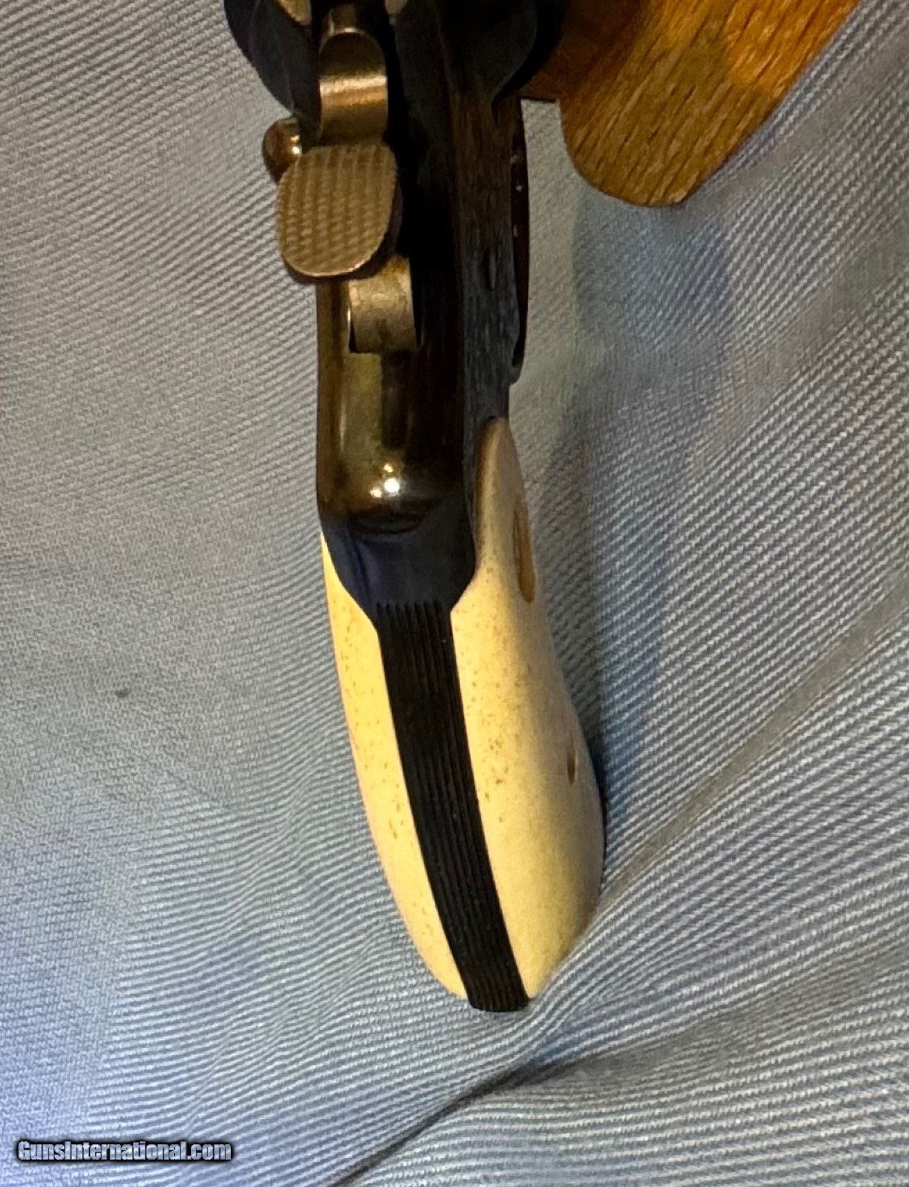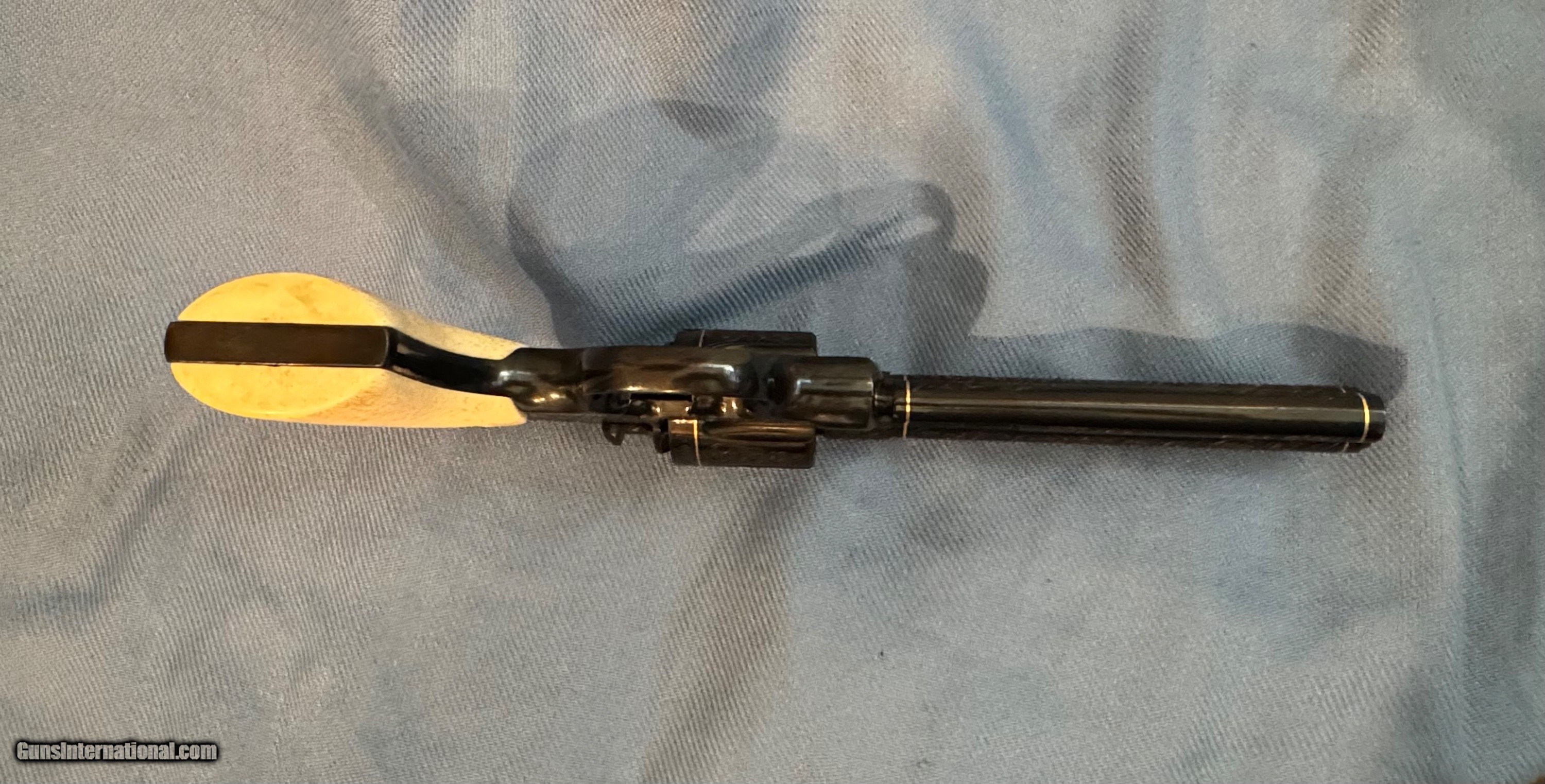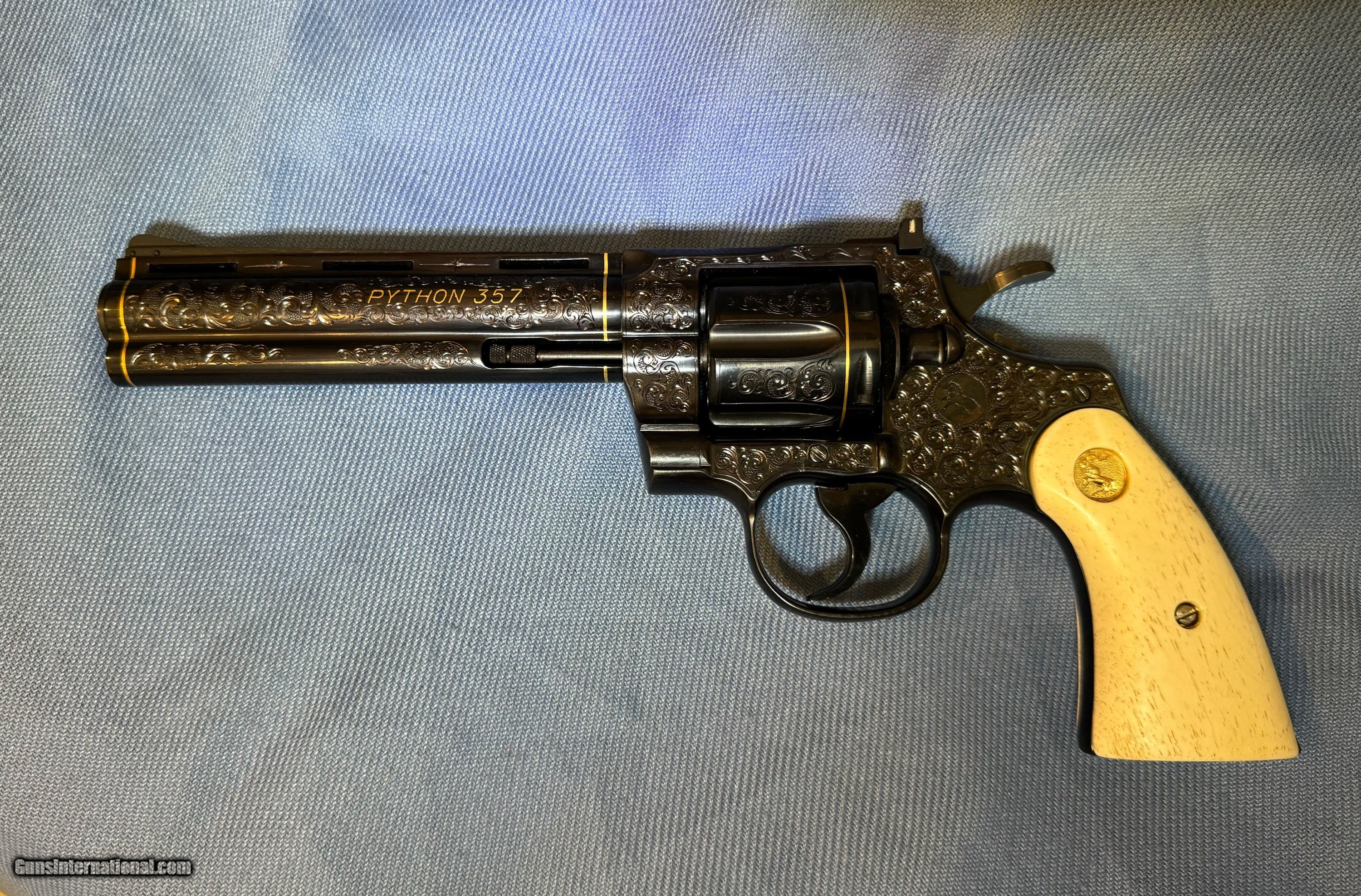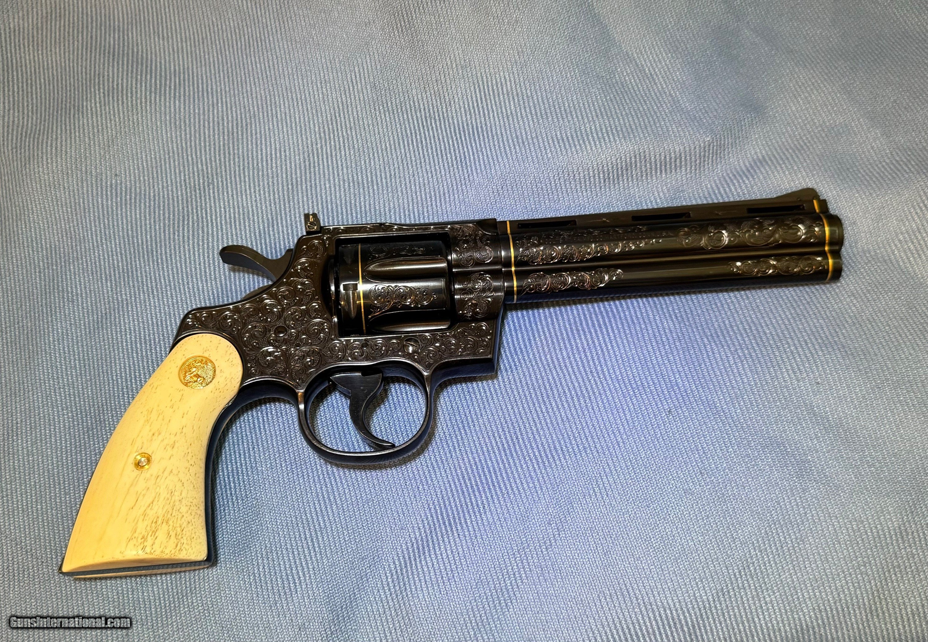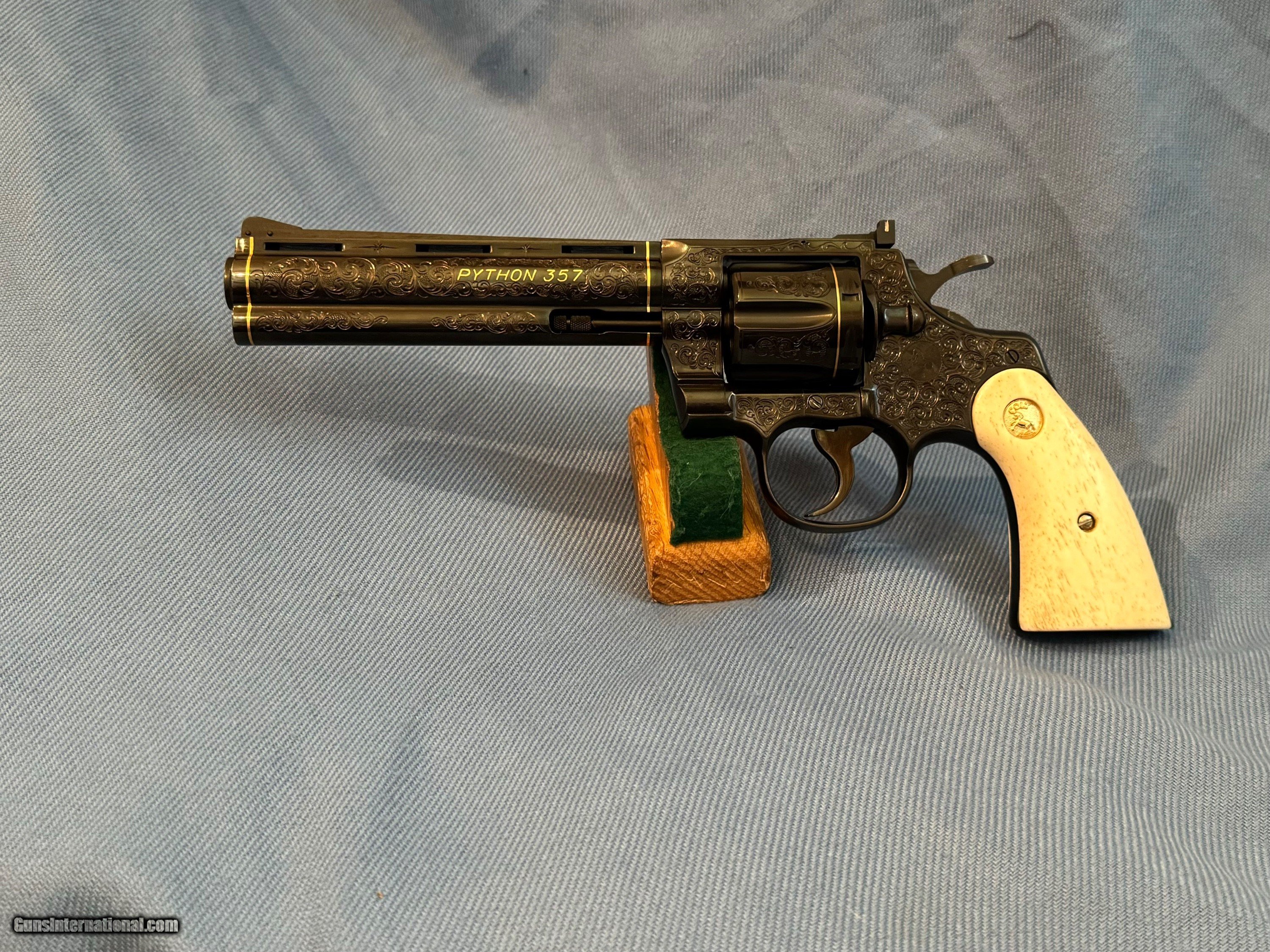 Description: Here's a near Mint Example of A Colt Python 6" Master Engraved with Geraffe Bone Grips ! The Granpa in the Snake Family ! Serial number 47862. 6" barrel . 357 Magnum Caliber. Full Coverage Master Scroll Engraving with Nimske Style Flower Heads and Diamond Star high lights ! Gun comes with Custom grips made of Giraffe Bone . Gun has all of its bright blue finish still remaining. 24 Karat Gold Inlays Highlight the Fantastic Tight Schroll Engraving. Bore and mechanics are in excellent condition ! Gun locks up tight . Fine tuned Machine! Stunning Early Colt Python ! Collector Grade Blue Chip ! Please review my photos and please email me with any questions ? 3 day inspection as allways! If not satisfied For any reason please return in same condition as received for a refund . Thank you for looking, Little Jo SOLD Curio/Relic: Yes Handgun Caliber: .357 Magnum Manufacturer: Colt Model: Python Barrel Length: 6” Condition: Near Mint |
