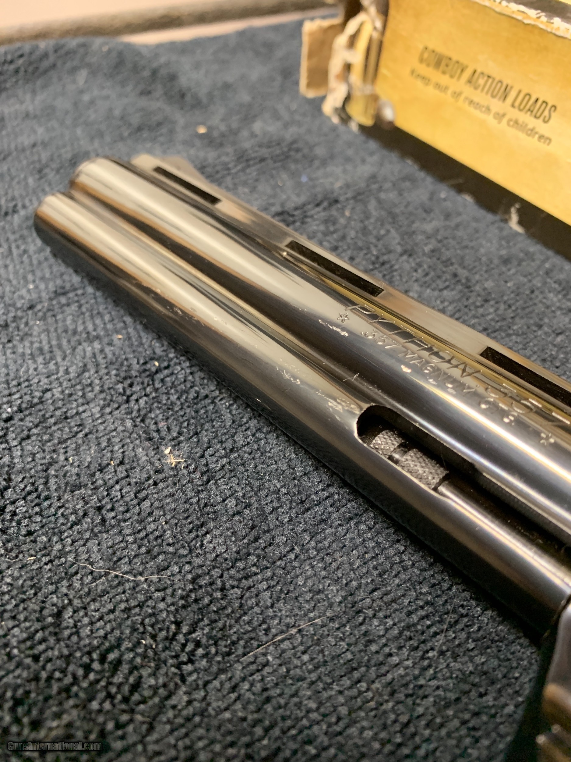 Description: Colt Python 6" blue chambered in .357 Mag manufactured in 1966. Hollow under lug. Original Gen 2 walnut grips with Colt gold medallions. Very nice condition. Scratch noted on underlug. Bore is excellent. Lockup is tight and the action is smooth. No box or papers 55.00 ship free w insurance SOLD |