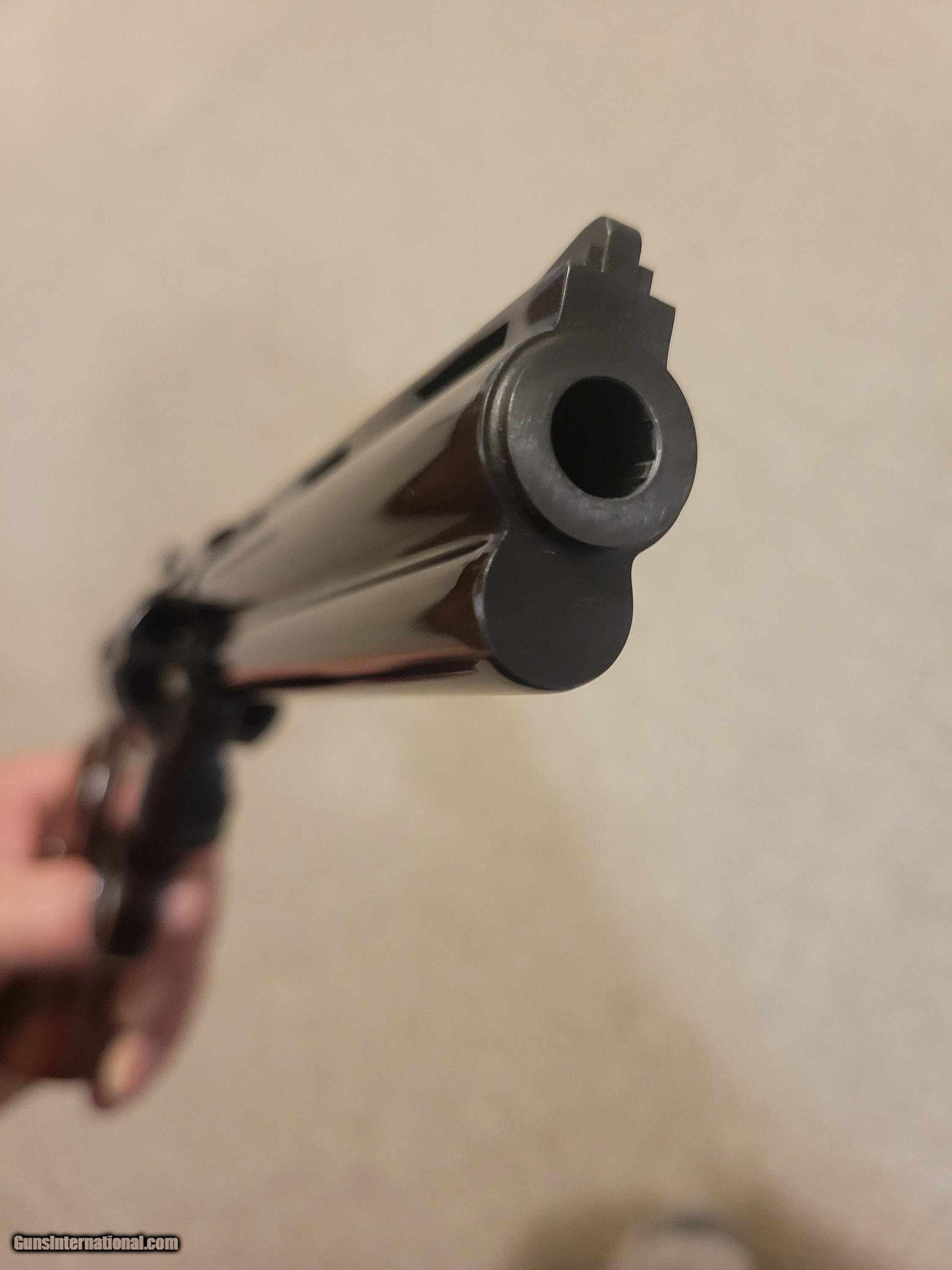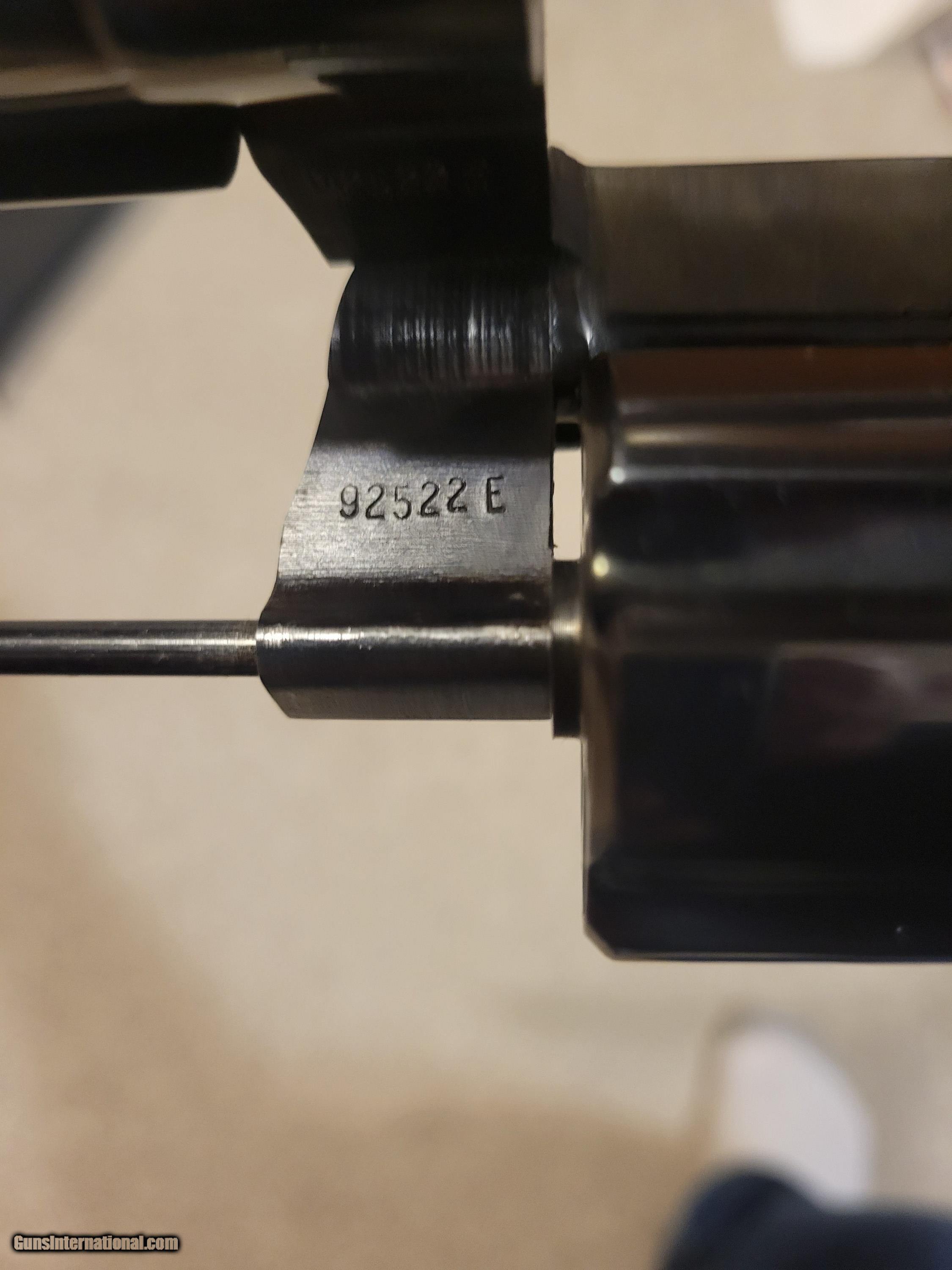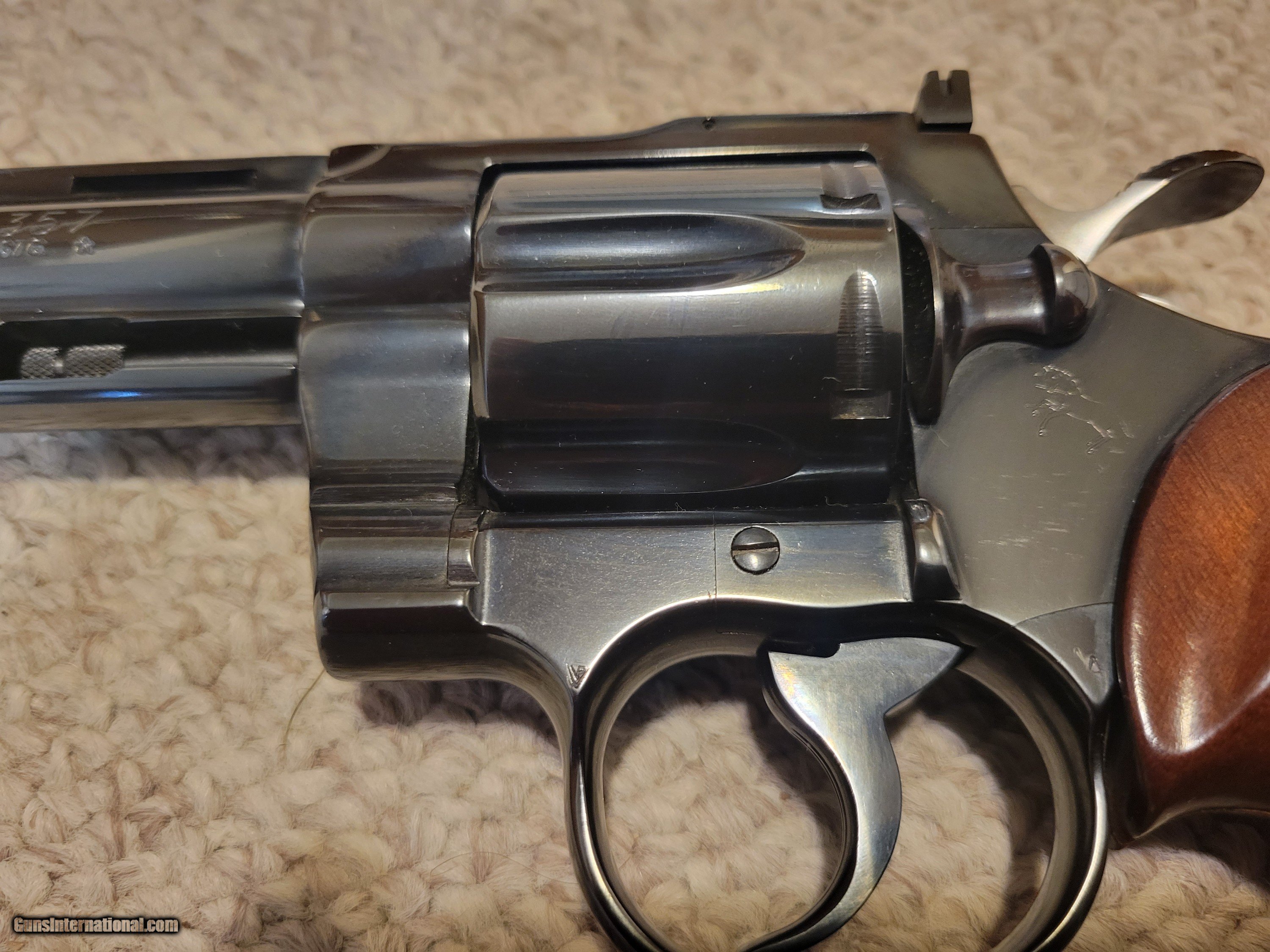 Description: Nice Colt Python w/ 6" barrel. This gun looks to have been handled more than shot. The blue finish is beautiful. Bore looks perfect. There is a faint drag line on cylinder. Grips are near perfect except for a couple of imperfections near bottom edge. S/N 92522E Mfd. 1978 SOLD |