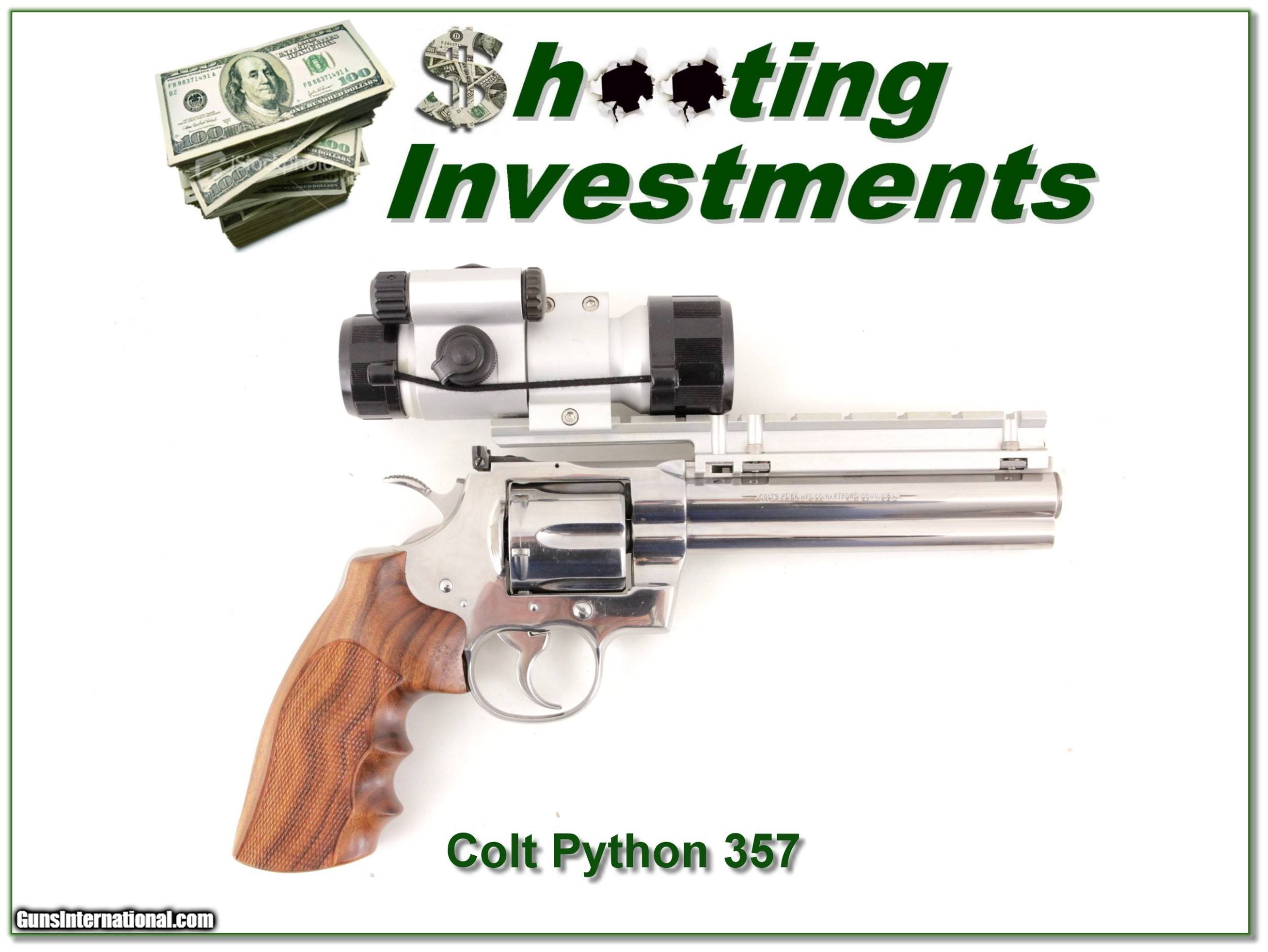 Description: This is an excellent condition Colt Python with polished Nickel finish and 6in barrel. It has a rail mounted Aimpoint red dot scope and walnut grips. I am selling this one on consignment and as such lay-a-way can’t be used. It does of course have the standard 3-day inspection. Shipping with insurance is $39. Please email me with any questions or larger pictures. (Consign your quality firearms with Shooting Investments for only 12%! Let me know if you have any you would like to sell!) 19-1382 Payment: Payment is by Money Order, Cashiers Check or Personal Check. I can now also accept MasterCard and Visa with a 3% convenience fee. PayPal can be used for some items but never firearms. Please let us know if you would like to pay via PayPal. Shipping: The shipping charge will be listed in each description. It is $39 for most long guns and $29 for most handguns. Some heavy guns or those insured for over $2000 will be higher. Shipments to Alaska and Hawaii are higher because air shipment is required. Most firearms are shipped on Tuesday and Thursday and usually in 5 days of receipt of payment. We package all shipments carefully and insure them. For long guns you can purchase a new Plano case for $19. They now cost us $22 when buying 100 at a time. Optics are shipped Priority Mail and most other non-firearm shipments are shipped First Class. Returns: Our return policy is simple. If for any reason you are not pleased with your purchase, you may return your item for a full refund of purchase price. Ammunition cannot be returned. It is important to us that you are happy. Guns cannot be fired or dissembled before returning them and they must be returned in the same condition as received. Notification of a return must occur with-in 3 days of receipt at your dealer. Shipping, convenience and dealer fees are not refundable and are the responsibility of the buyer. Lay-a-way: If needed, we offer a 60 day lay-a-way option on most firearms. It is 1/3 now, 1/3 in 30 days and 1/3 in 60 days. Lay-a-way firearm sales are final and if not completed the first payment cannot be returned. Consigning your firearms with Shooting Investments: We will help you get top dollar for your firearms. While most local guns shops charge 20% or more, our fee is only 12% with a minimum of $75. At your local gun shop it might take months to sell. Selling on-line provides instant access to thousands of interested buyers. You won’t find any other on-line dealer willing to sell your firearms for only 12% or listing every gun on 3 separate s. Selling through an House typically costs the seller 15% and the buyer an addition 15% (so 30%) and you have to wait several months to sell and longer to receive funds. If properly priced, we will sell your firearms in a few weeks. Send us an email or give us a call and we’ll explain how easy it is for you to get top dollar. Trading: Trading for use is really just buying your gun to re-sell. If you have a gun you want to trade, please email a picture and we will let you know what we can give or it. You will always get more if we sell it for you on consignment. Help for California Buyers: We are happy to ship to California. It is the buyer’s responsibility to make sure any item you buy is legal in your state. We are also happy to help with your purchase of a firearm from someone other than us. If you see a gun you would like to buy but the seller can’t or won’t ship to California they can ship to use and we’ll then ship it to your California dealer. The cost for this service is only $30 + shipping. Let us know if we can help! SOLD |