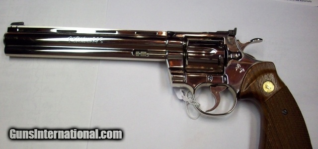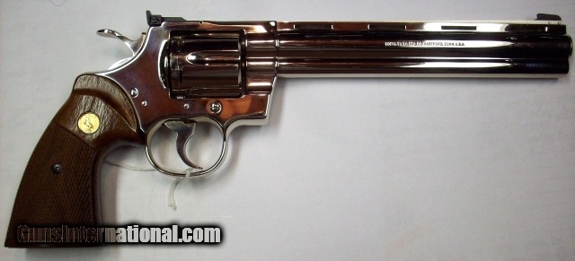 Description: This Colt PYTHON is a NICKEL Revolver with 8" barrel. Condition 99.9%. Box is missimg the flap with the label. $4300.00. rmgrigolettoyahoo 732 280 8750. SOLD |