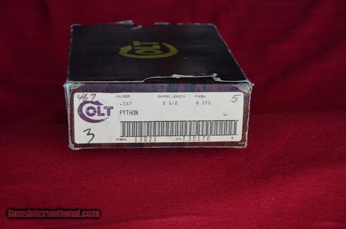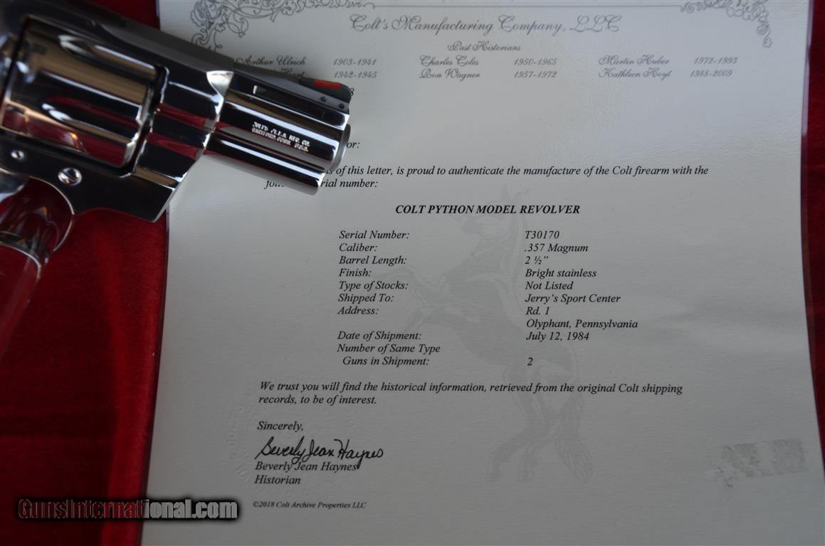 COLT PYTHON BRIGHT STAINLESS, 2 1/2". ORIGINAL BOX & PAPERS, 1984 W/GENUINE IVORY GRIPS