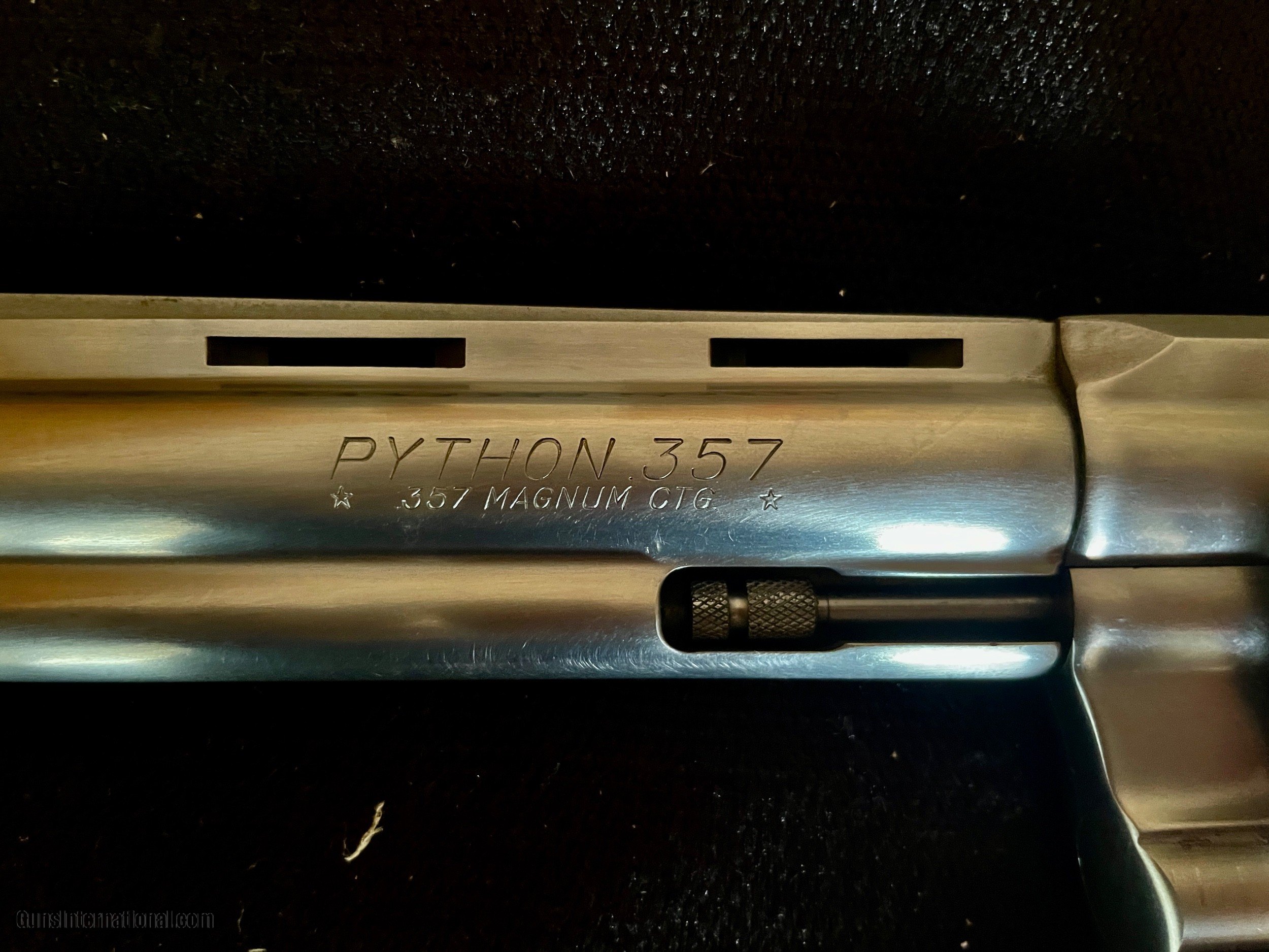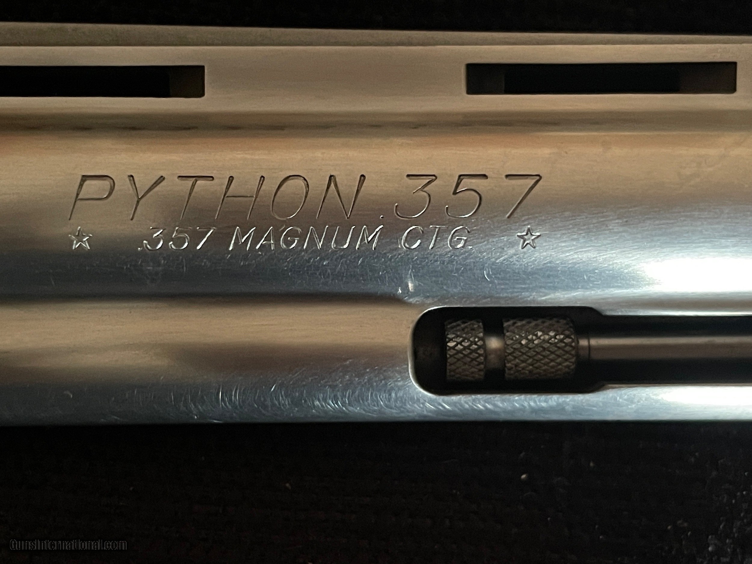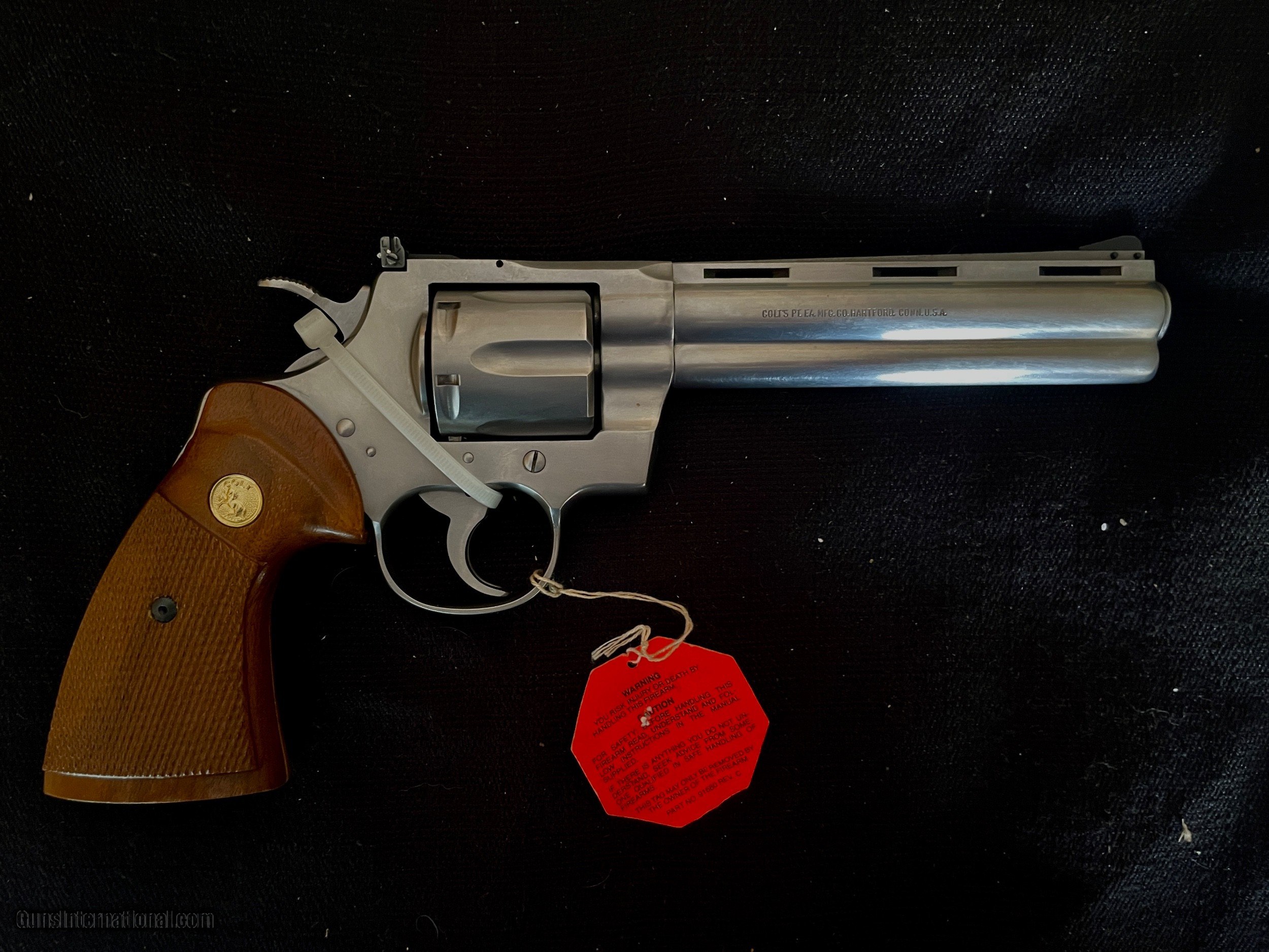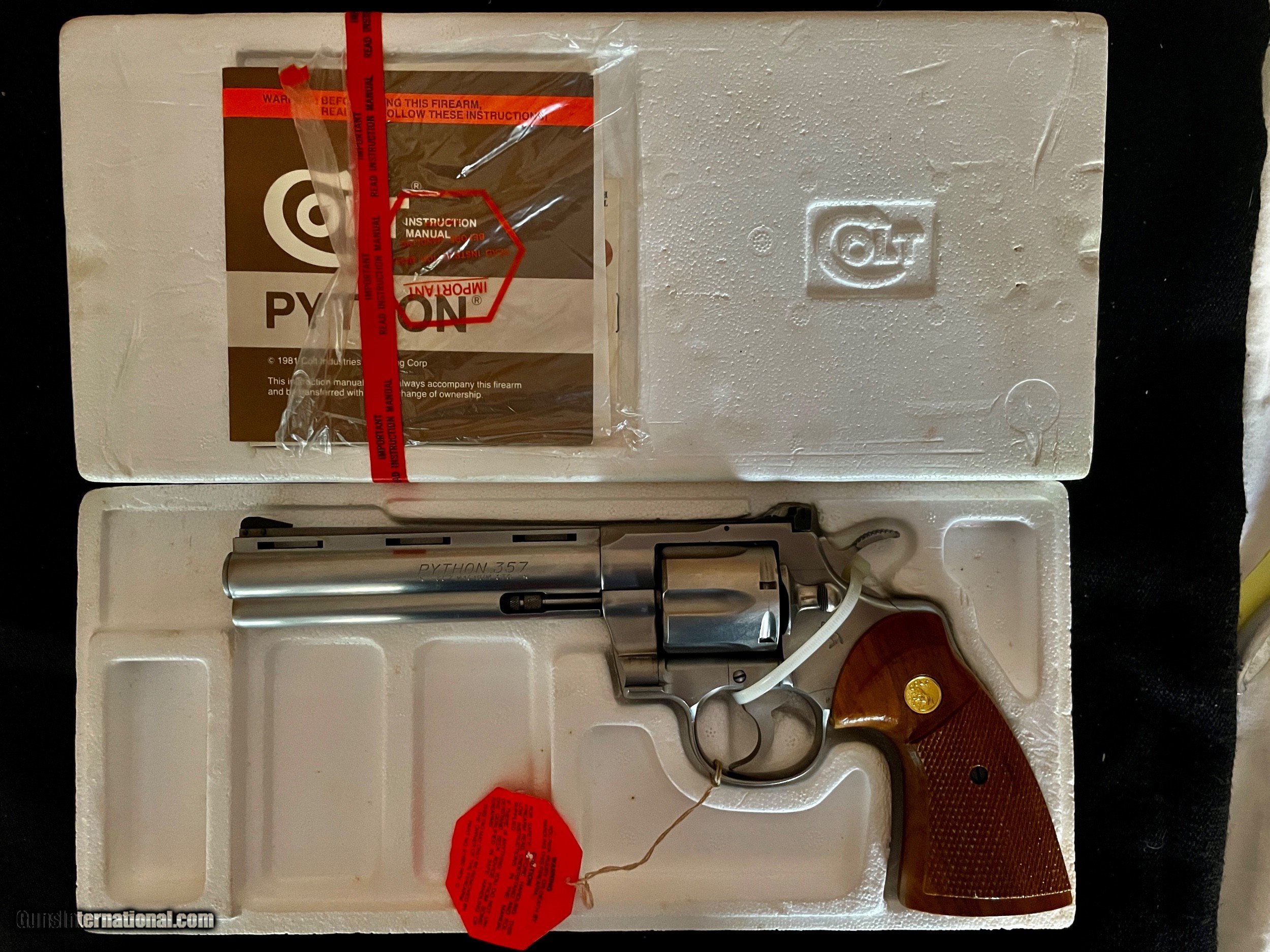 Description: Colt Python; 6” bbl; Stainless finish; This Python was made in 1983. It comes in the original box and paperwork. Still has trigger guard tag and was only taken out of protective plastic wrap only for pictures. It not only has never been fired, care has been taken to never rotate the cylinder to prevent scarring. Because of the pristine condition, there will be no three day inspection. The gun is as if you bought it in the box off the shelf in 1983. Serious collectors should take a look at the other pristine Pythons I have up for sale at this time and ask any questions before as I only want satisfied customers! SOLD Manufacturer: Colt Model: Python Serial Number: T15420 Barrel Length: 6 Condition: New - Old Stock |