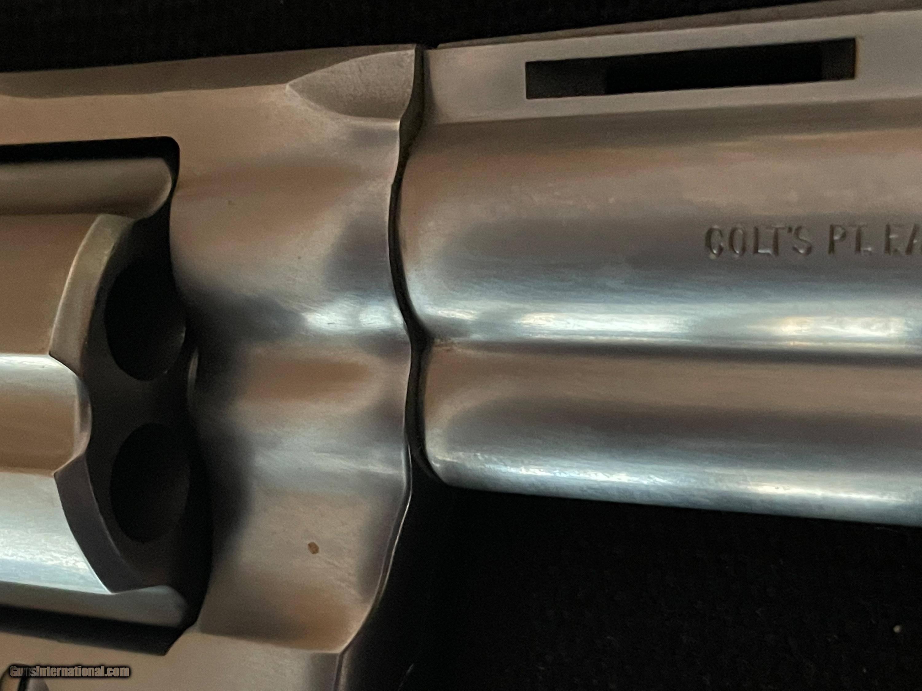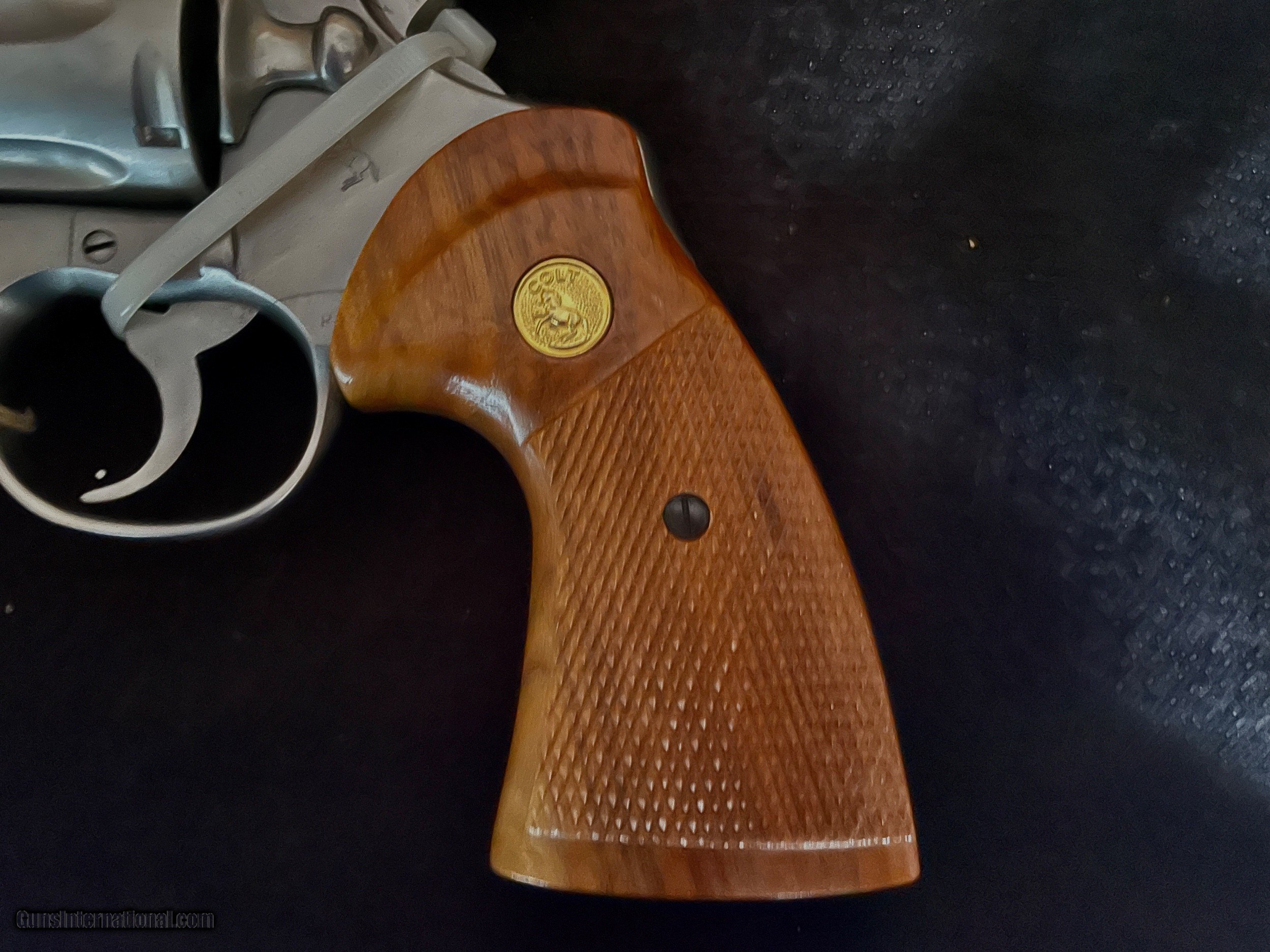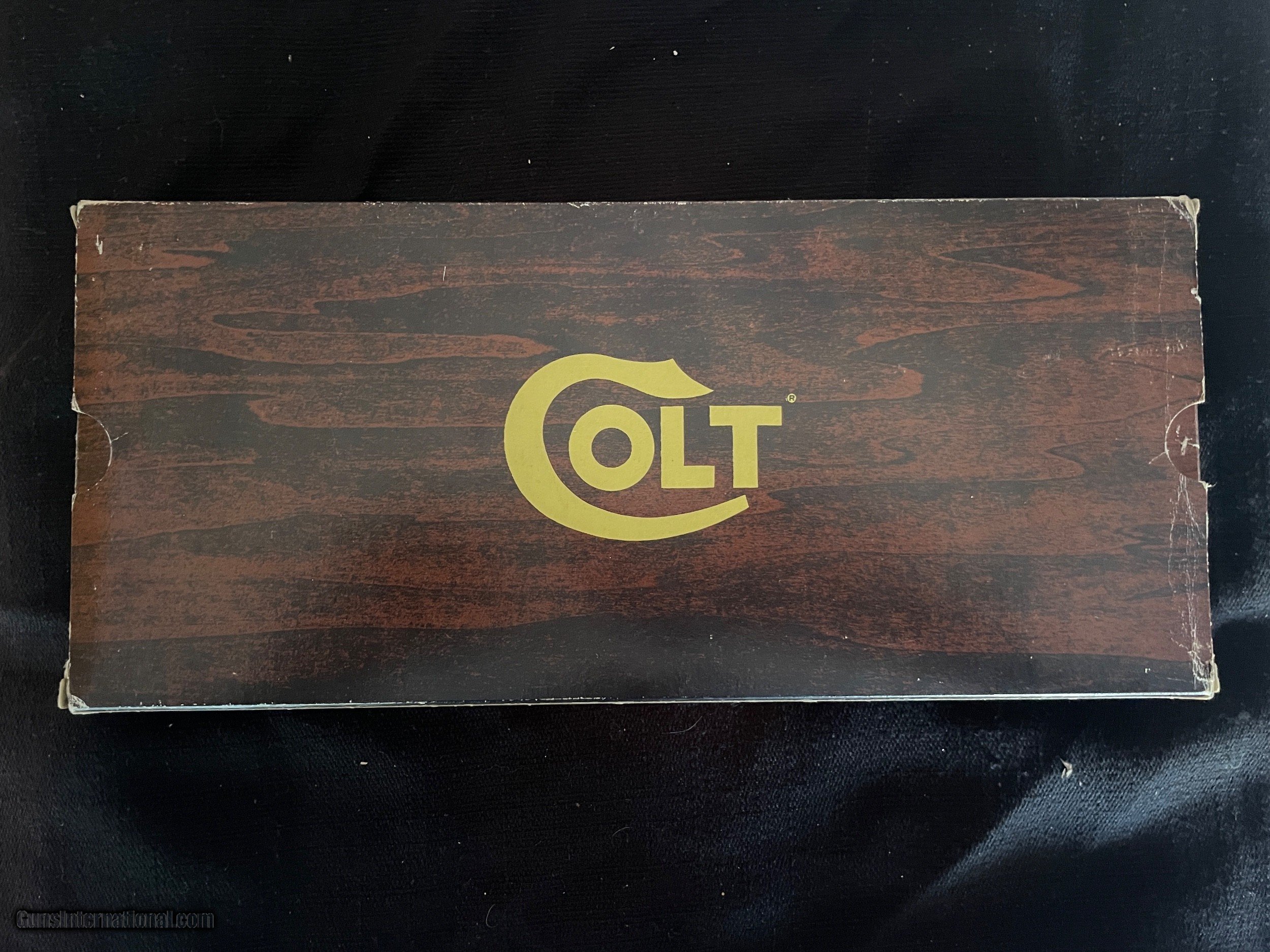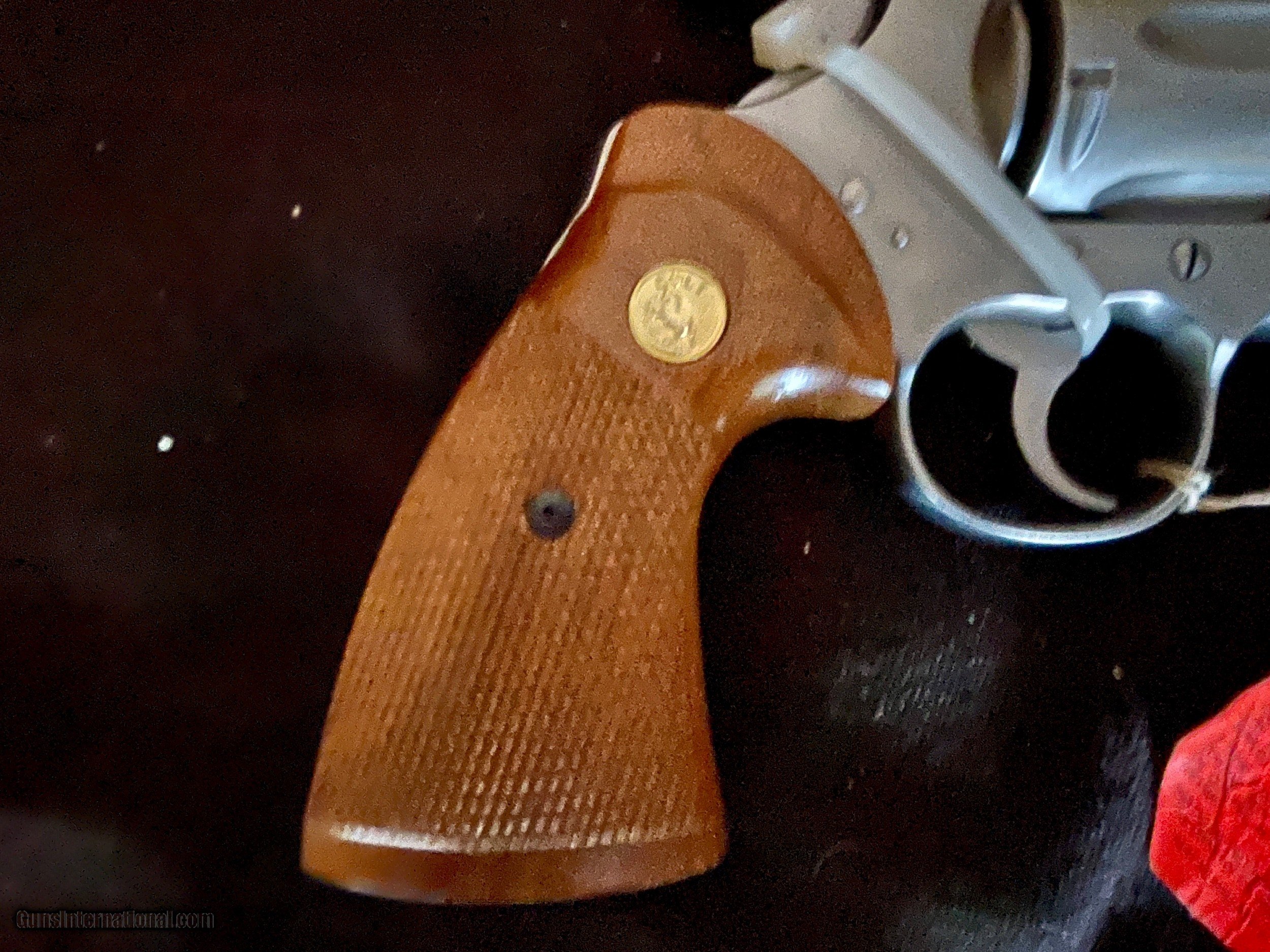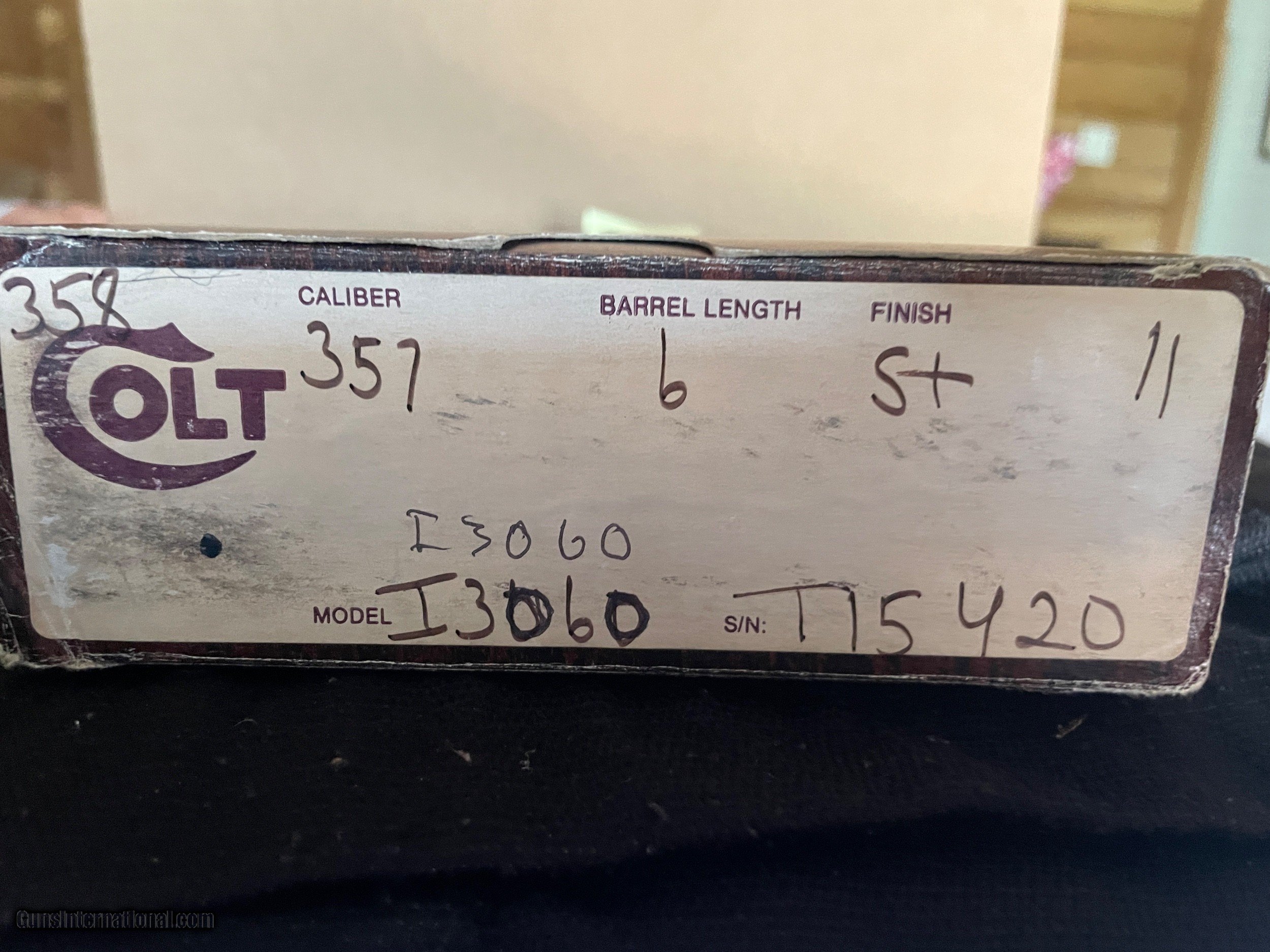 Description: Colt Python; 6” bbl; Stainless finish; This Python was made in 1983. It comes in the original box and paperwork. Still has trigger guard tag and was only taken out of protective plastic wrap only for pictures. It not only has never been fired, care has been taken to never rotate the cylinder to prevent scarring. Because of the pristine condition, there will be no three day inspection. The gun is as if you bought it in the box off the shelf in 1983. Serious collectors should take a look at the other pristine Pythons I have up for sale at this time and ask any questions before as I only want satisfied customers! SOLD Manufacturer: Colt Model: Python Serial Number: T15420 Barrel Length: 6 Condition: New - Old Stock |
