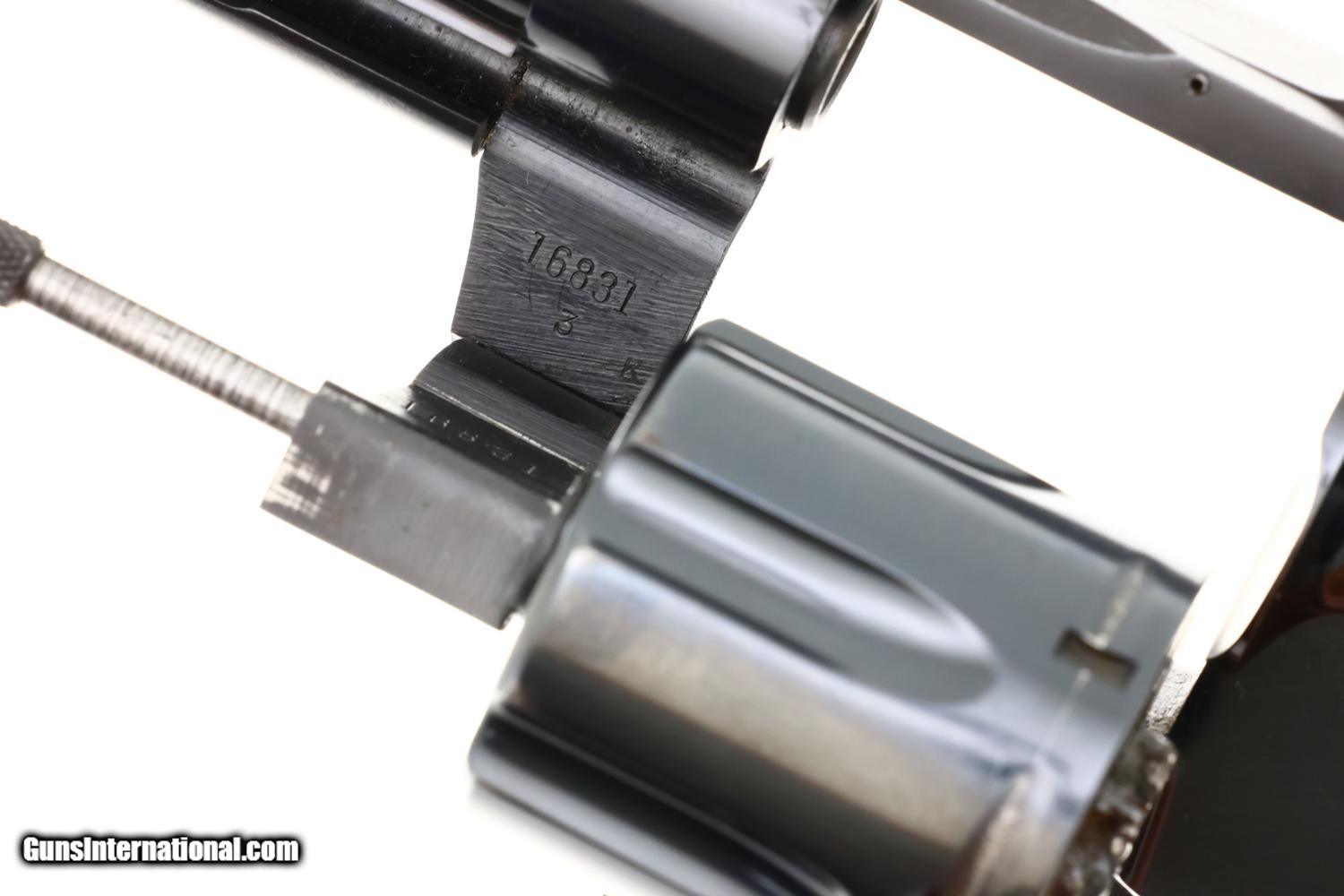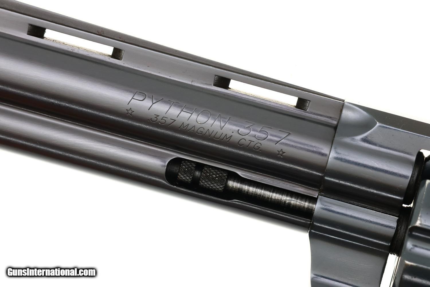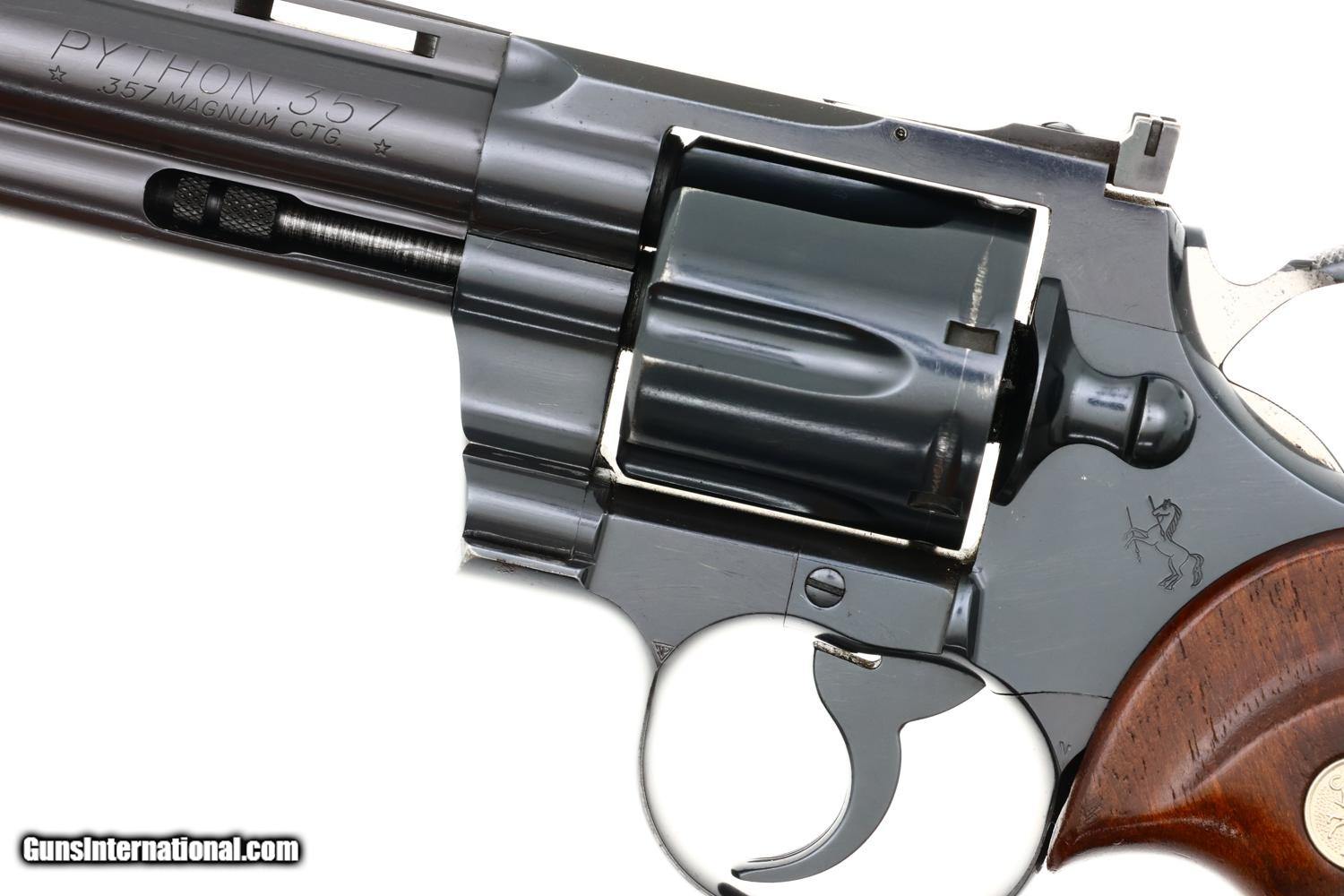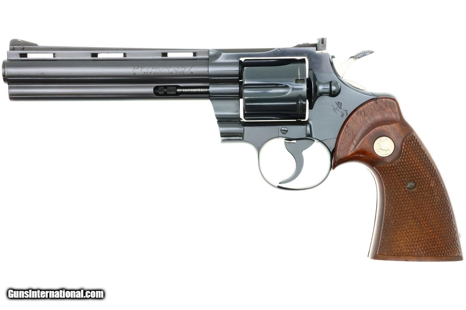 Early production Colt Python .357 Magnum Revolver, SN: 16831, made 1961, with 6-inch barrel, Colt Royal Blue finish. Usual serrated ramp front sight, now with a segment of white paint, and fully adjustable Elliason type rear sight. SN: 16831 is stamped on both frame and crane. Left side of barrel marked "PYTHON .357/.357 MAGNUM CTG" with Rampant Colt on frame; the right side marked "COLT'S PT. F.A. MFG. CO. HARTFORD CT USA". Target hammer and checkered brown wooden target grips with silver Colt medallions. The Python earned its reputation as "the Rolls-Royce of Colt revolvers" according to historian R.L. Wilson and was described by firearms historian Ian V. Hogg as "the best revolver in the world," renowned for its exceptional accuracy, smooth trigger pull, and precise cylinder lock-up.