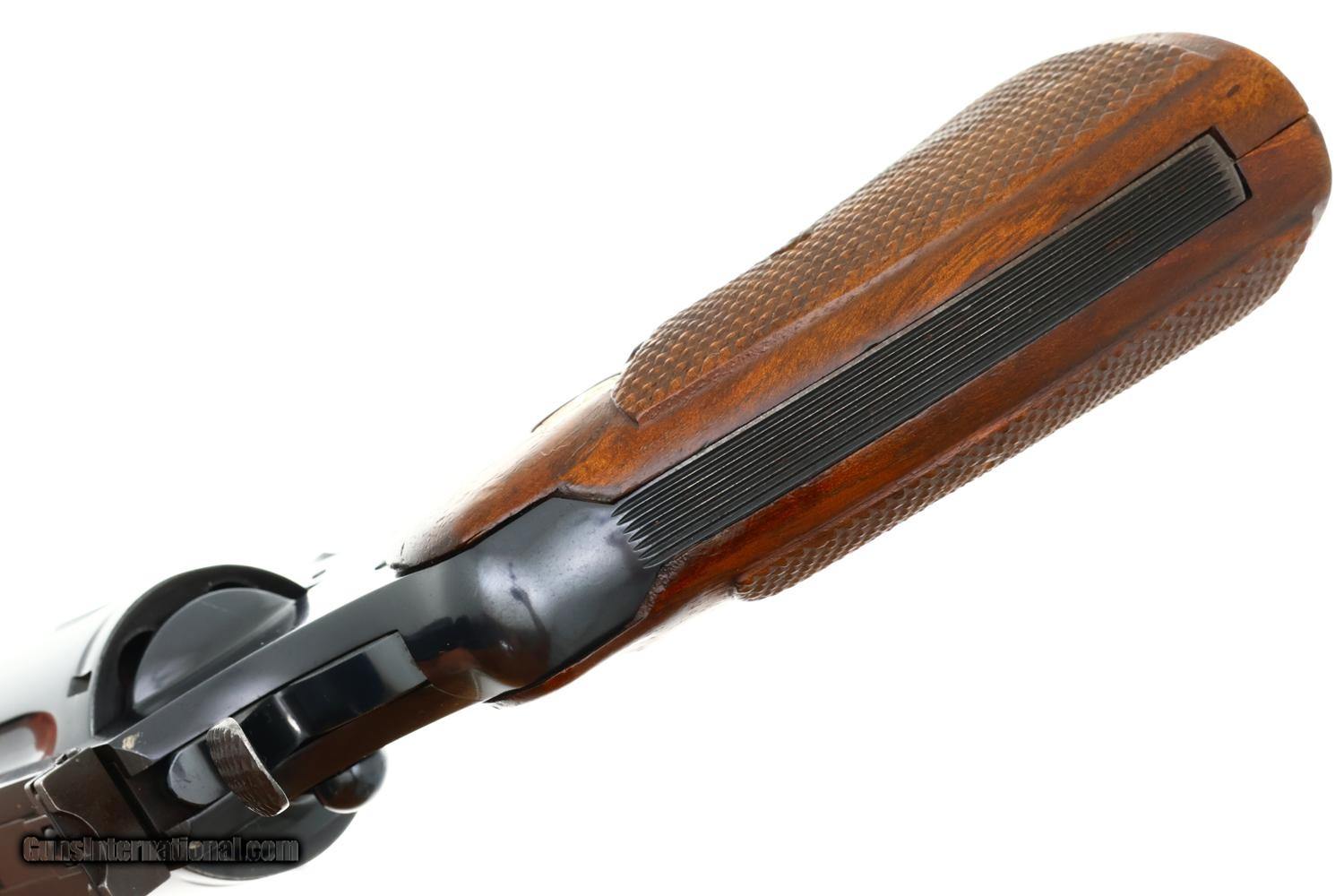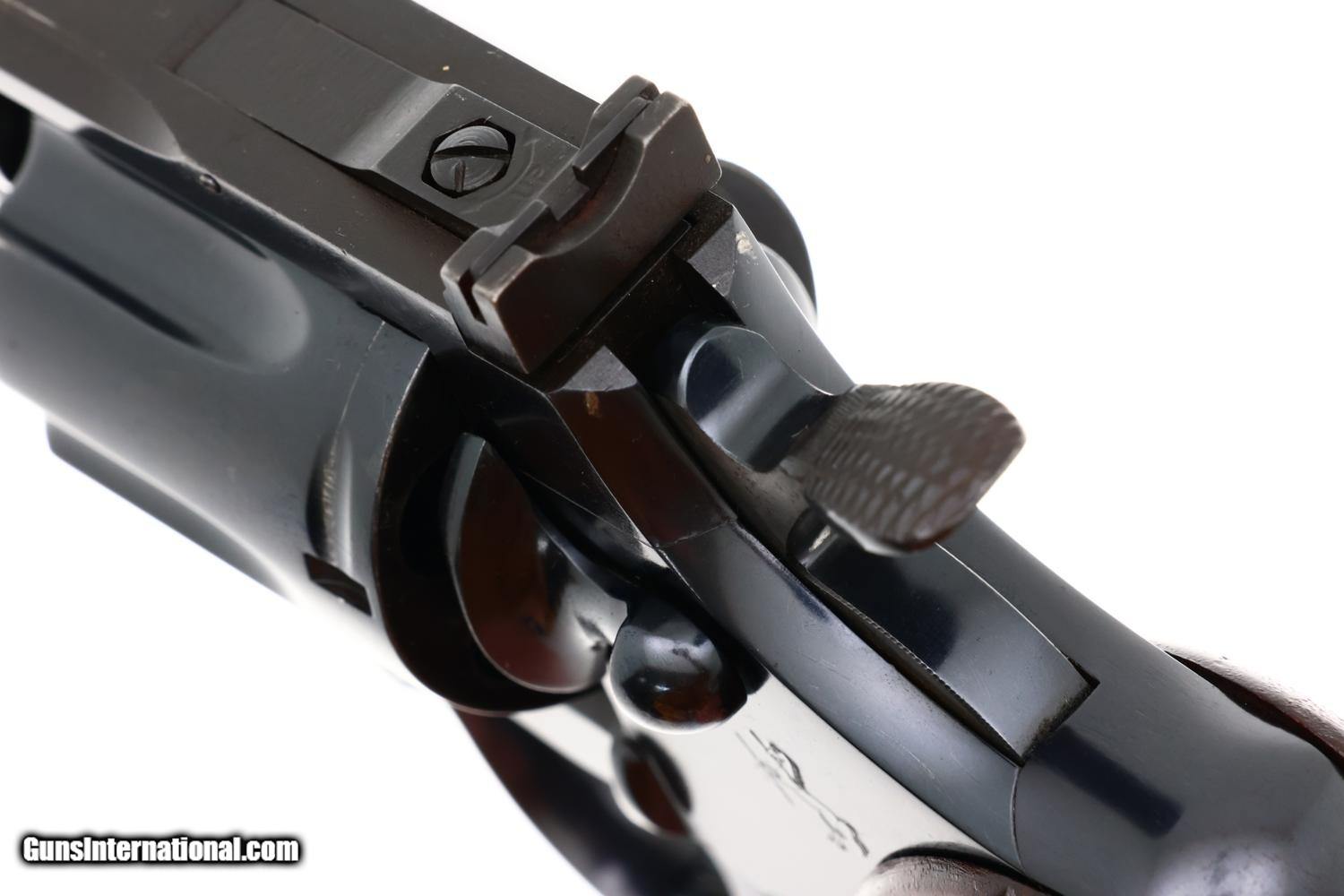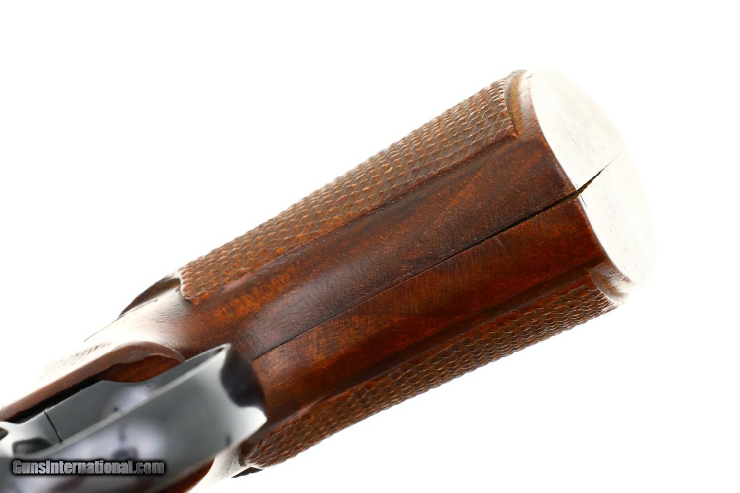 Near excellent original finish with light wear around muzzle and leading edge of cylinders consistent with having been holstered. Bright illumination shows some cold blue in these areas and over the ejector rod housing. Bright sides of hammer, mainly the right, with mild staining and oxidative flecking. Grips with sharp checkering and a few handling marks, most noticeable over their base. Mirror bright bore. Correct manual mechanics.