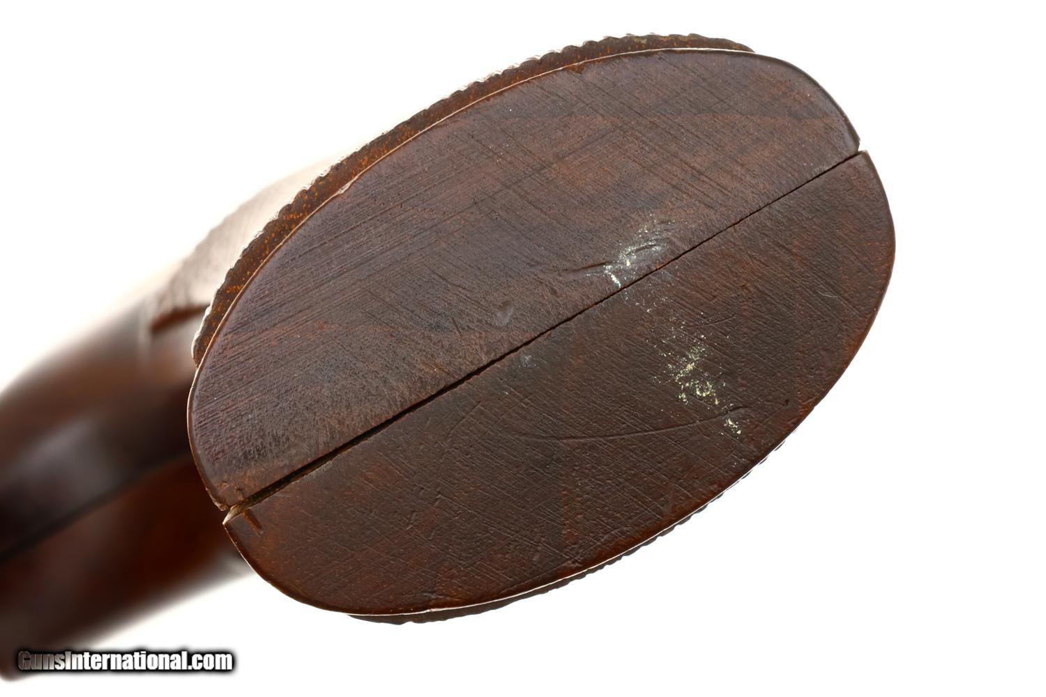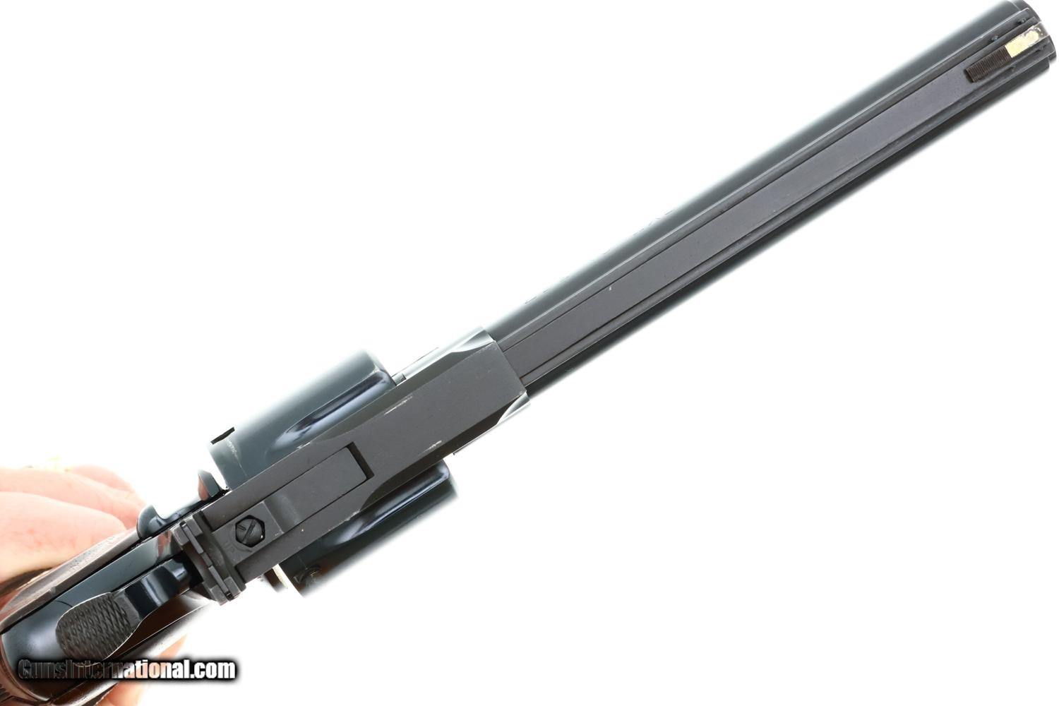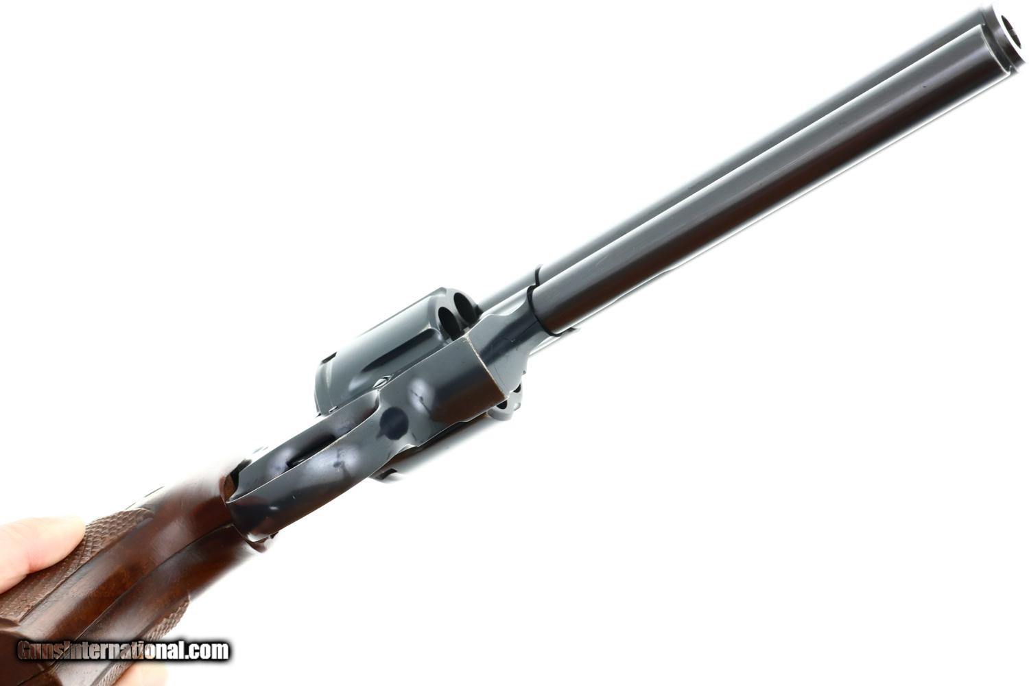 Near excellent original finish with light wear around muzzle and leading edge of cylinders consistent with having been holstered. Bright illumination shows some cold blue in these areas and over the ejector rod housing. Bright sides of hammer, mainly the right, with mild staining and oxidative flecking. Grips with sharp checkering and a few handling marks, most noticeable over their base. Mirror bright bore. Correct manual mechanics.