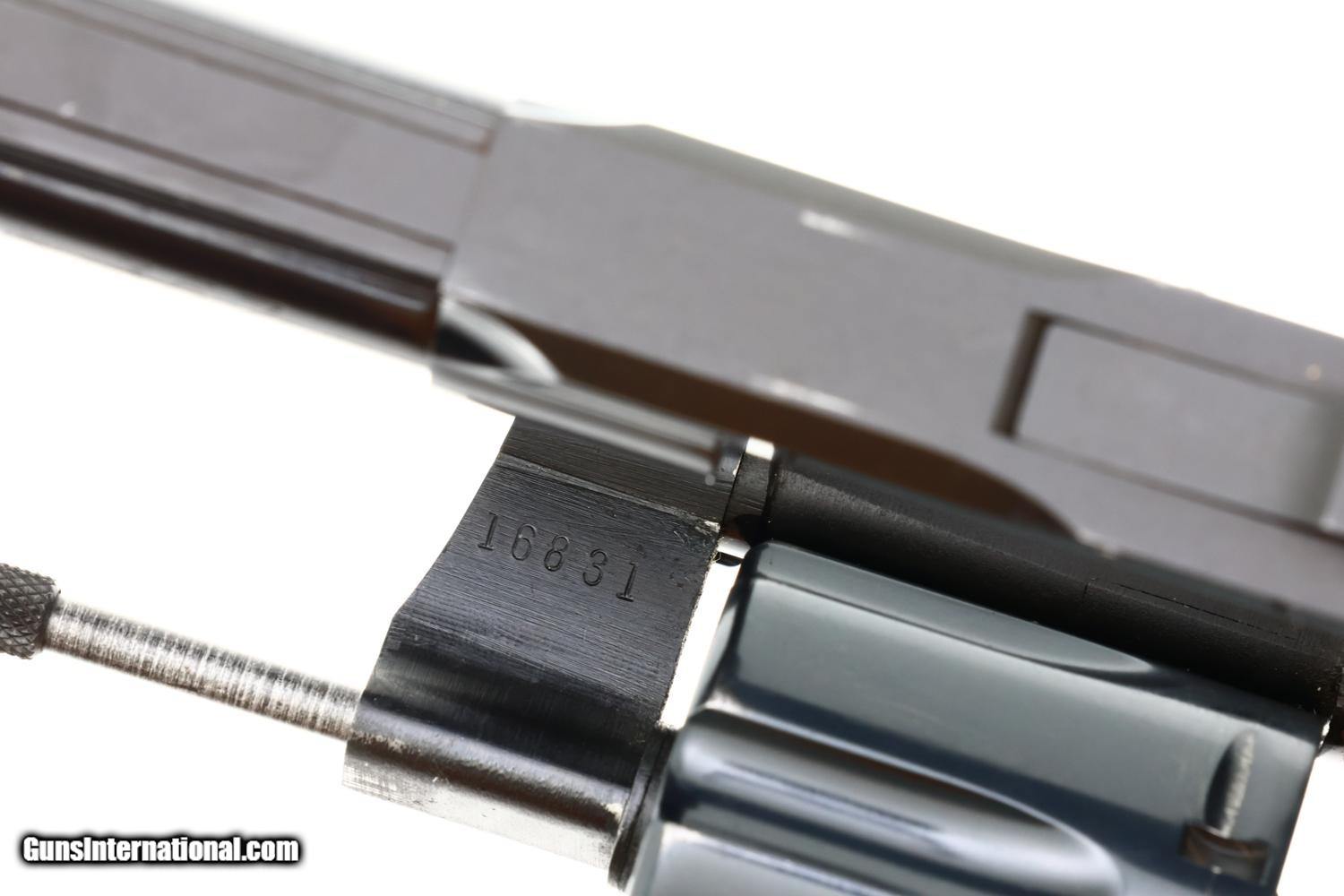 Description: Synopsis: Near excellent original condition Colt Python revolver with 6 inch barrel, Royal Blue finish, made in 1961, with a mirror-bright bore. Perfect for collecting and with just enough wear to take to the range without recrimination! Description: Early production Colt Python .357 Magnum Revolver, SN: 16831, made 1961, with 6-inch barrel, Colt Royal Blue finish. Usual serrated ramp front sight, now with a segment of white paint, and fully adjustable Elliason type rear sight. SN: 16831 is stamped on both frame and crane. Left side of barrel marked "PYTHON .357/.357 MAGNUM CTG" with Rampant Colt on frame; the right side marked "COLT'S PT. F.A. MFG. CO. HARTFORD CT USA". Target hammer and checkered brown wooden target grips with silver Colt medallions. The Python earned its reputation as "the Rolls-Royce of Colt revolvers" according to historian R.L. Wilson and was described by firearms historian Ian V. Hogg as "the best revolver in the world," renowned for its exceptional accuracy, smooth trigger pull, and precise cylinder lock-up. Condition: Near excellent original finish with light wear around muzzle and leading edge of cylinders consistent with having been holstered. Bright illumination shows some cold blue in these areas and over the ejector rod housing. Bright sides of hammer, mainly the right, with mild staining and oxidative flecking. Grips with sharp checkering and a few handling marks, most noticeable over their base. Mirror bright bore. Correct manual mechanics. Manufacturer: Colt Model: Python Serial Number: 16831 Caliber Info: .357 Magnum Condition: EXC Price: $2,995.00 Contact Seller |