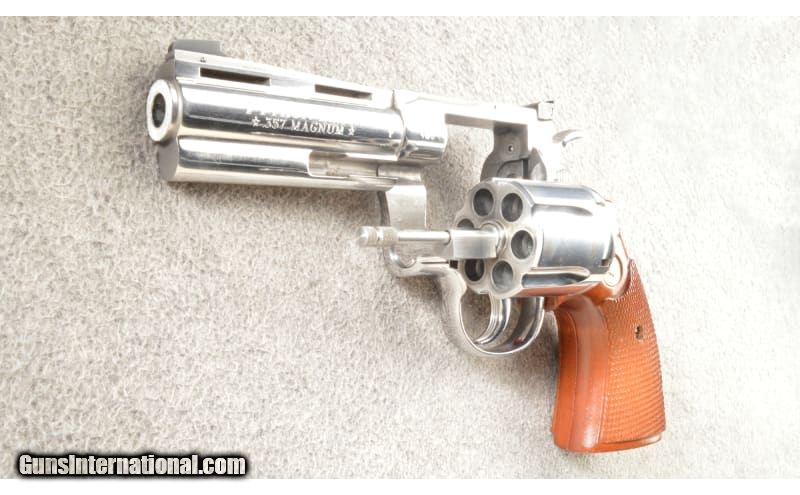 Description: Colt Python Elite chambered in 357 Magnum with a 4" vent rib barrel. This gun was manufactured in 1996 and features a polished stainless steel finish with the left side barrel roll-marked "PYTHON ELITE", adjustable rear sight, checkered hardwood grips with gold Colt medallions. Import marked in the crane area. Overall, in excellent condition. .357 Magnum SOLD Chambers: 6 shot revolver. Metal Condition: Normal light use with fine surface scratches. Wood Condition: Grips have excellent checkering with a ding in the right grip at the bottom edge. Bore Condition: Bright bore with strong rifling. Barrels: 4" barrel. Triggers: SA/DA. Weight: 2.5 lbs Item Location: Owatonna, MN |