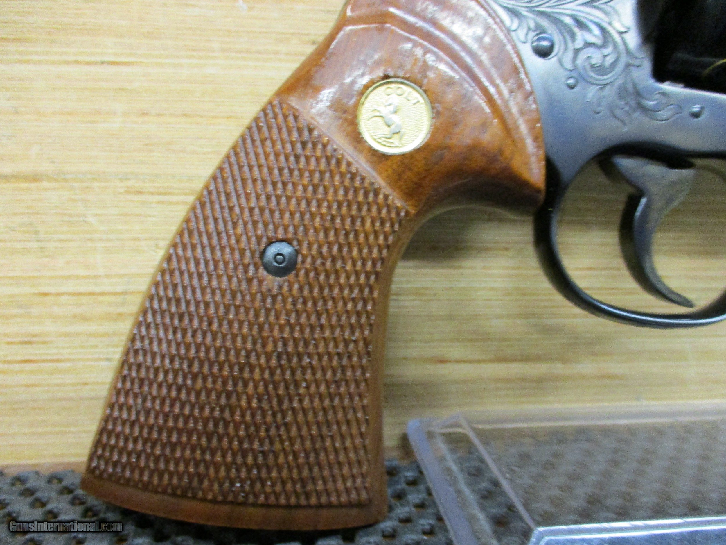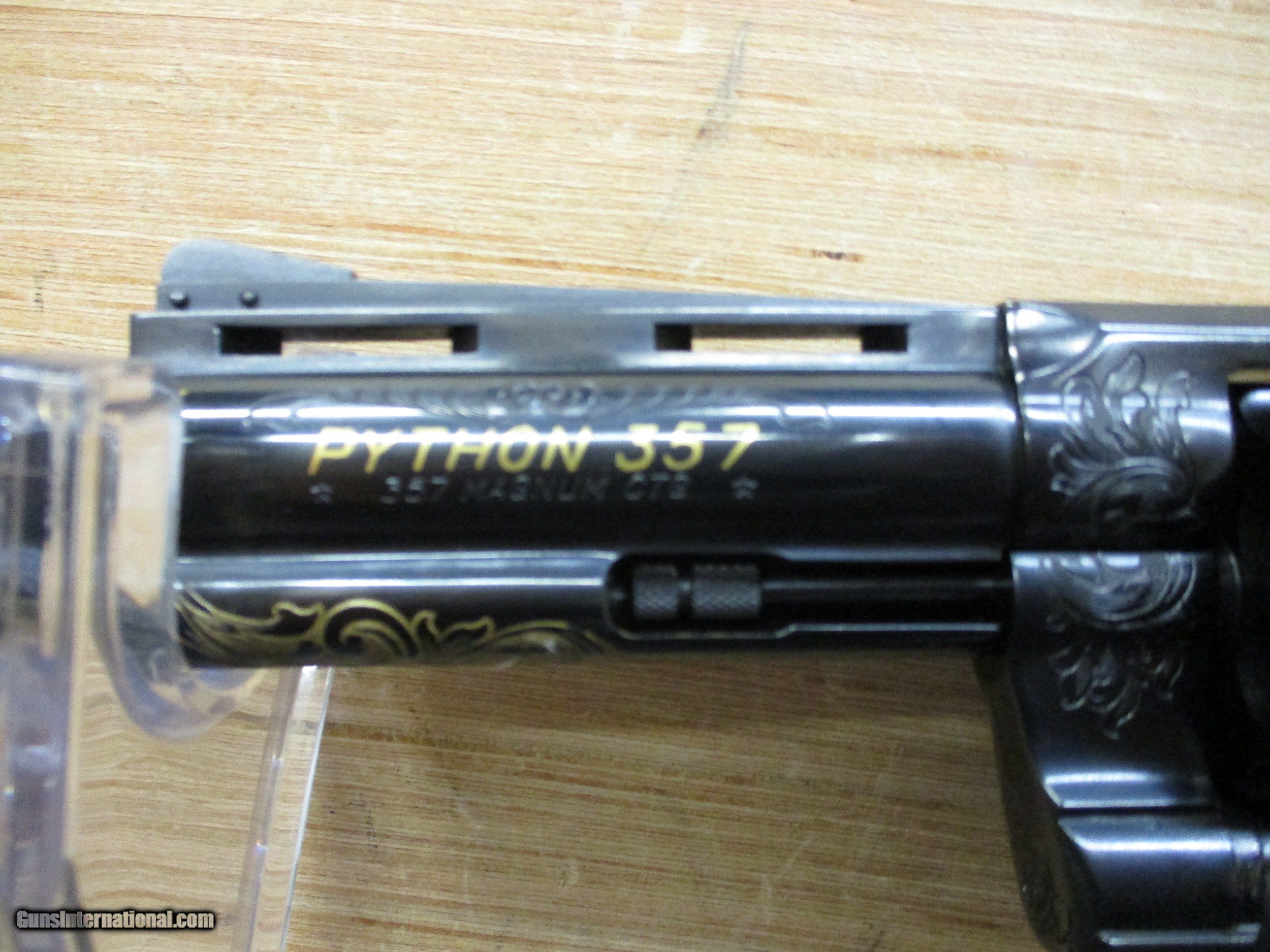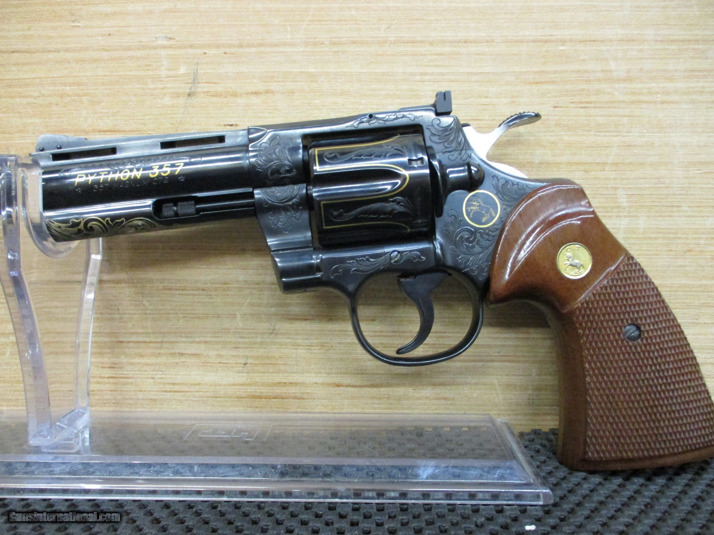 Description: CONSIGNMENT LIKE NEW IN BOX COLT PYTHON ENGRAVED GOLD .357 MAG -- 4" BARREL -- COLT CHECKERED WOOD GRIPS COMES WITH WITH FOAM BOX & SLEEVE -- COMPANION MANUAL -- FACTORY TARGET WAS MAKE IN 1979 ****PLEASE CALL IN THE WITH THE SELLER’S INVENTORY NUMBER IF INQUIRING ABOUT A FIREARM****** WE DO NOT SHIP FIREARMS AND/OR FIREARMS’ PARTS OUT OF THE 50 UNITED STATES, SO DON’T ASK—YOU NEED TO KNOW IF FIREARM IS LEGAL FOR YOUR STATE PRICE REFLECTS PAYMENT BY MONEY ORDER / CASHIERS CHECK. A 3% PREMIUM IS ADDED FOR CREDIT CARDS. WE DO ACCEPT PERSONAL OR BUSINESS CHECKS, BUT THERE IS A GRACE PERIOD OF 10 BUSINESSS DAYS ON THEM. Shipping is $40 for handgun and $30 for long gun. Shipping to Alaska and Hawaii will be more based on weight of firearm. WE DO OFFER LAYAWAY PLANS FOR 30,60, OR 90 DAYS. THERE IS A $5.00 CHARGE FOR EVERY 30 DAYS ITEM IS ON LAYAWAY. WE ALSO REQUIRE A 20% DOWN PAYMENT ON TOTAL OF LAYAWAY SALE. LAYAWAYS ARE NON- REFUNDABLE. HERE IS HOW THIS PROCESS WORKS. YOU WOULD CALL US AT 540-337-9218 WITH LISTER # TO PURCHASE THE GUN. THEN ONCE I HAVE RECEIVED PAYMENT AND AN FFL (FEDERAL FIREARMS LICENSE) FROM A LICENSED DEALER IN YOUR AREA OF YOUR CHOICE. WE WILL THEN SHIP THE GUN TO THEM. YOU WOULD THEN PICK UP THE GUN AT YOUR LOCAL DEALER AND DO PAPER WORK THERE. Please have your FFL Dealers contact information when you call. DOMINION OUTDOORS 15 ANGELA COURT FISHERSVILLE, VA 22939 540-337-9218 540-337-2422 fax M – F 9 a.m. to 6 p.m. ETZ Sat 9 a.m. to 4 p.m. ETZ ****PLEASE CALL IN THE WITH THE SELLER’S INVENTORY NUMBER**** ***PLANO HARD CASES AVAIABLE FOR PURCHASE $19.99 WITH THE PURCHASE OF A FIREARM** *** Online prices compared to in store prices will vary. *** SOLD |