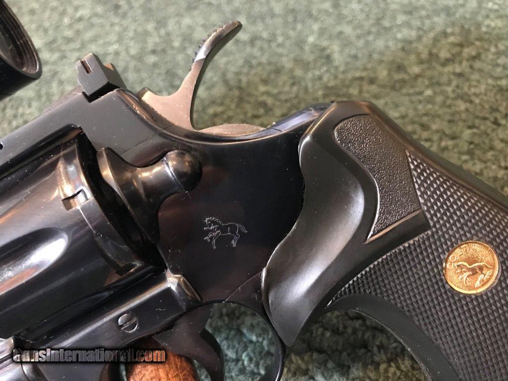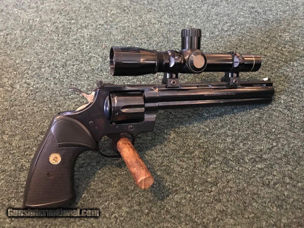 Description: Colt, Python, Hunter, .357 mag, made in 1980, revolver,Colt M8-2X extended eye relief marked Colt Leupold scope, 98% overall condition, comes with Halliburton case, papers, tools, and one box of Remington Peters soft point ammo (50 rounds) purchased with gun. The gun shoots very well and has taken whitetail deer, havalena and wild boar. (6 shots at 100 yrs. with 3" group) Serial # VA1613. For further information call John at 941-748-7318. SOLD |