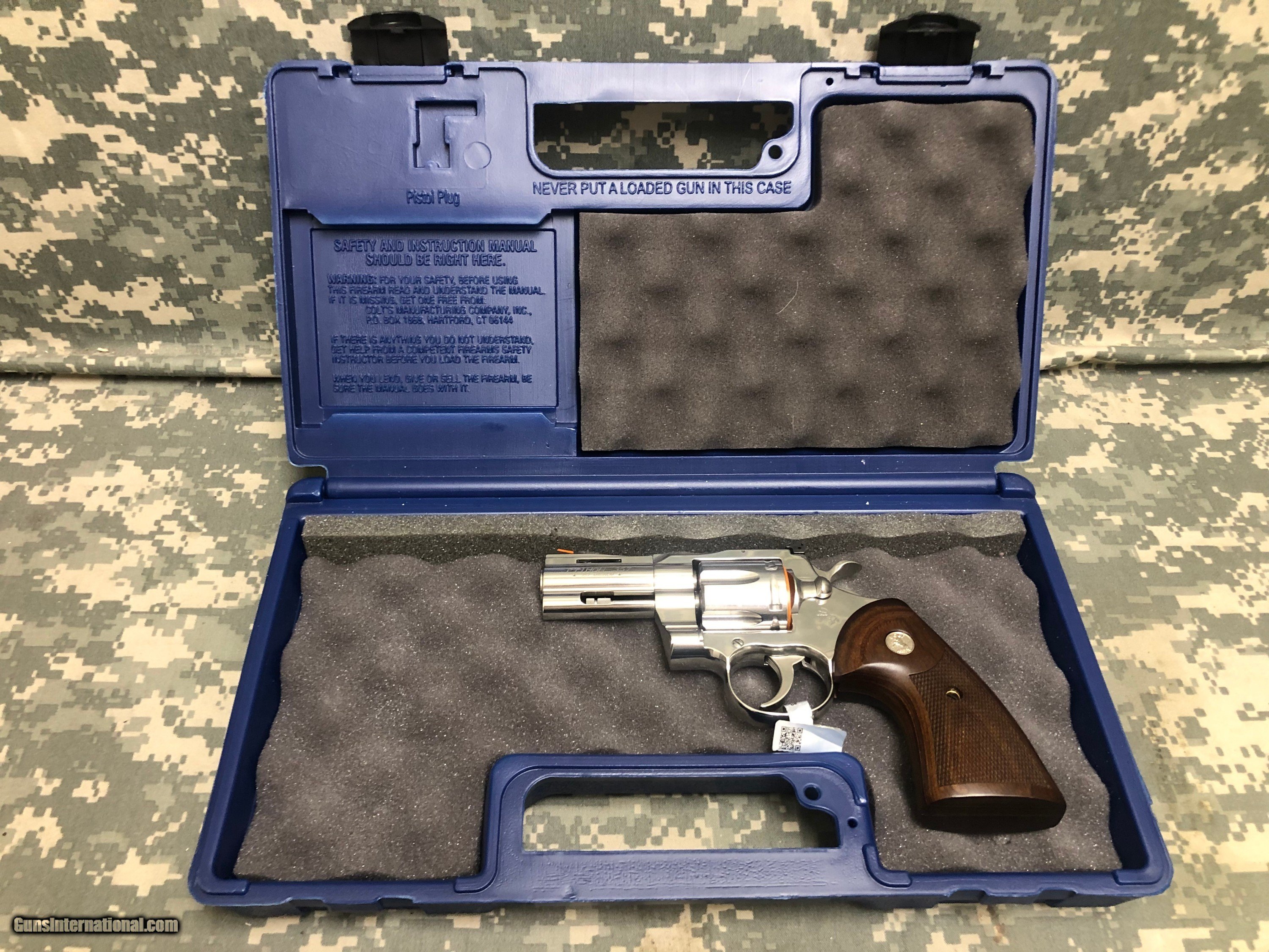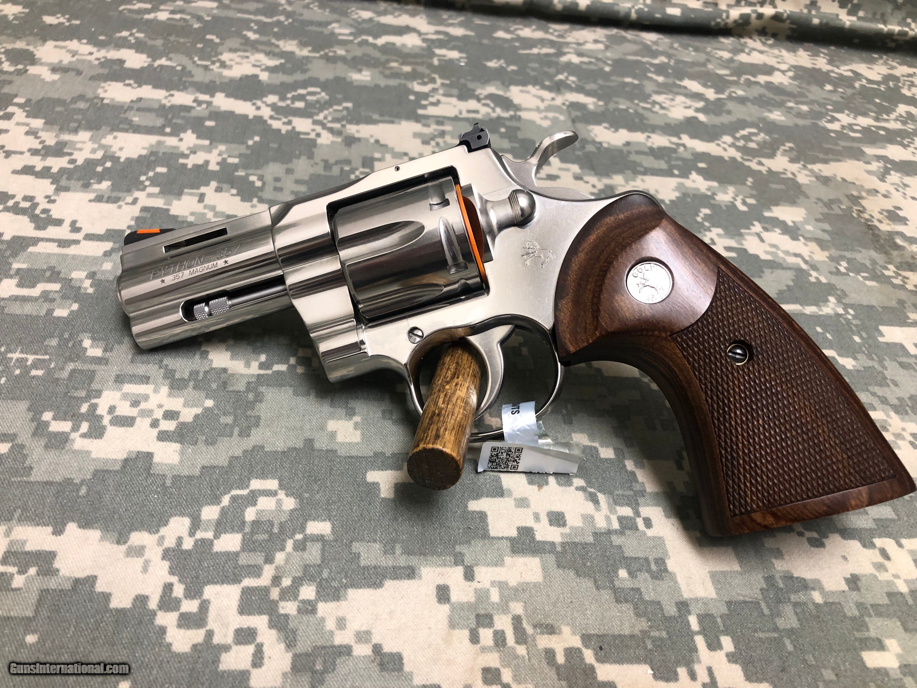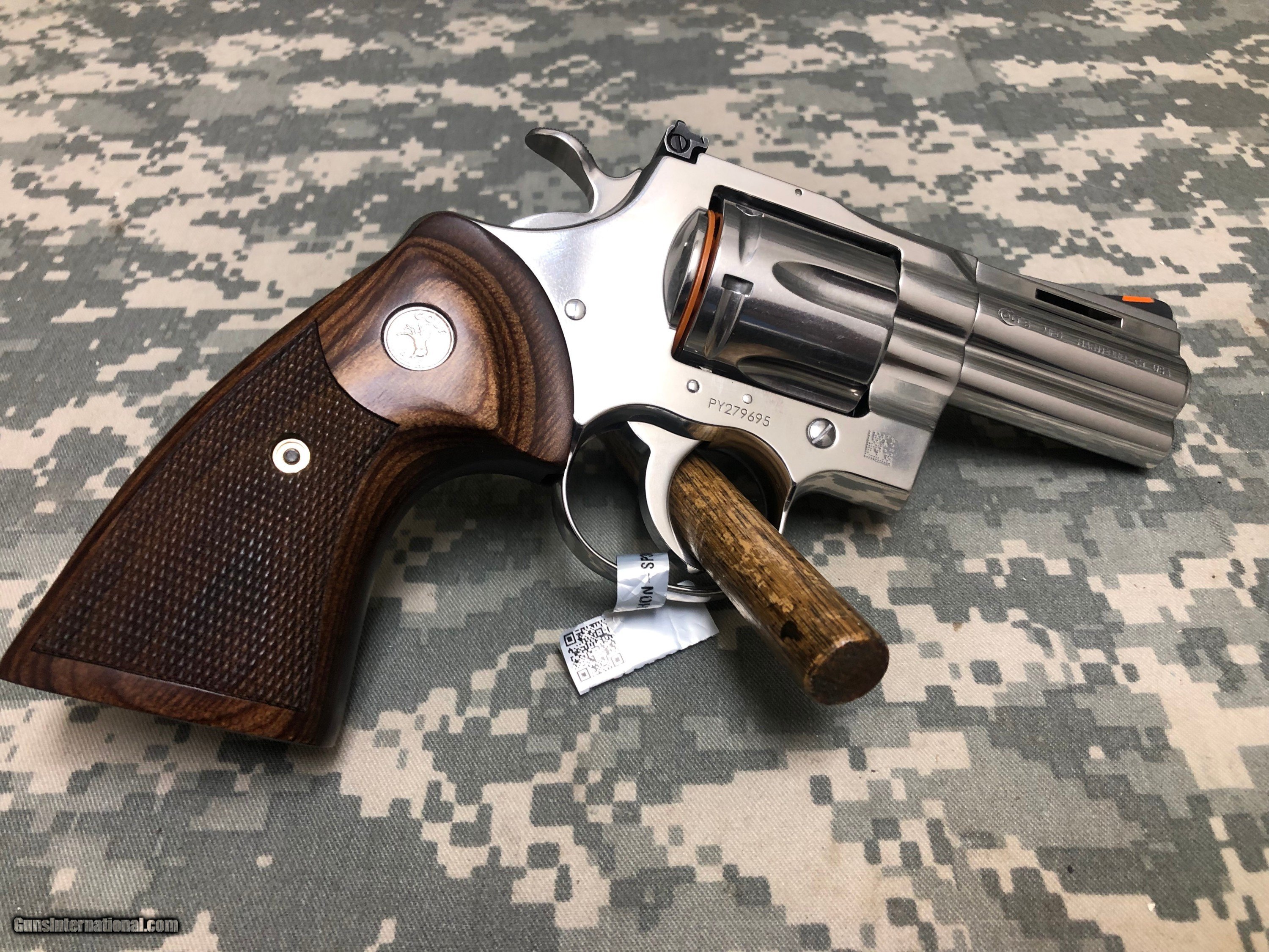 Description: Colt Python in Stainless Steel chambered for 6 rounds of 357 Magnum (also 38 Special). New-in-Box condition. Metal finish is excellent. Factory grips are checkered walnut and are also in excellent in very good condition. Crown is unblemished and bore is mint. Comes with the original factory box, and plastic disk empty chamber indicator. 3” barrel with Hi-Viz orange on ramped blade front sight and adjustable (elevation and windage) square-notch rear sight. Full under-lug and vented rib. Please review the several photos to help you evaluate this handgun. Care was taken to provide clear detail when ZOOM’d in! Pricing based on a 3% Cash Discount. For credit card purchases add 3% for loss of that discount Our Standard shipping is 2nd Day for $60.00; add $20 for Insurance SOLD Manufacturer: Colt Model: Python Serial Number: PY279695 Barrel Length: 3 Condition: NIB-unfired Metal Condition: 99% Wood Condition: 99% Bore Condition: Mint |