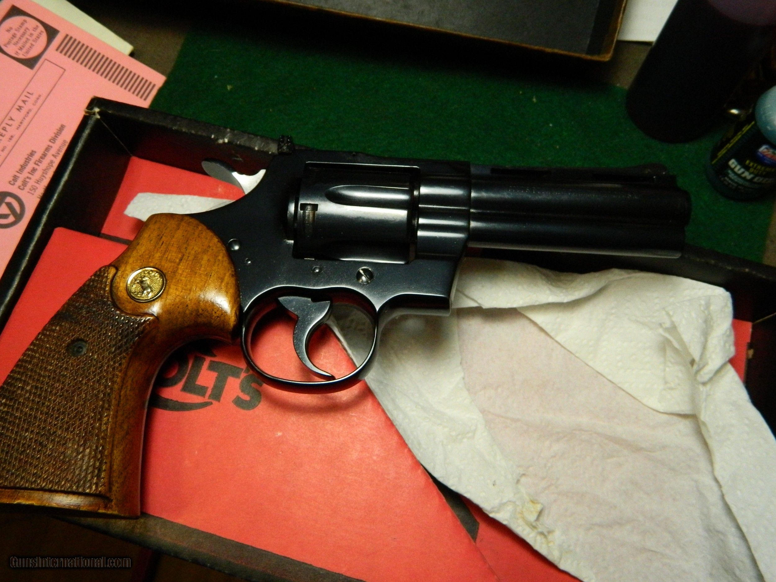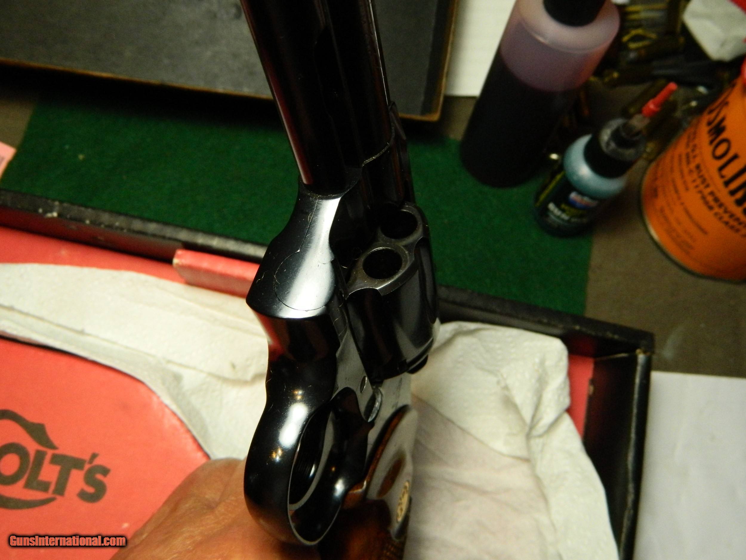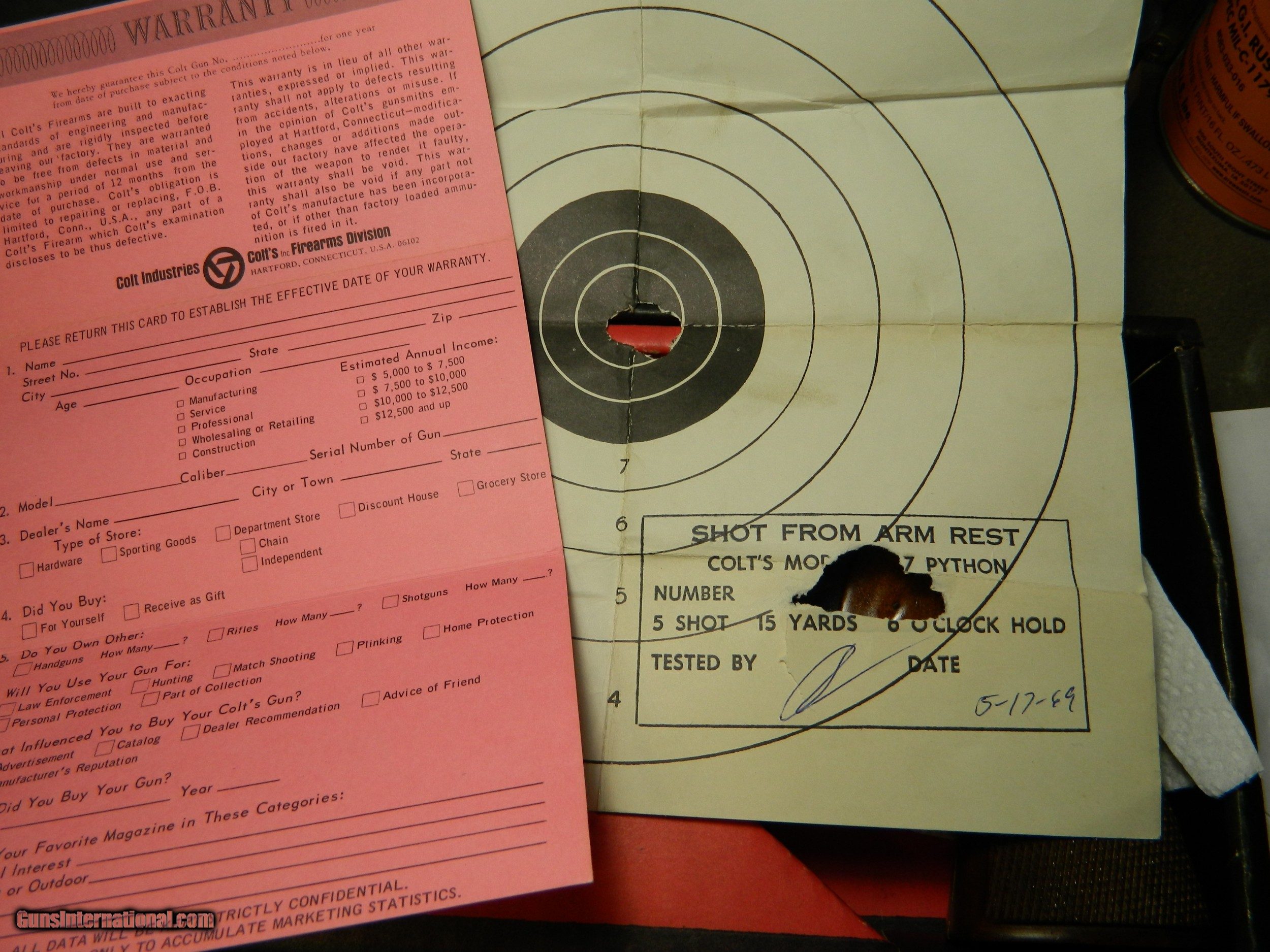 Description: we have in on consignment a absolue super Colt python that was made in 1969. this beautiful colt is in it's original box, with warranty card and the test target. this is an investment piece. Please look at pictures to see condition. if you need more pictures please ask. hard to improve upon !!!! If you are wondering about the target, there was a small piece of tape, and when removed it tore the serial number off. the timing and lockuo are like the day it left the factory. gun appears to have been test fired only !!!!! SOLD |