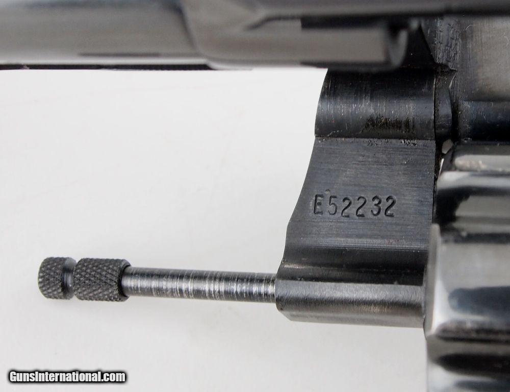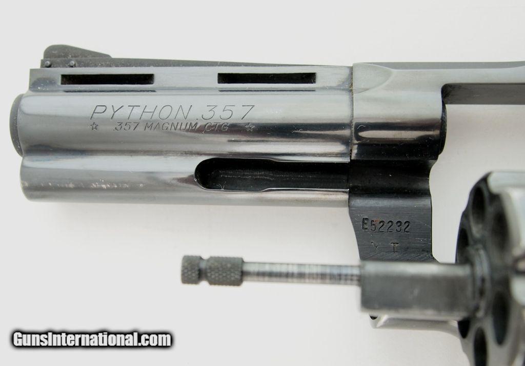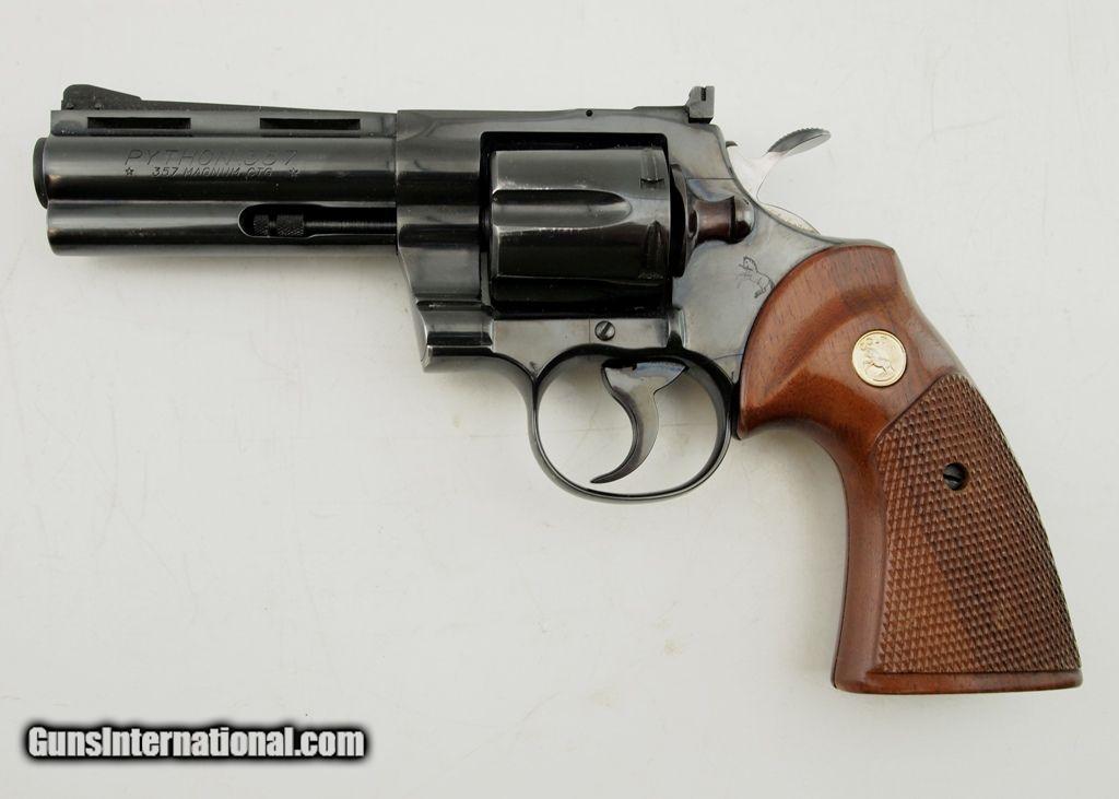 Description: Colt Python MFG 1972 .357 MAG, 4" vented rib full lug bbl, shiny bore, good rifling, adjustable notch rear sight, ramp front sight, blued finish, cylinder release has turned a nice shade of plum, minor holster wear on barrel - cylinder, and nice checkered Walnut grips with Colt medallions inset. Add 3% for Credit Card Shipping $25.00 SOLD |