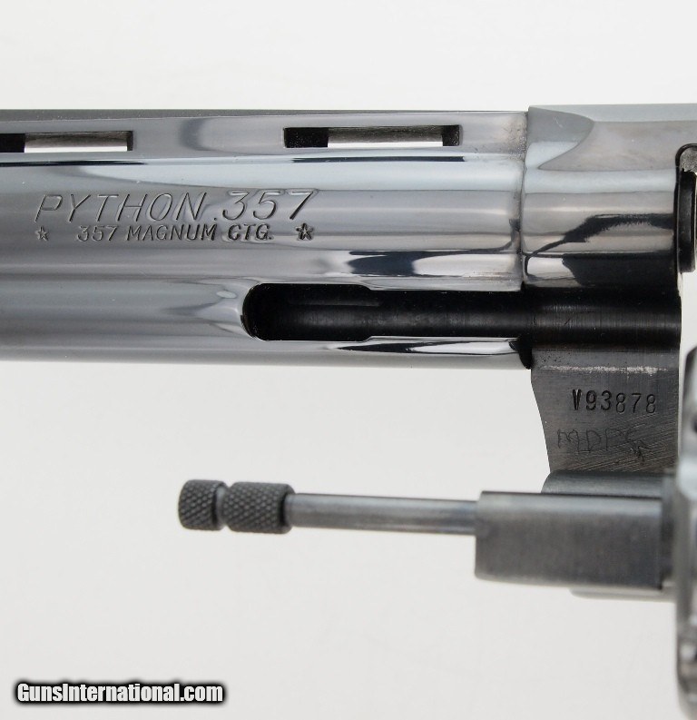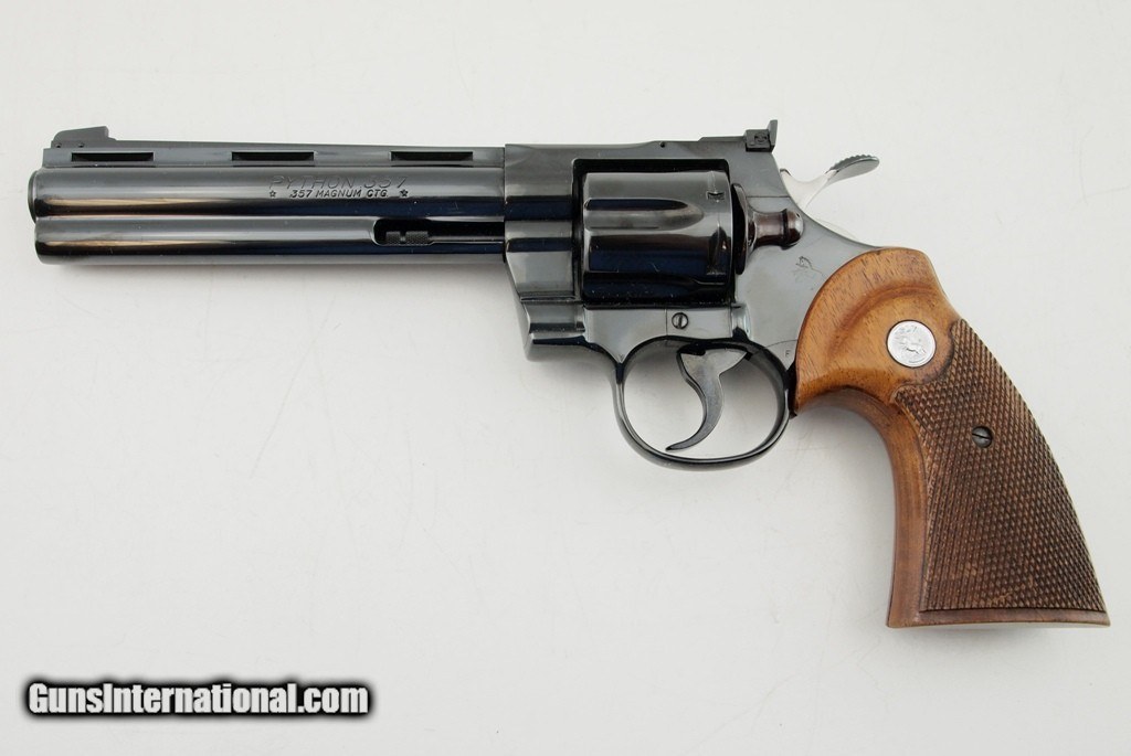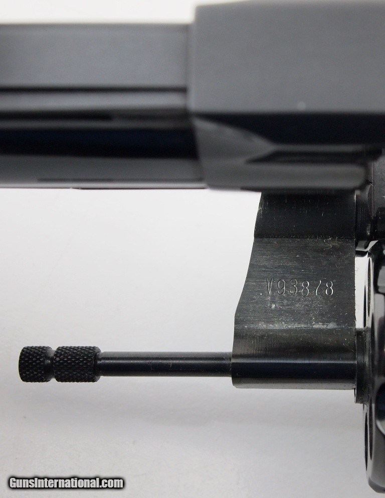 Description: Colt Python MFG 1979 .357 Mag, 6" vented rib full lug bbl, shiny bore, good rifling, blued finish (has been professionally re-blued), adjustable notch rear sight, blade front sight, serrated trigger, knurled hammer, serrated back strap, has "MDPS" etched on frame under the serial number, and very nice checkered walnut grips with inset Colt medallions. Add 3% for Credit Card Shipping $25.00 SOLD |