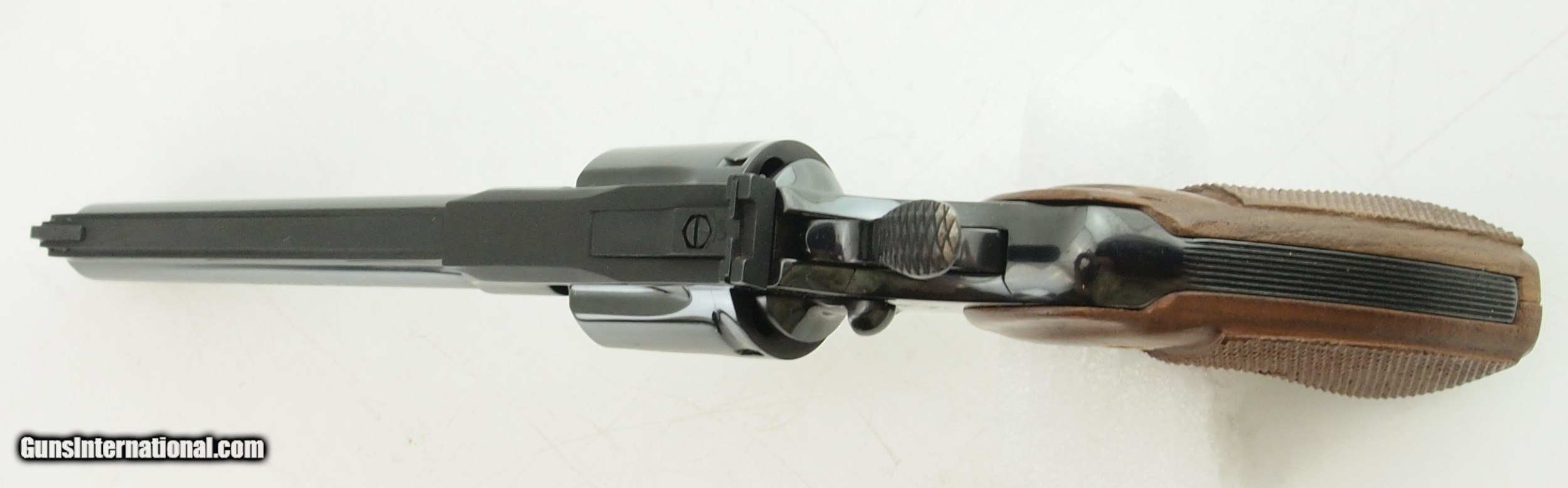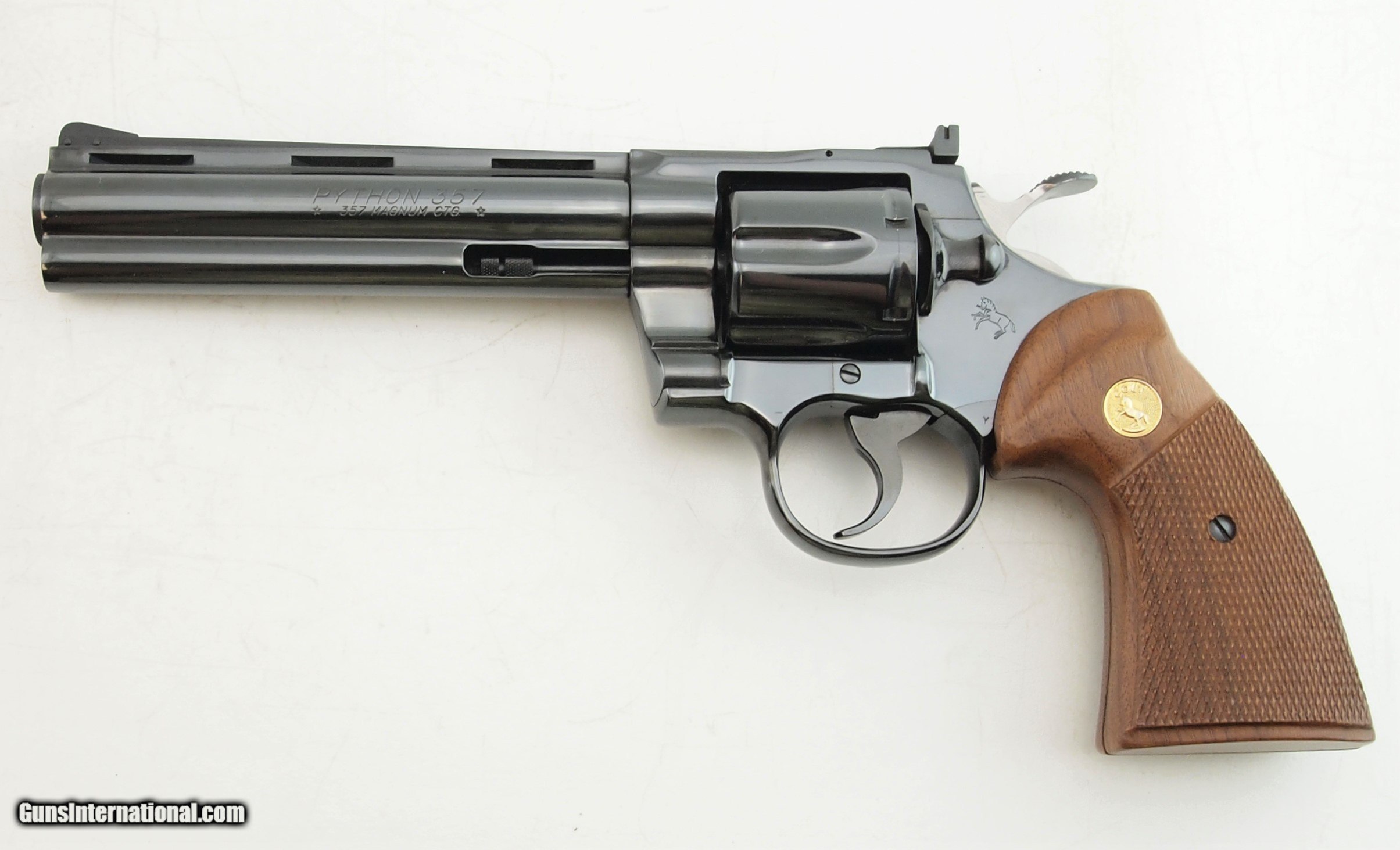 Description: Gorgeous Colt Python MFG 1979 .357 Mag WCase, 6" vented rib bbl, bright shiny bore, strong rifling, blued finish, adjustable rear notch sight, ramp front sight, target trigger and hammer, serrated back strap, excellent Colt medallion checkered wood grips, and original instruction manual. Great Python for your collection. Add 3% for Credit Card Shipping $25.00 SOLD Handgun Caliber: .357 Magnum |