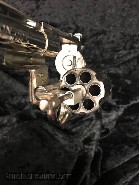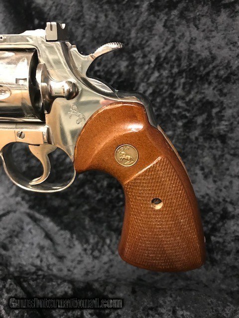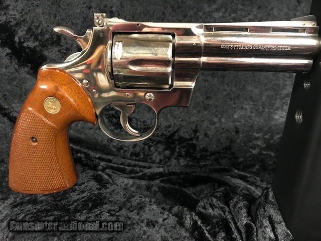 Description: This factory nickel Colt Python 4" in .357 Magnum is ready for the range! Original nickel finish is very good, with just a bit of loss on the high edges of the cylinder, likely from sitting in a holster for some time. The balance of the gun is much better, with just the usual whisper-light scratches consistent with light use, but otherwise bright. Original wood grips are excellent, with almost all of their factory varnish still intact and no chips, cracks, or dings. Bore and chambers are clean, as is the recoil shield. Gun times correctly and locks up like a bank vault, typical for these fine guns. A great Python for the collector who's looking for one that you won't feel bad about shooting! SOLD Manufacturer: Colt Model: Python Serial Number: 96962 Caliber Info: .357 Magnum |