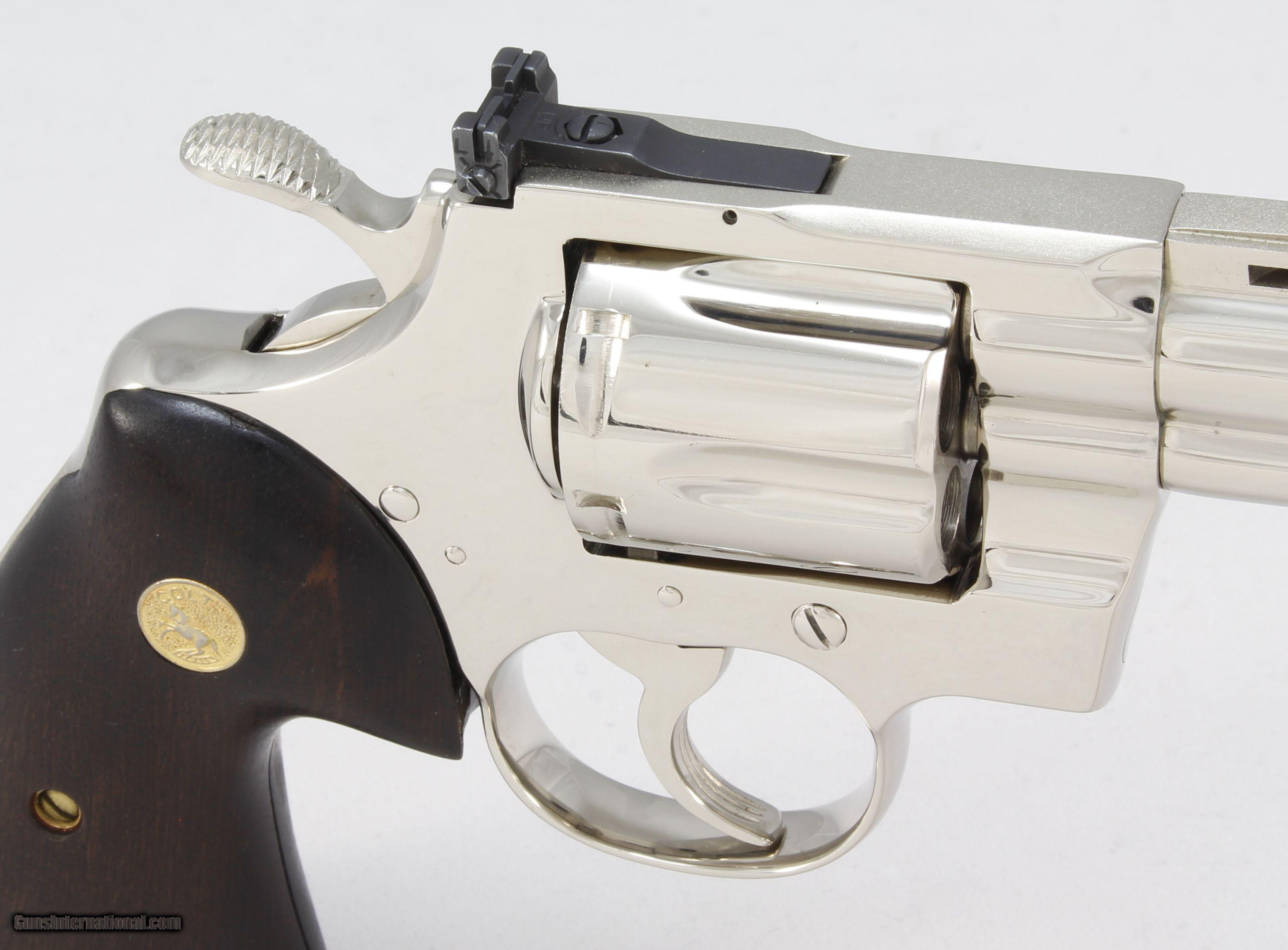Description: COLT PYTHON, 357MAG, 4" Barrel, Nickel Plated, Unfired Condition, SN#V50585, MFG: 1966. Unique Indian Rosewood Grips, Grips Marked on back of Grips as Indian Rosewood. Fine Walnut Display Case. Ships to Lower 48, W/Insurance: $50.00 SOLD Manufacturer: COLT Model: PYTHON Serial Number: V50585 Caliber Info: 357 MAG Bore: LNEW Condition: LNEW Metal Condition: LNEW Finish: NICKEL |