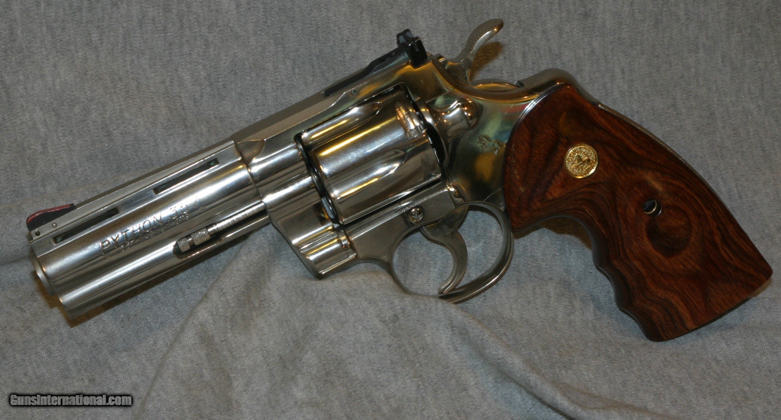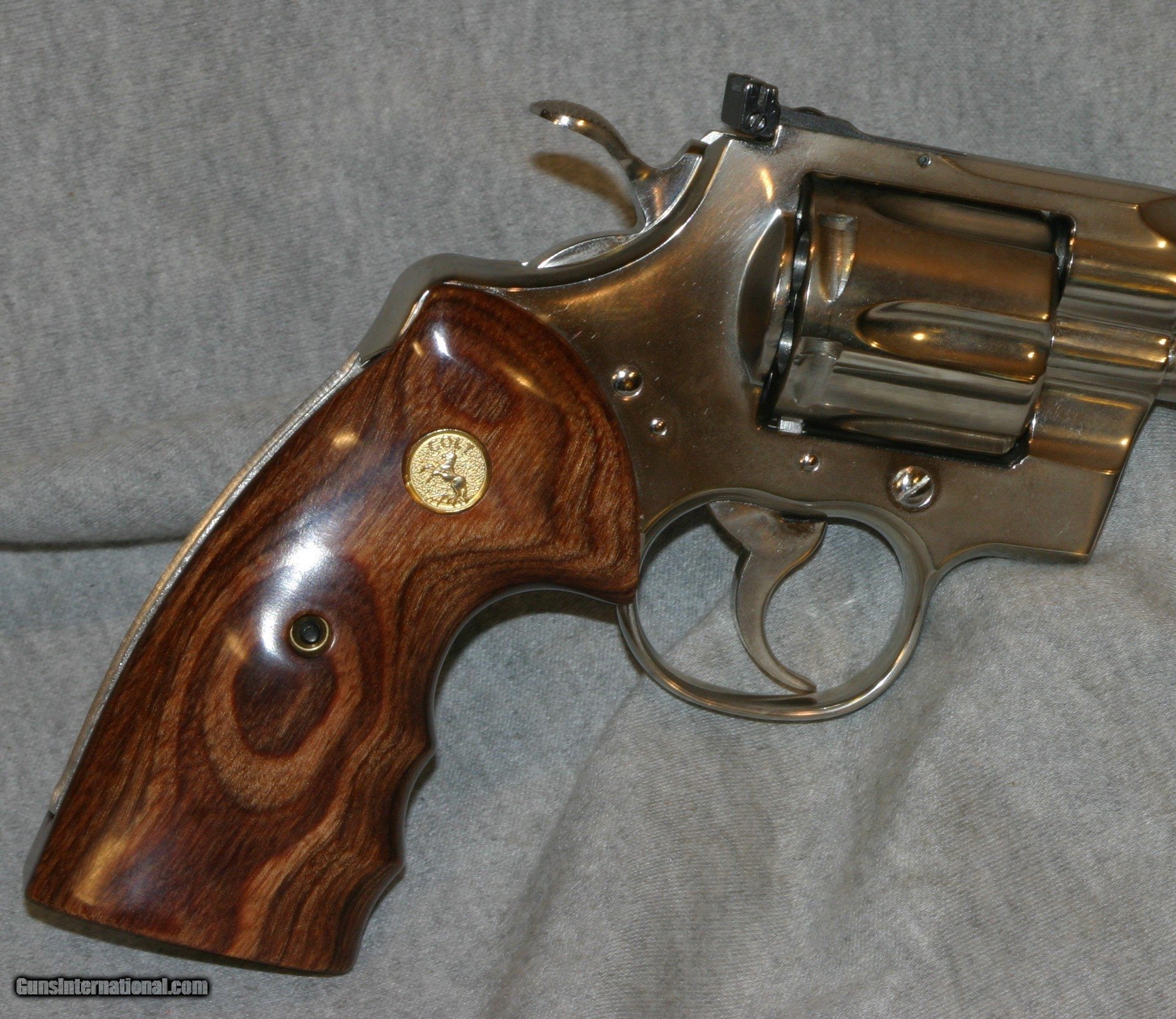 Description: CLEAN 1973 NICKLE PYTHON WITH REPLACMENT BLUE PLASTIC COLT BOX AND LATER COLT COMBAT GRIPS. SOLD |