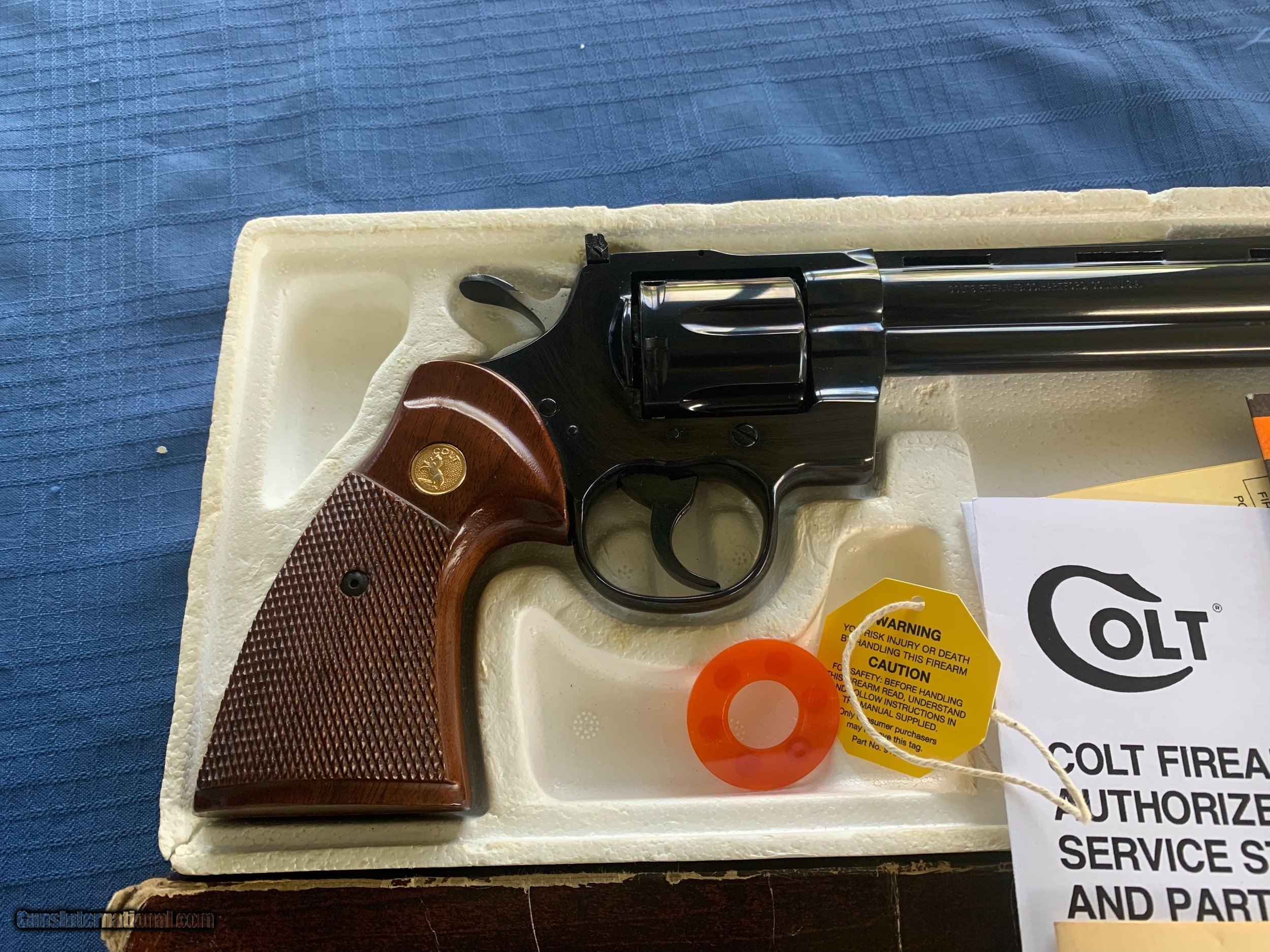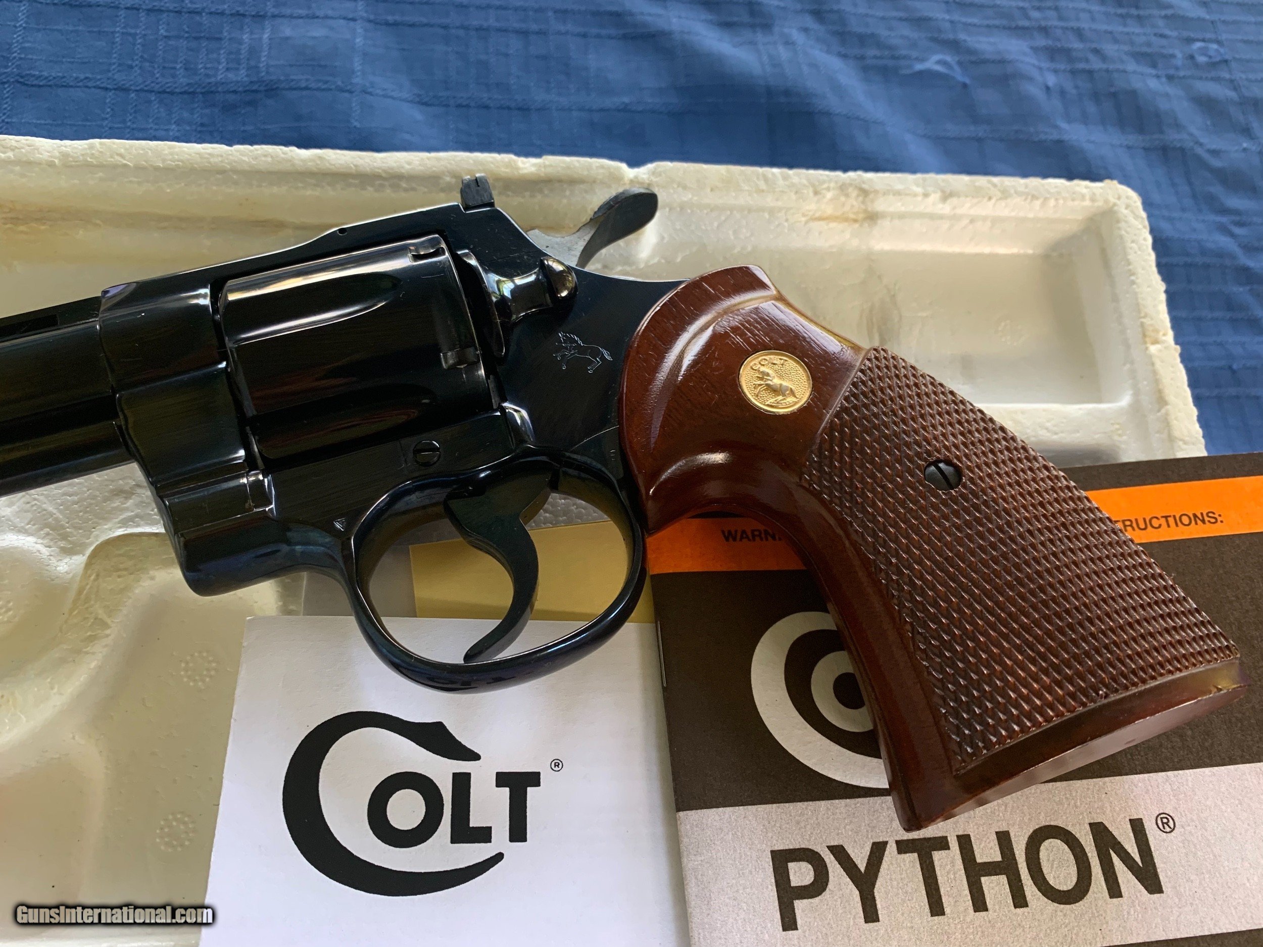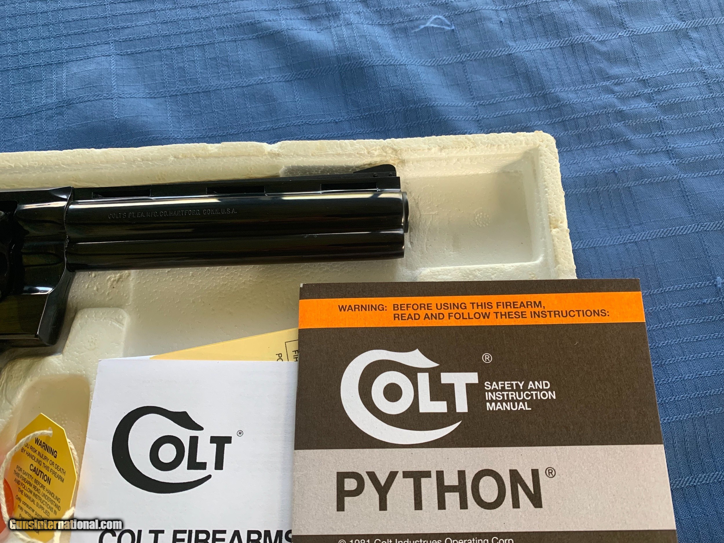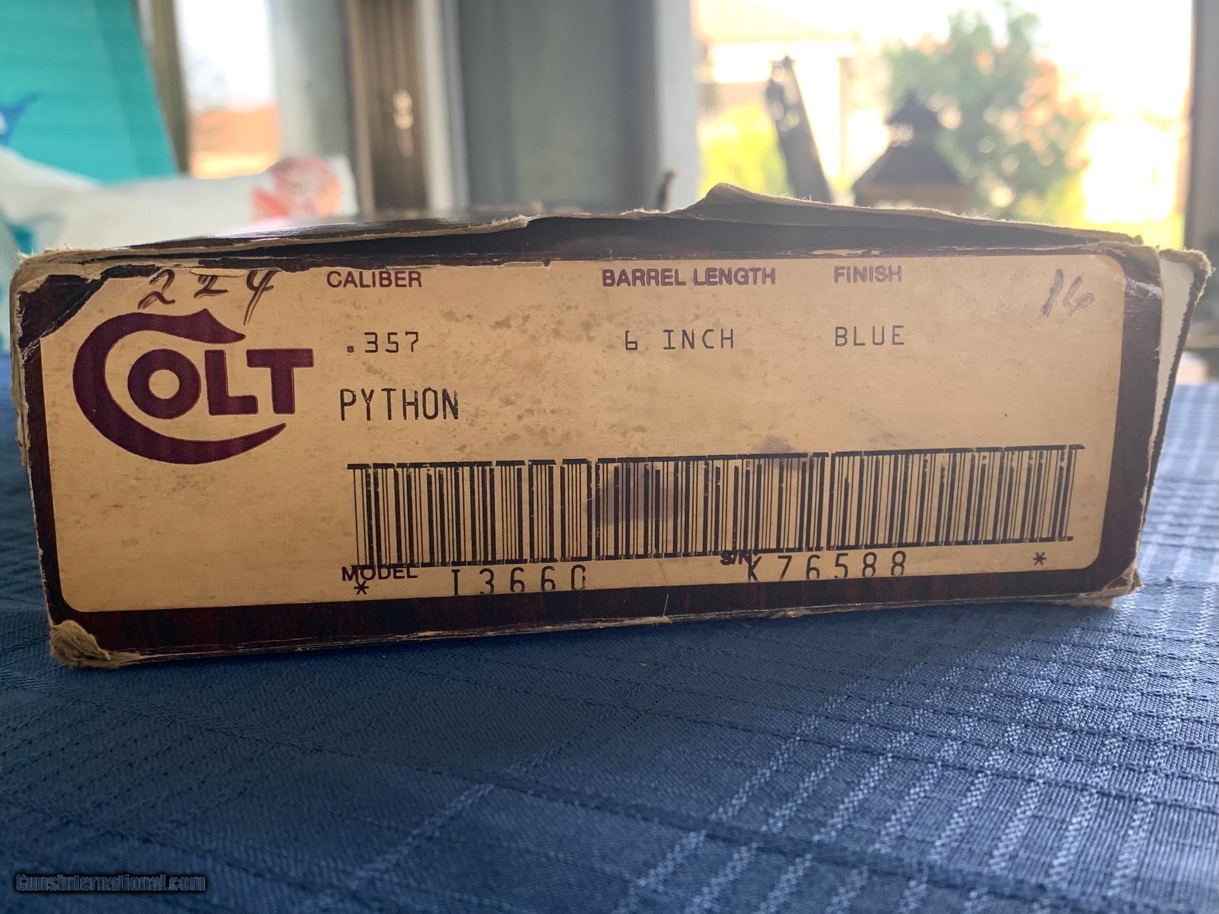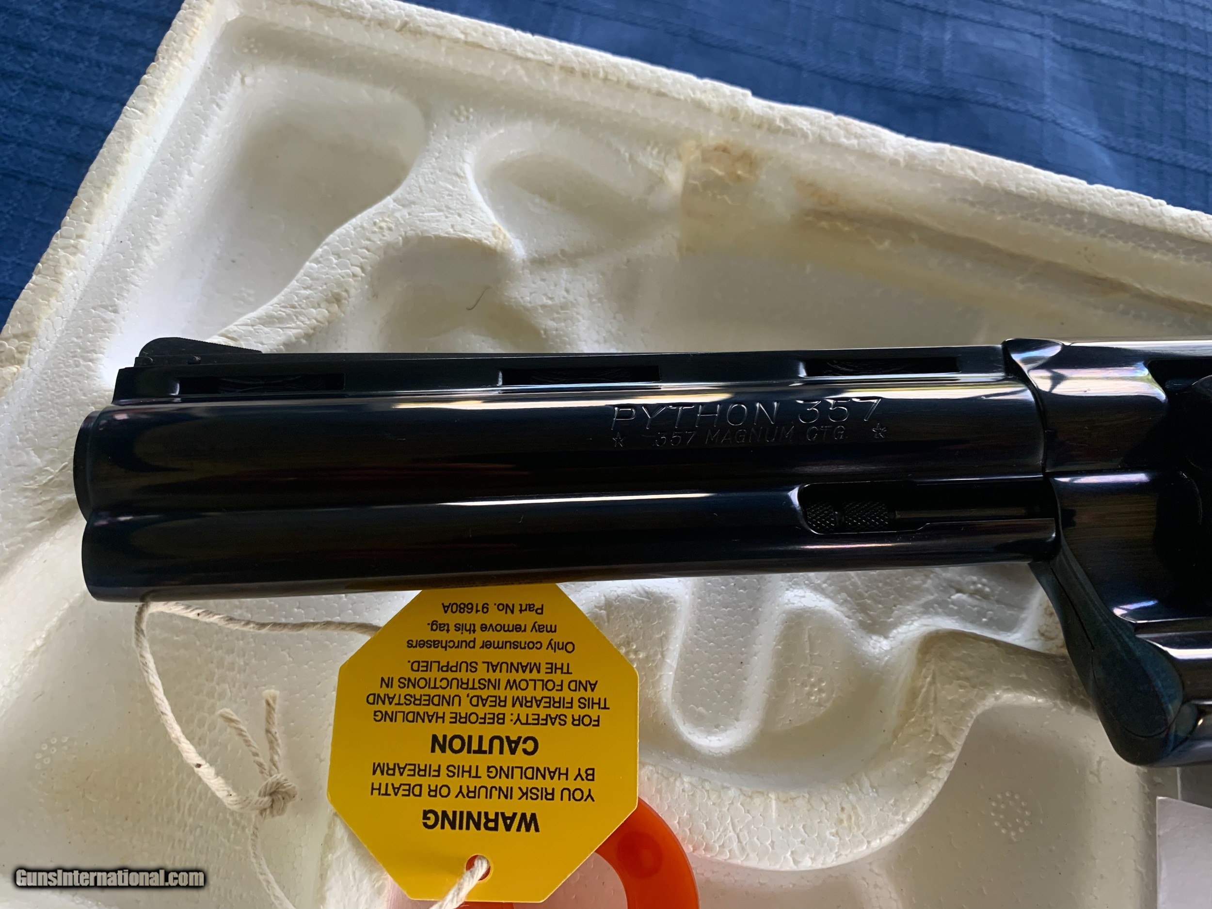 Description: Colt Python 6" Blue in Like New Original Condition! Serial number K76588 . Gun has all of its Bright Blue Factory Finish still remaining . Made in 1982 . SNAKE YEARS . These guns had that luster blue finish. Fun is perfect condition un-used. All the paper work was in a plastic zip lock bag . Paper work is in excellent condition. Box is a little ruff . Out side cover is banged up . One side is missing flap and it has scratches and handling marks . But it did protect the gun for all these years . The Gun is in Stunning original condition ! Please review my photos and please email me with any questions? 3 day inspection as allways. Thank you for looking Little Jo SOLD Handgun Caliber: .357 Magnum Manufacturer: Colt Model: Python Serial Number: K76588 Barrel Length: 6” Condition: Like new |