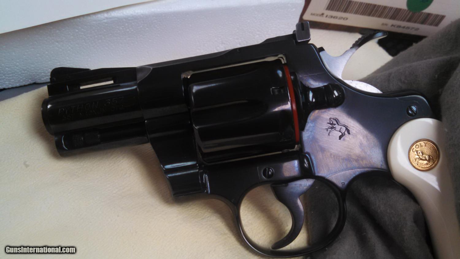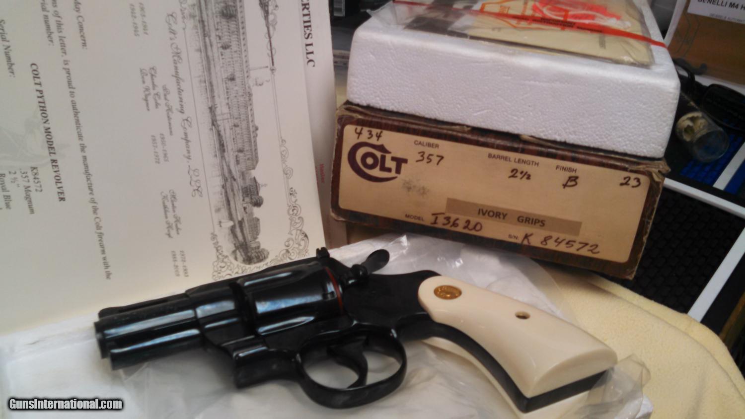Description: For your viewing an exceptional 100% new in the box Colt Python 2 1/2 inch with target sized ivory grips. This unmarked pristine example cannot be upgraded. I purchased this from the original owner who bought it in 1984 and kept it oiled and in a safe until he sold it to me. I know it's a familiar story but this one I believe to be true. Collector quality example!! Included is the original Colt box paperwork and matching label . Comes with the Colt archive letter proving the provenance a must have in todays market. Our exclusive guaranty is we pay all shipping if you don't agree with our evaluation!! SOLD |