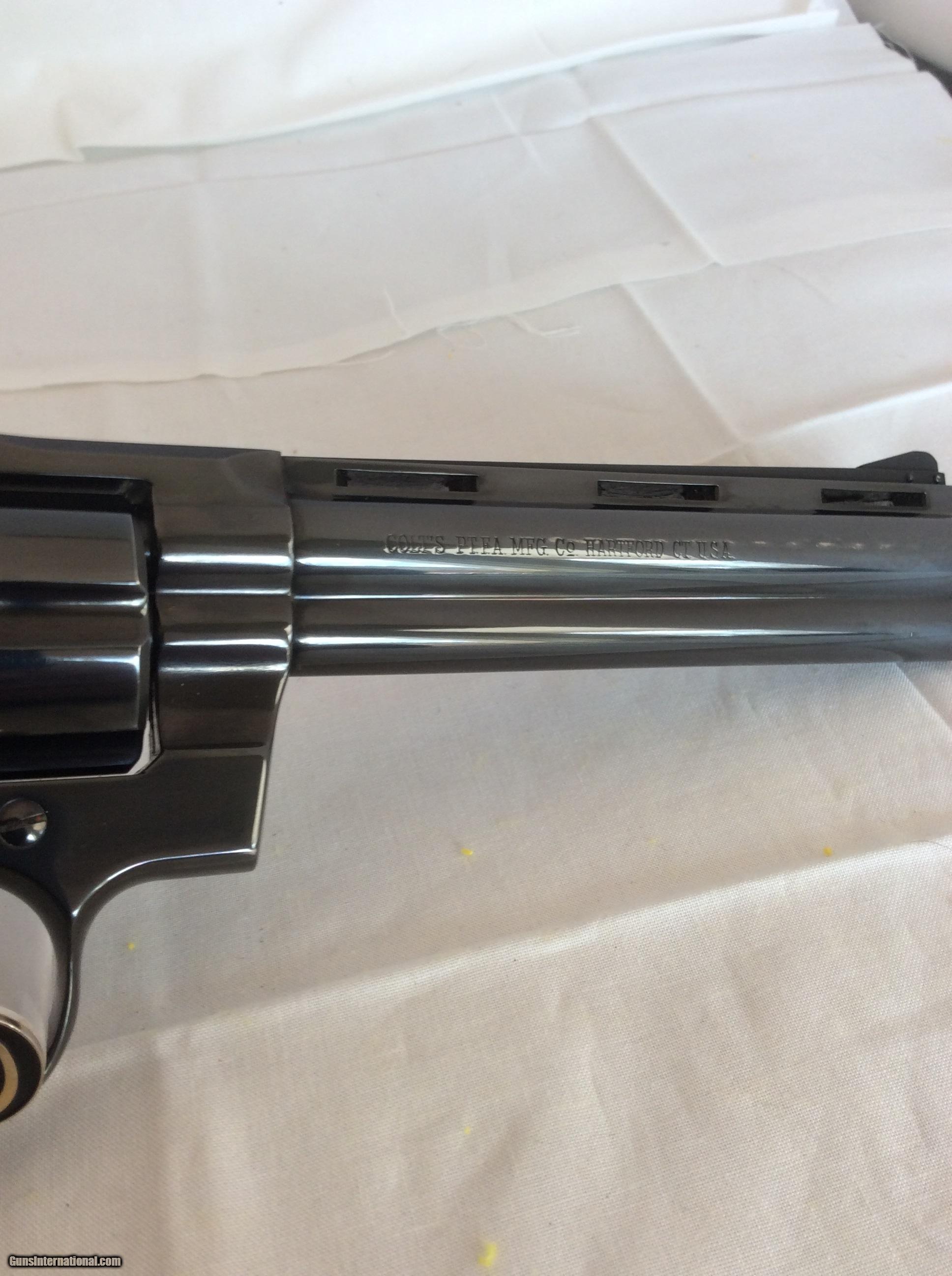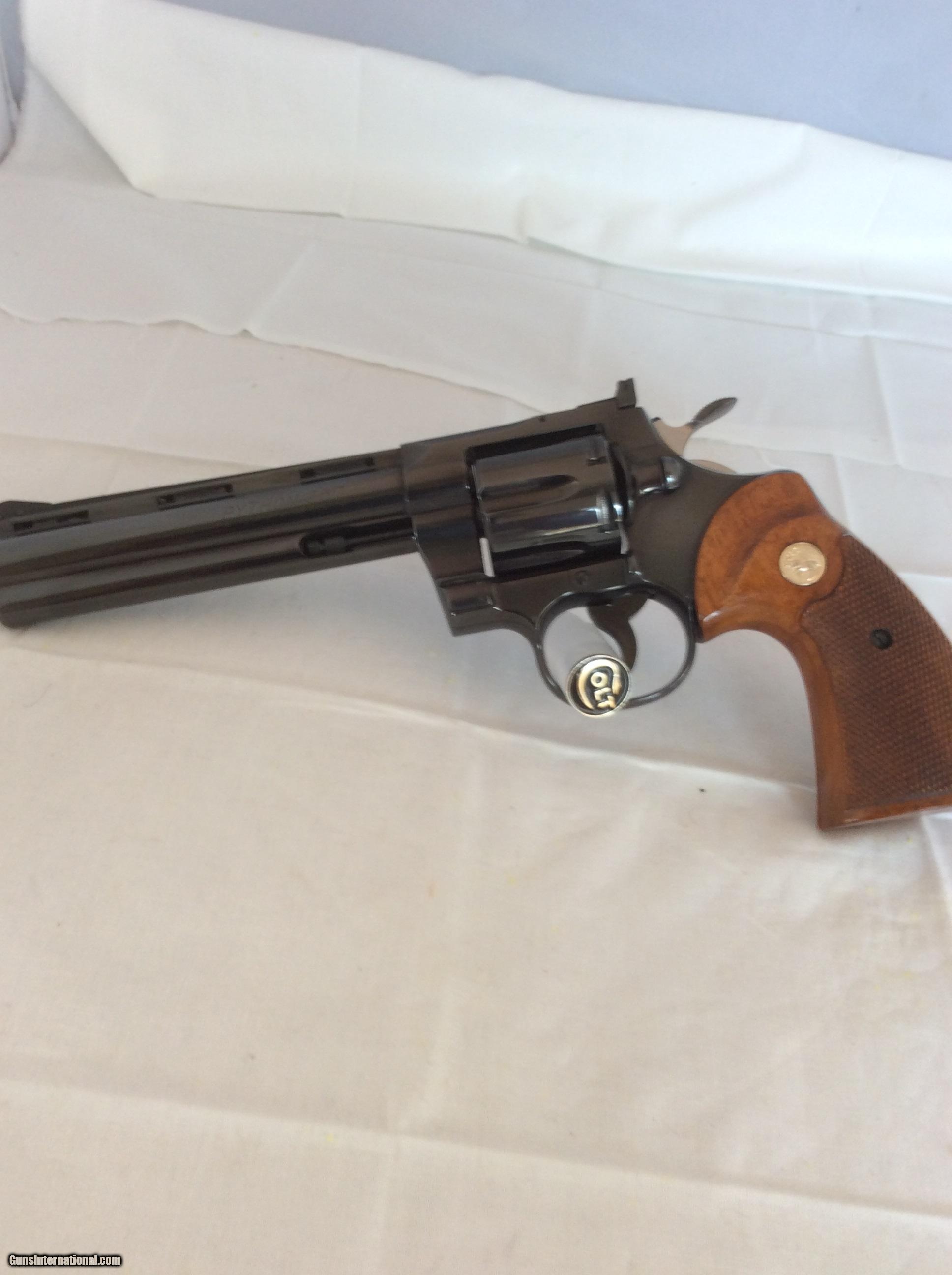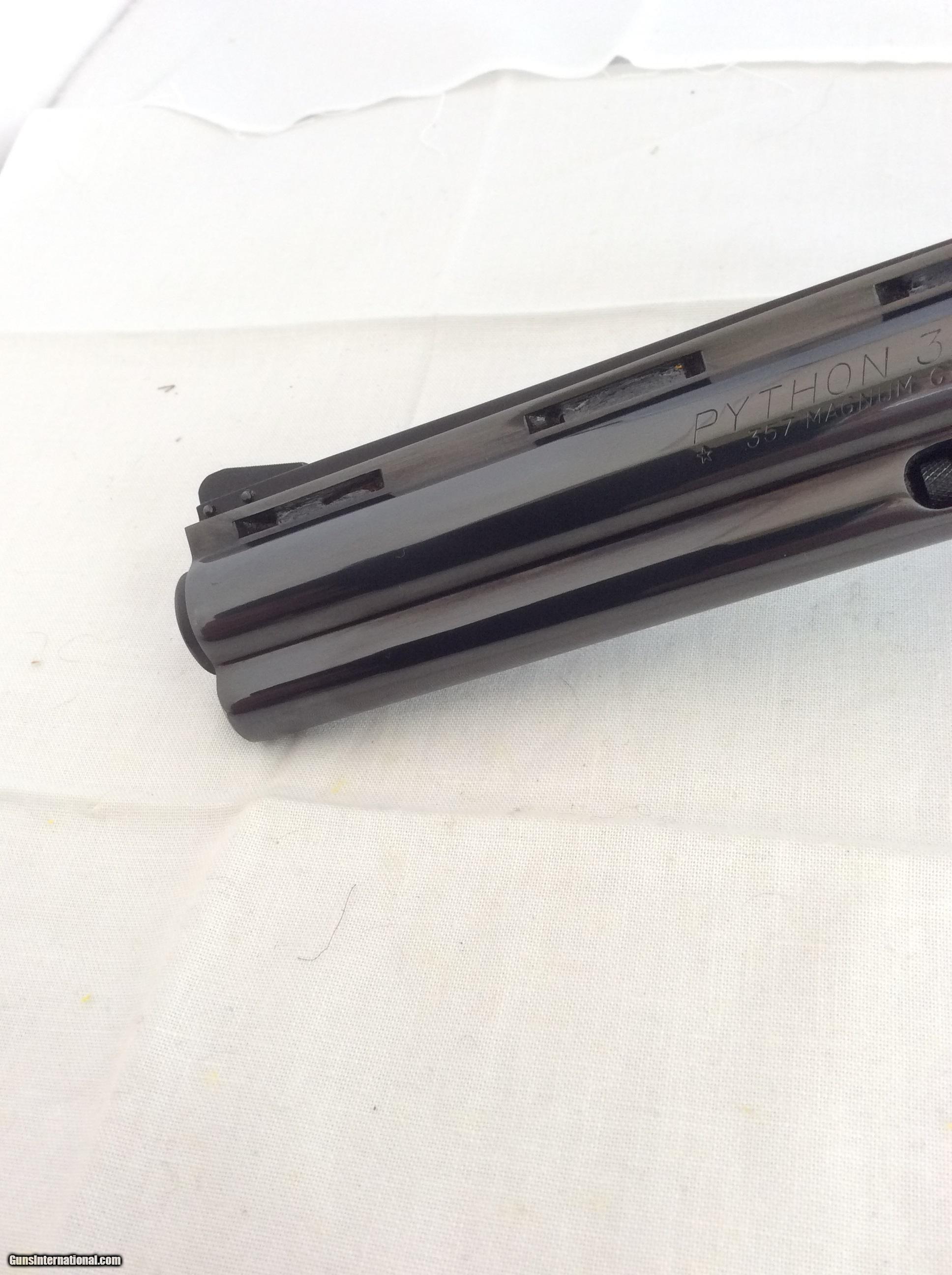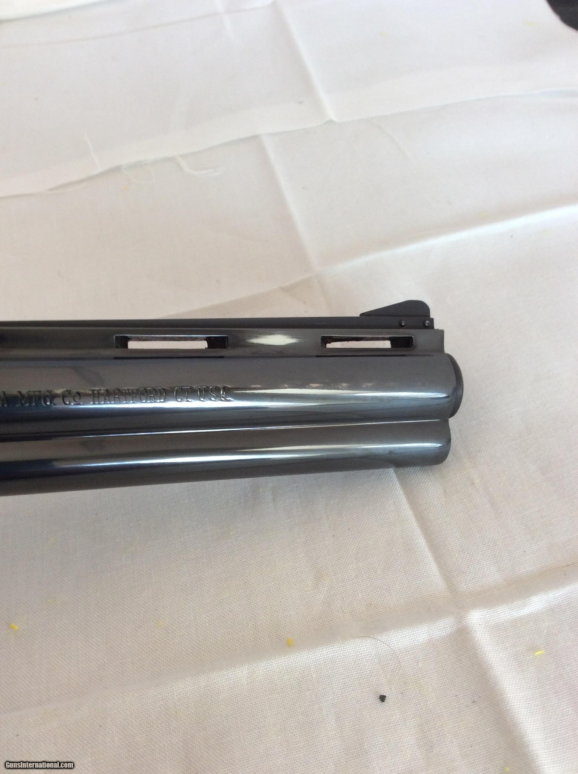 Description: Colt Python 6” Royal Blue. This one is from the 70’s SN E22474 if you would like to look it up. A very nice example with a rich Royal Blue finish. I would rate it 99% except for a thin line along the right side of the barrel where there is slight bluing loss. You can make it out in the pictures but other than that this one is nice and tight and barely fired. The turn line is almost nonexistent. It comes in the original Colt box, serialized by factory and includes the Colt screw driver, safe handling instructions and warranty card. The top of the box has three torn corners but otherwise in decent shape. FFL to FFL transfer, Ships free. Any kind of checks work and we also accept credit cards with a 3% surcharge. Please check out my other listings. Visit us at SOLD Manufacturer: Colt Model: Python Caliber Info: .357 Mag Condition: VG-EX Metal Condition: VG-EX Wood Condition: VG-EX Bore Condition: VG-EX |