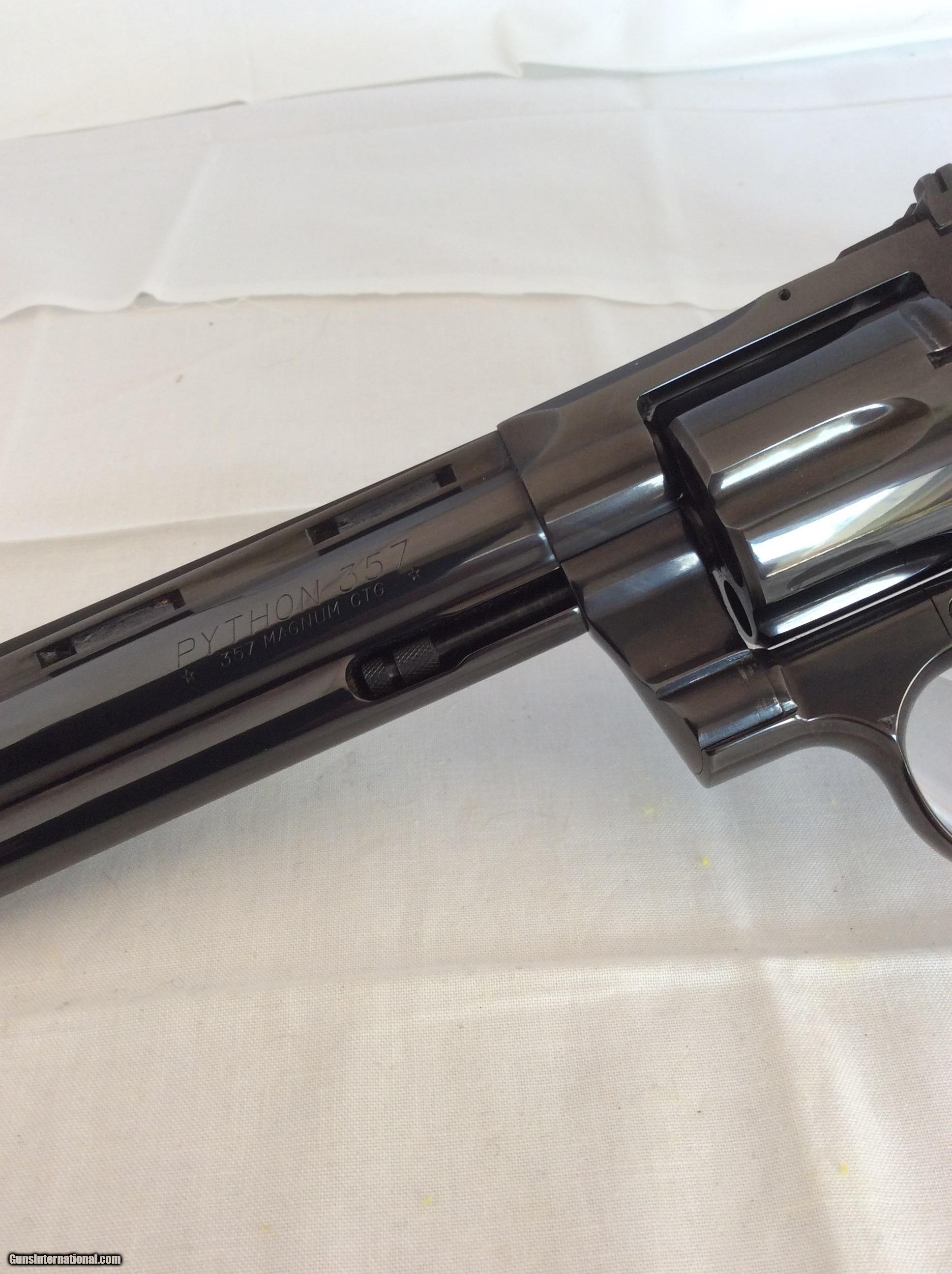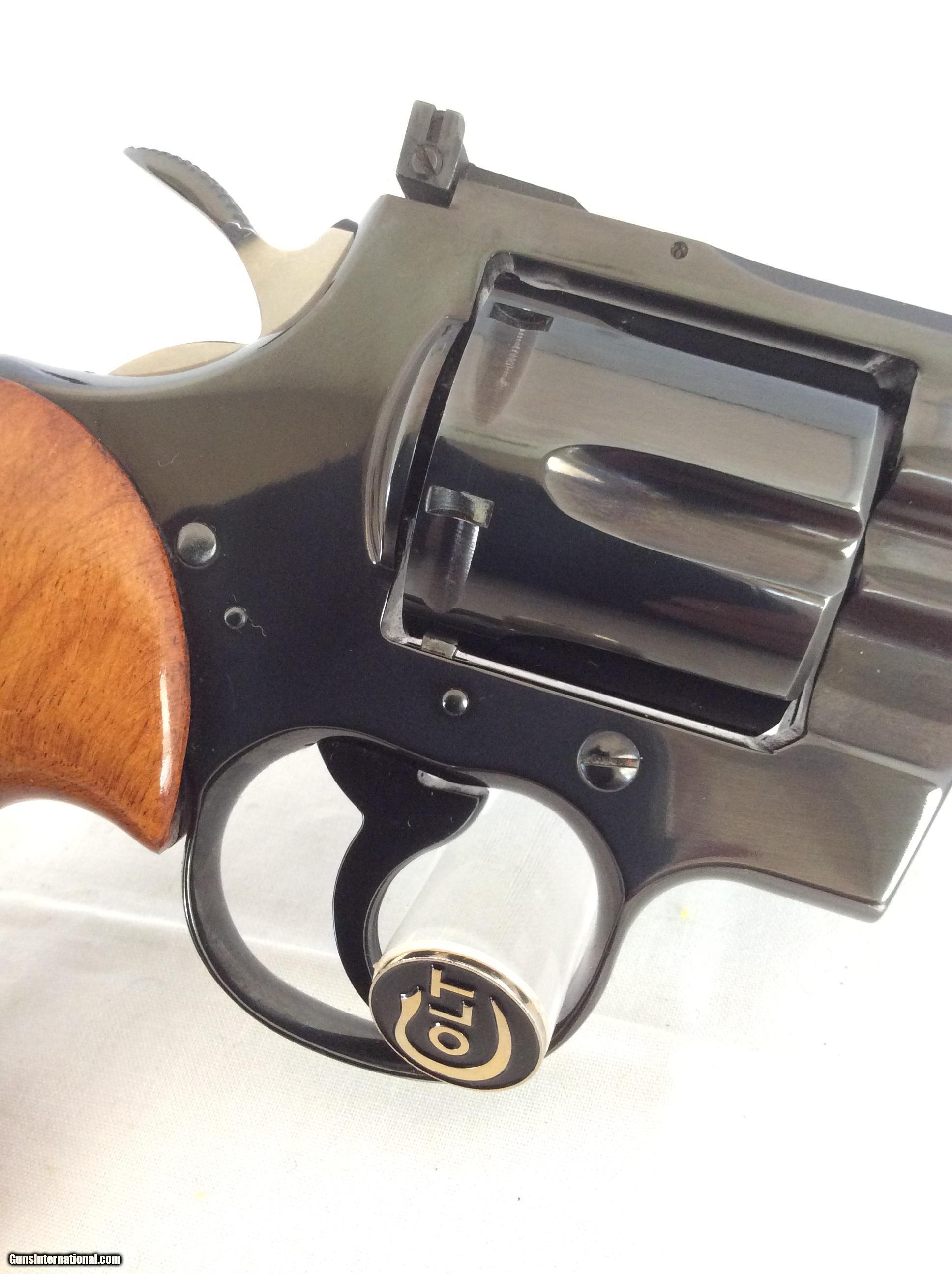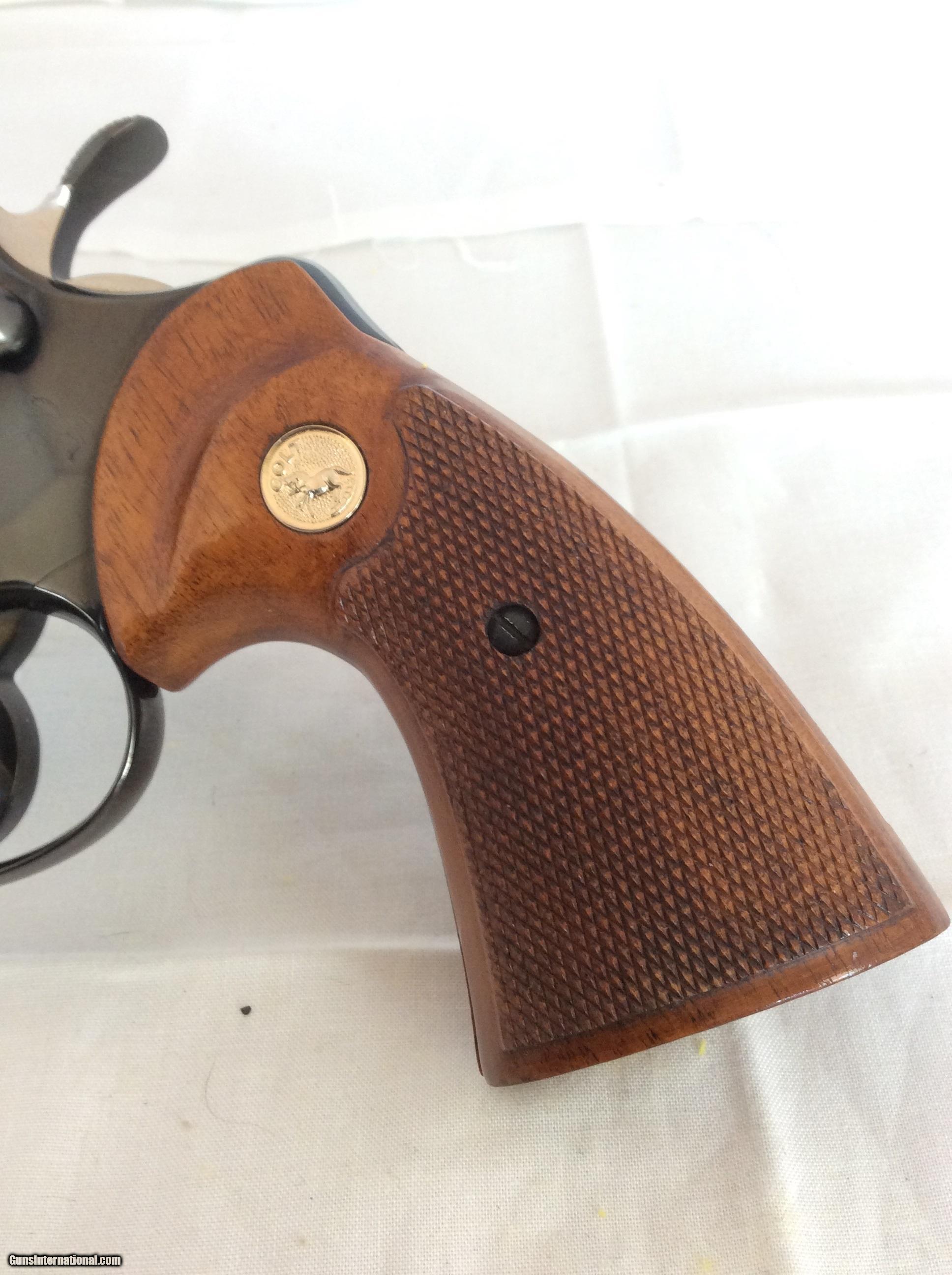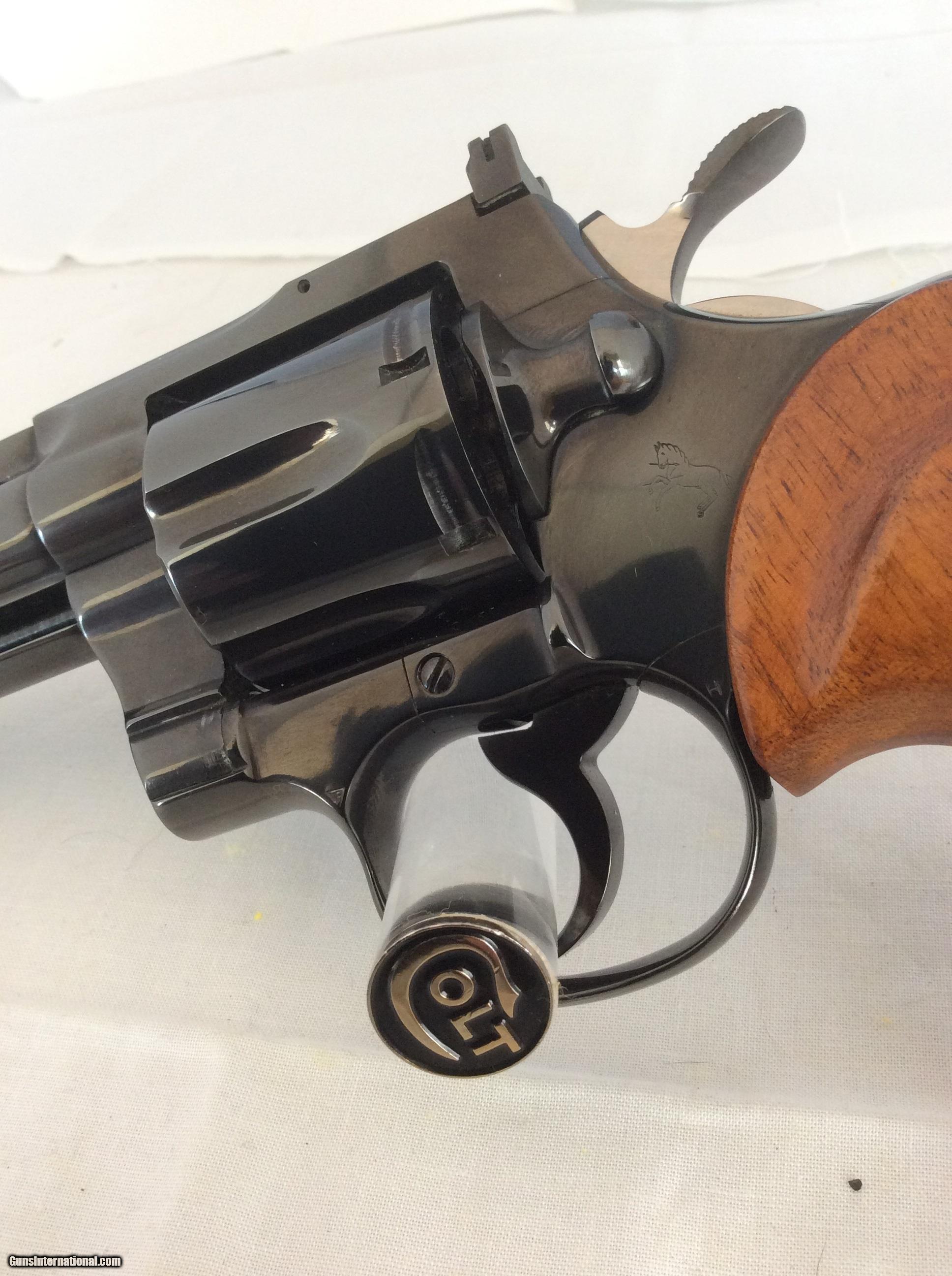 Description: Colt Python 6” Royal Blue. This one is from the 70’s SN E22474 if you would like to look it up. A very nice example with a rich Royal Blue finish. I would rate it 99% except for a thin line along the right side of the barrel where there is slight bluing loss. You can make it out in the pictures but other than that this one is nice and tight and barely fired. The turn line is almost nonexistent. It comes in the original Colt box, serialized by factory and includes the Colt screw driver, safe handling instructions and warranty card. The top of the box has three torn corners but otherwise in decent shape. FFL to FFL transfer, Ships free. Any kind of checks work and we also accept credit cards with a 3% surcharge. Please check out my other listings. Visit us at SOLD Manufacturer: Colt Model: Python Caliber Info: .357 Mag Condition: VG-EX Metal Condition: VG-EX Wood Condition: VG-EX Bore Condition: VG-EX |
