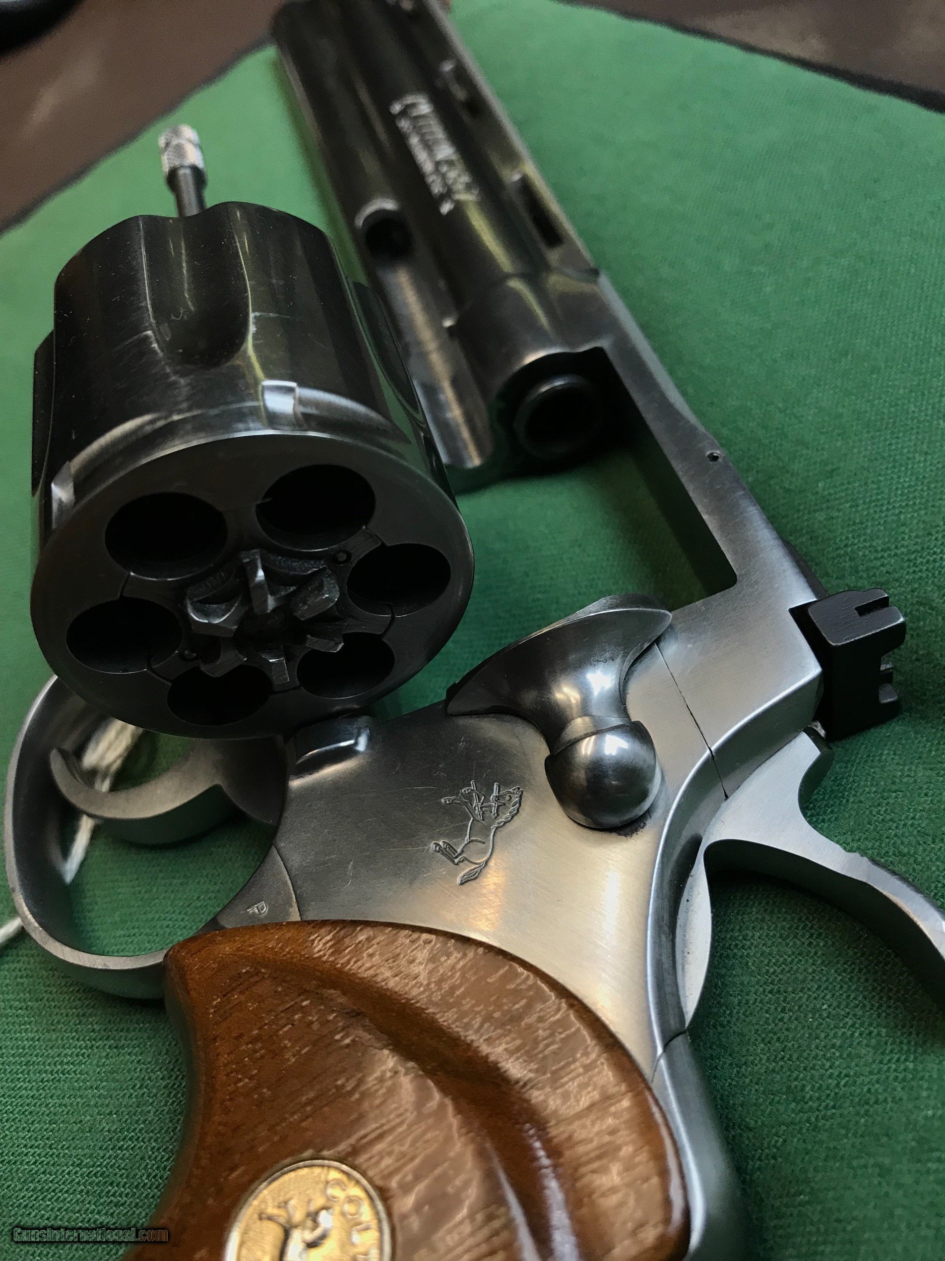 Description: COLT PYTHON,6" stainless with box and papers,acquired from original owner,shot very little with lite turn ring from loose side plate,still very nice. SOLD Manufacturer: COLT Model: PYTHON Serial Number: T19441 |